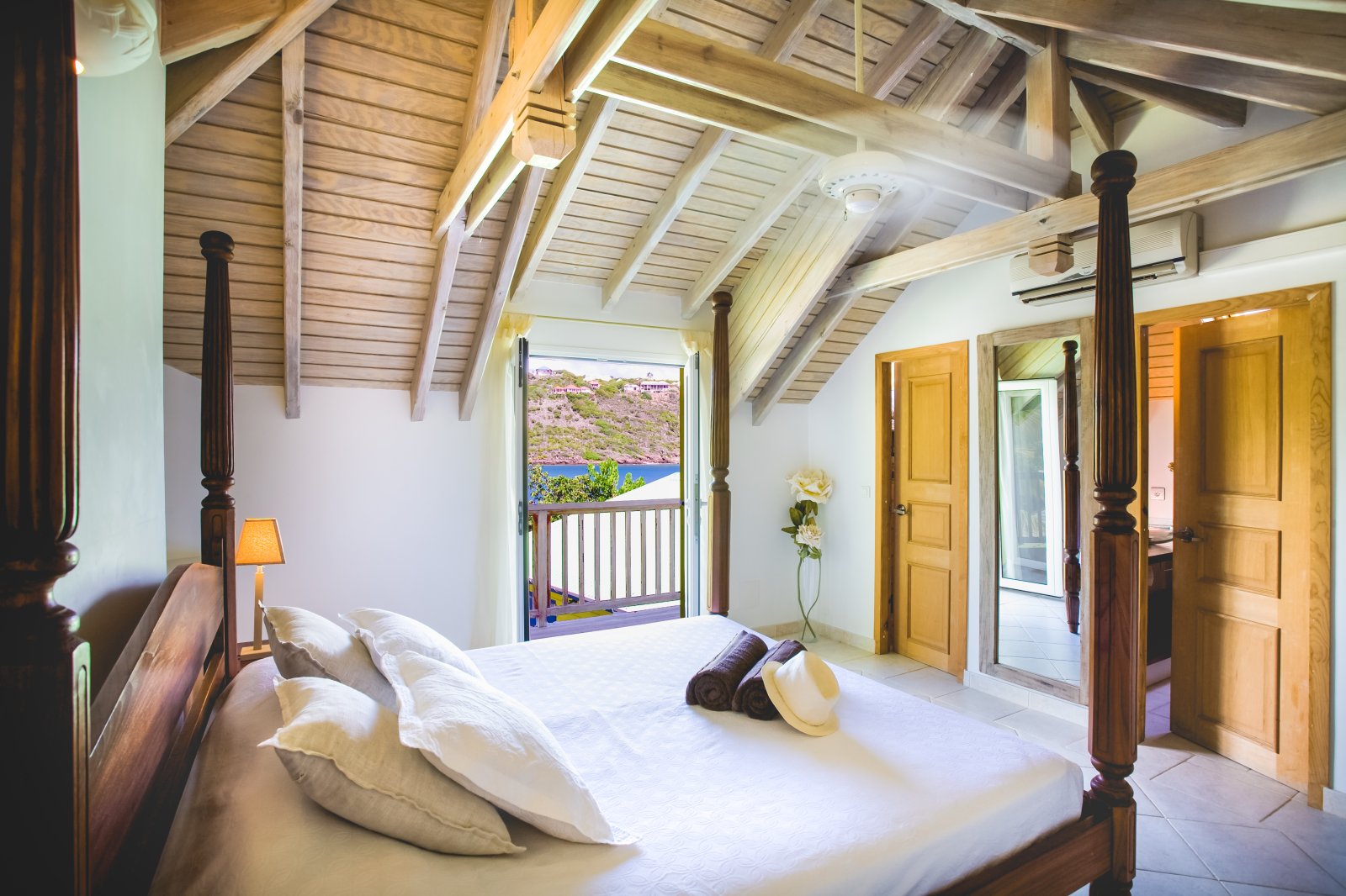 From the split level deck of this St. Barts Villa a wide wooden staircase leads down to the white sand beach and the cool azure blue waters of Marigot Bay. Palm trees spread their fronds to provide shade and are hung with hammocks, perfect for an afternoon nap or just to enjoy the view of the bay. Beach chairs line the sand for sun worshipers or for reading the latest thriller as you relax in the Caribbean sun.