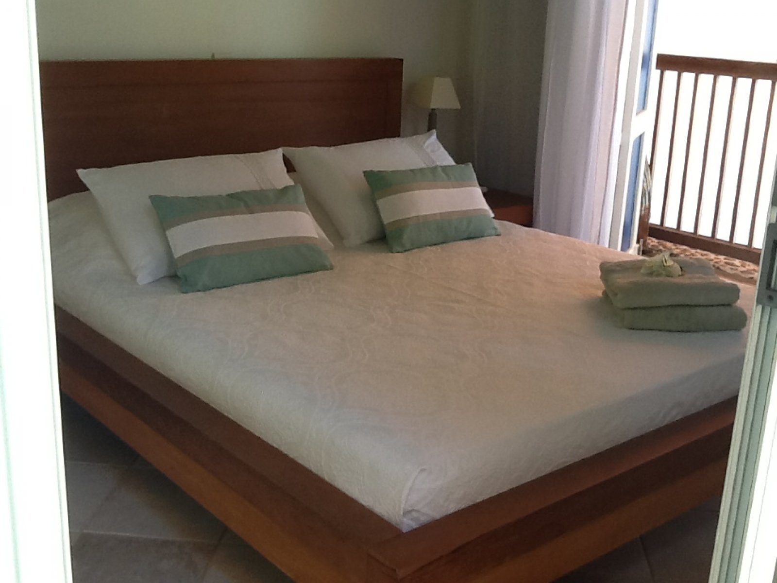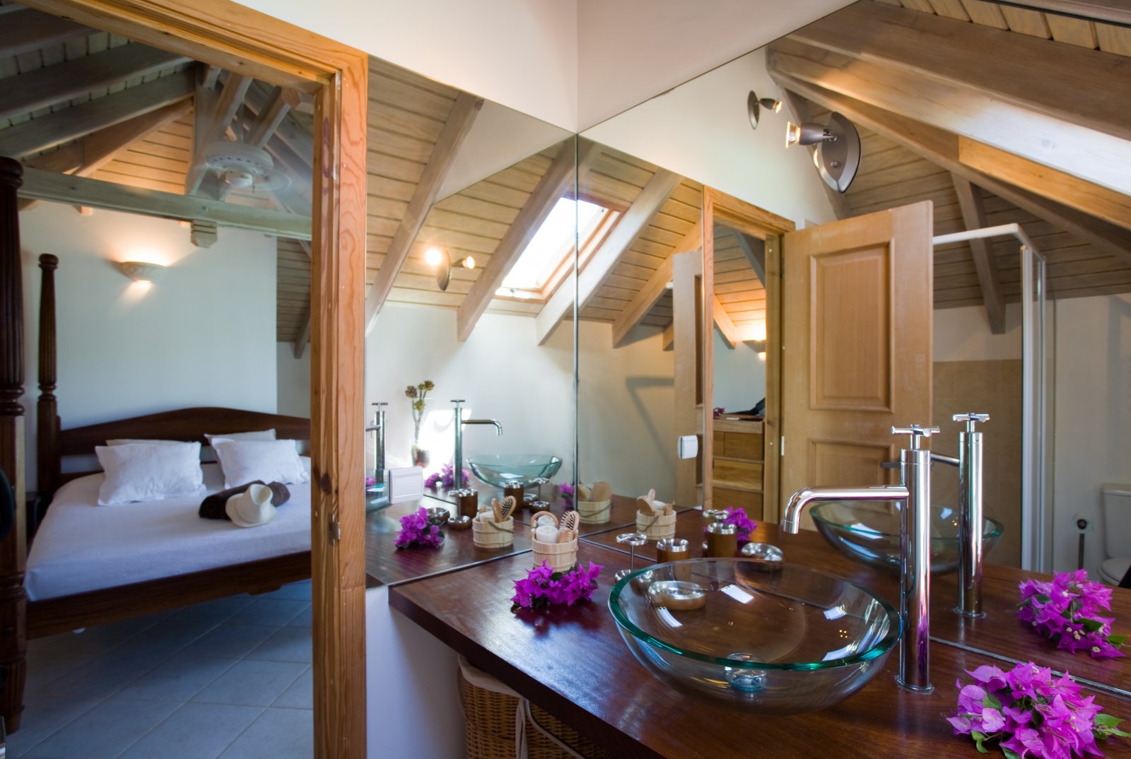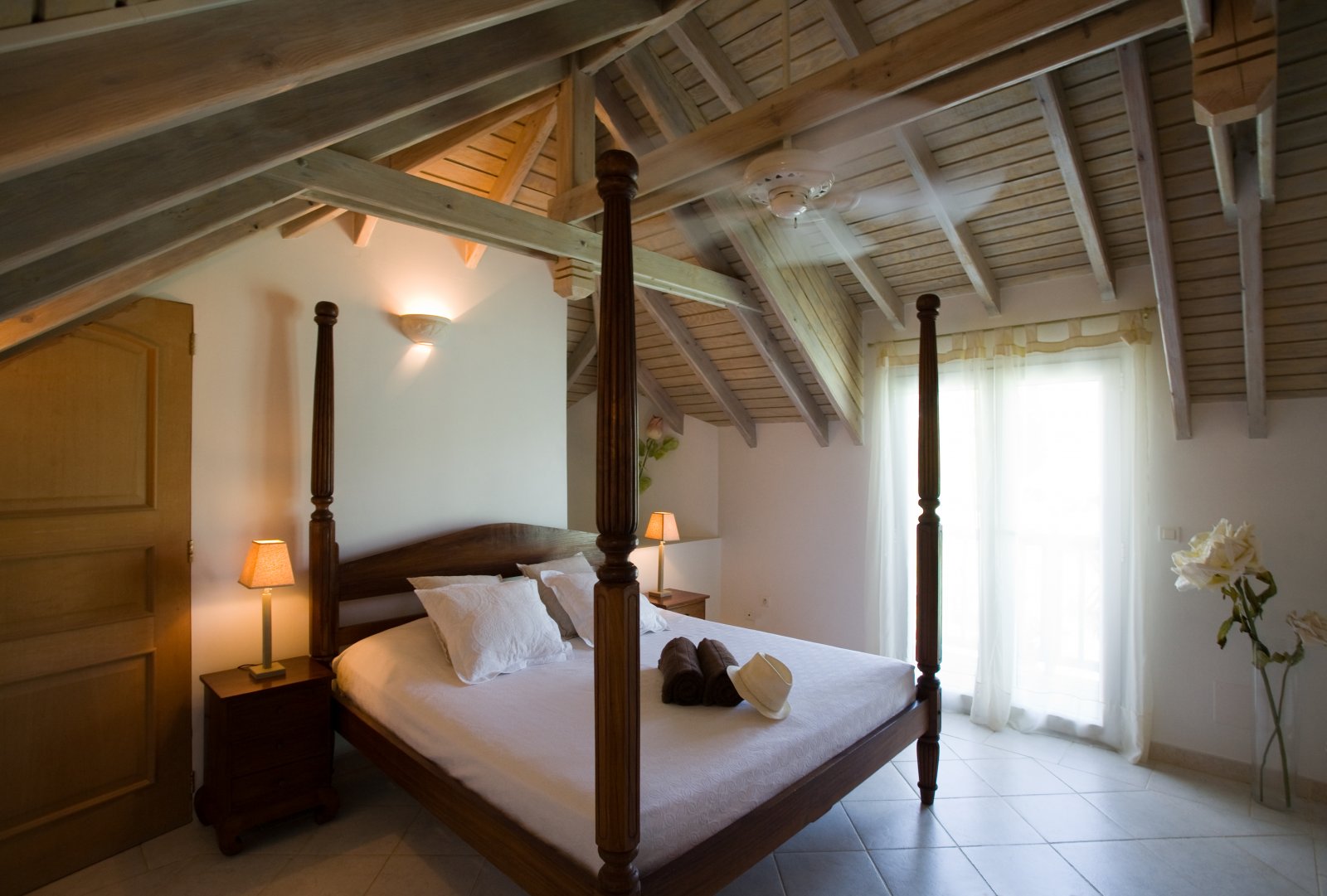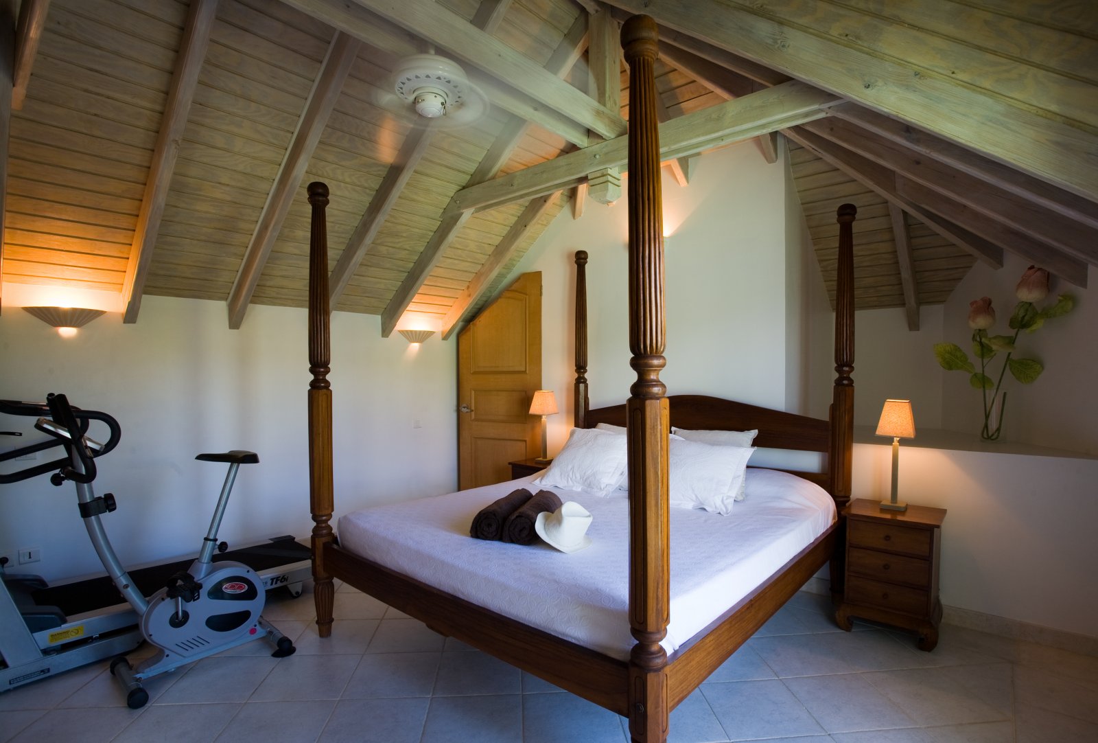 From the living room a wooden staircase leads up to the main bedroom where a Euro King Bed awaits under a cooling ceiling fan. There is an ocean view from the private terrace and an en-suite bathroom with a rain shower that allows you privacy and convenience. For entertainment the room is complete with an HDTV, canal satellite and dish network.