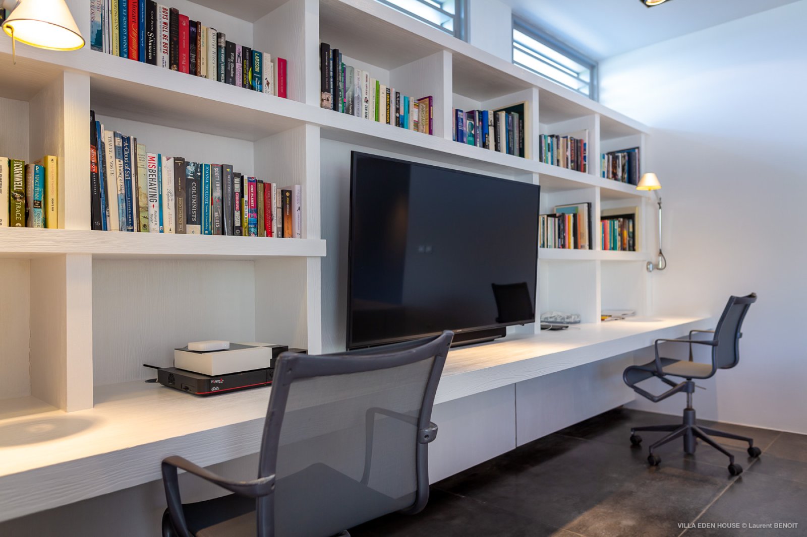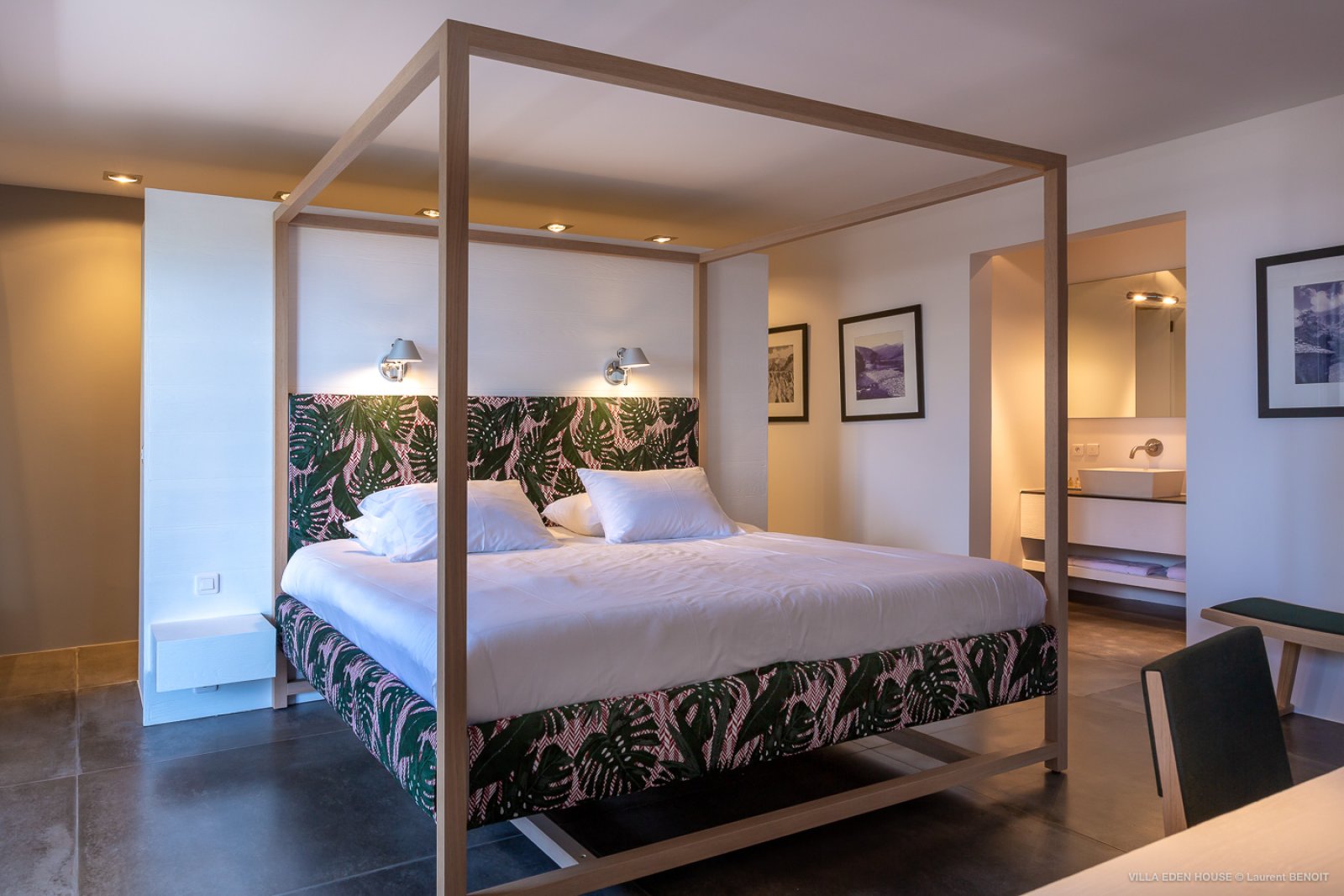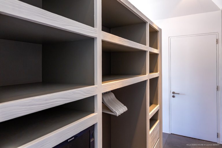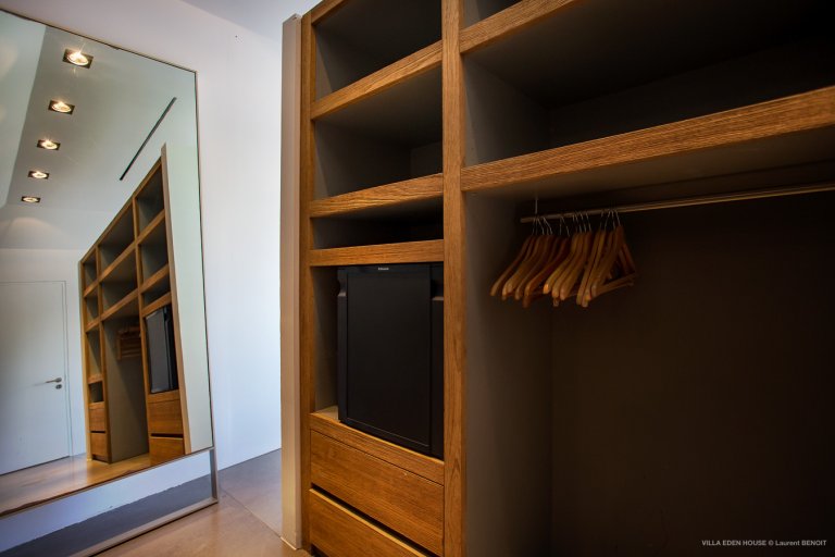 At a first glance, this villa seems relatively austere with its grey rendered concrete; however, gradually notes of incredible joviality are progressively revealed. Vivid, lively, acidulous and fresh colors in the three bedrooms which are designed identically, but each with their own distinct hue. The bedroom furniture is a reference in the field of design: MDF Italia beds, Artemide lamps and linens from the collections of Valerie Barkowski and Mia Zia. A remarkable alchemy and contemporary timeless elegance.