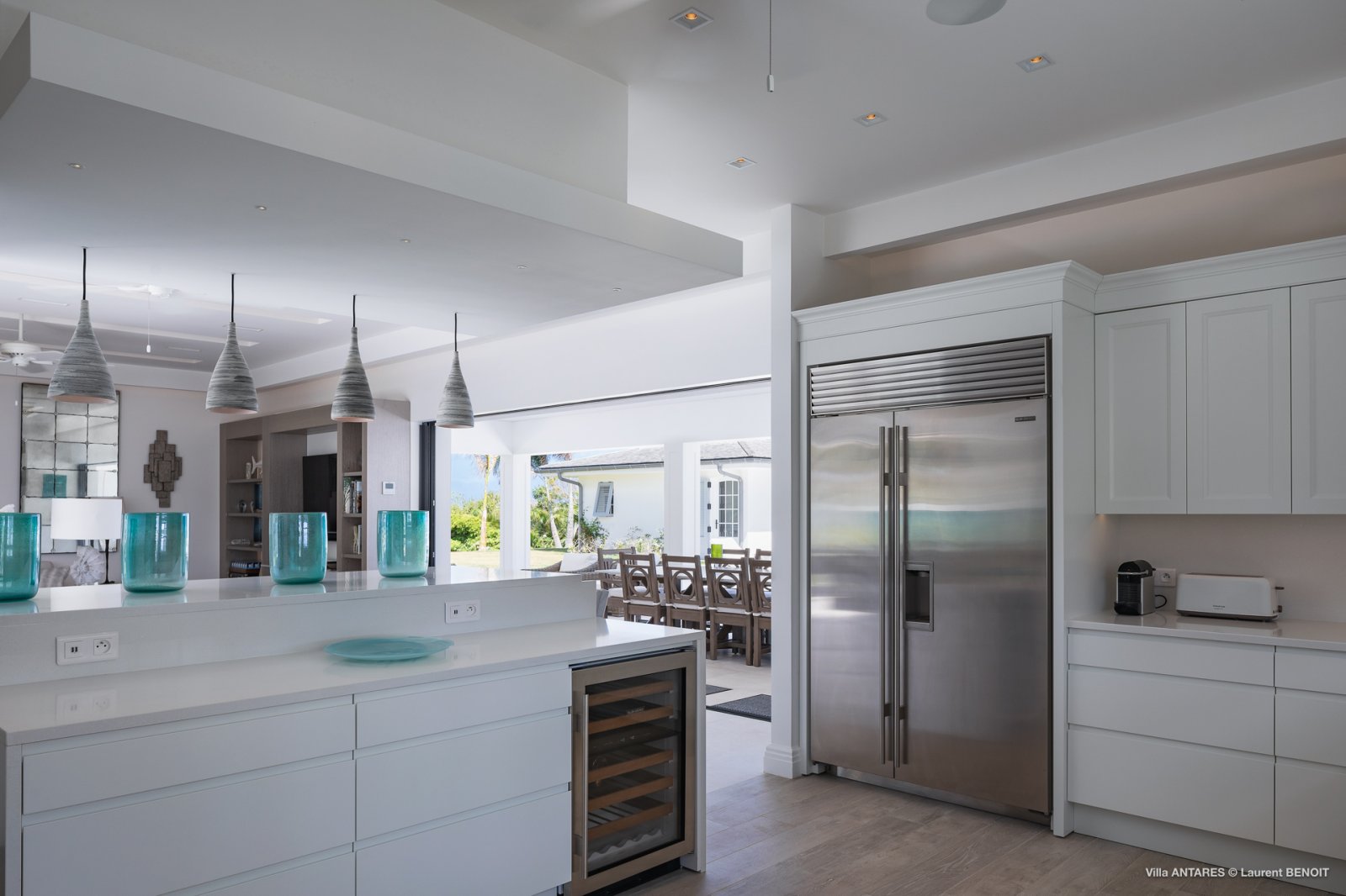 Decorated in natural tones, the living area is open to the luxurious kitchen, which has every modern appliance and a breakfast bar. In front of these spaces, there are two wonderful dining pavilions, which are perfect for entertaining or for simply enjoying the marvelous views over the ocean.