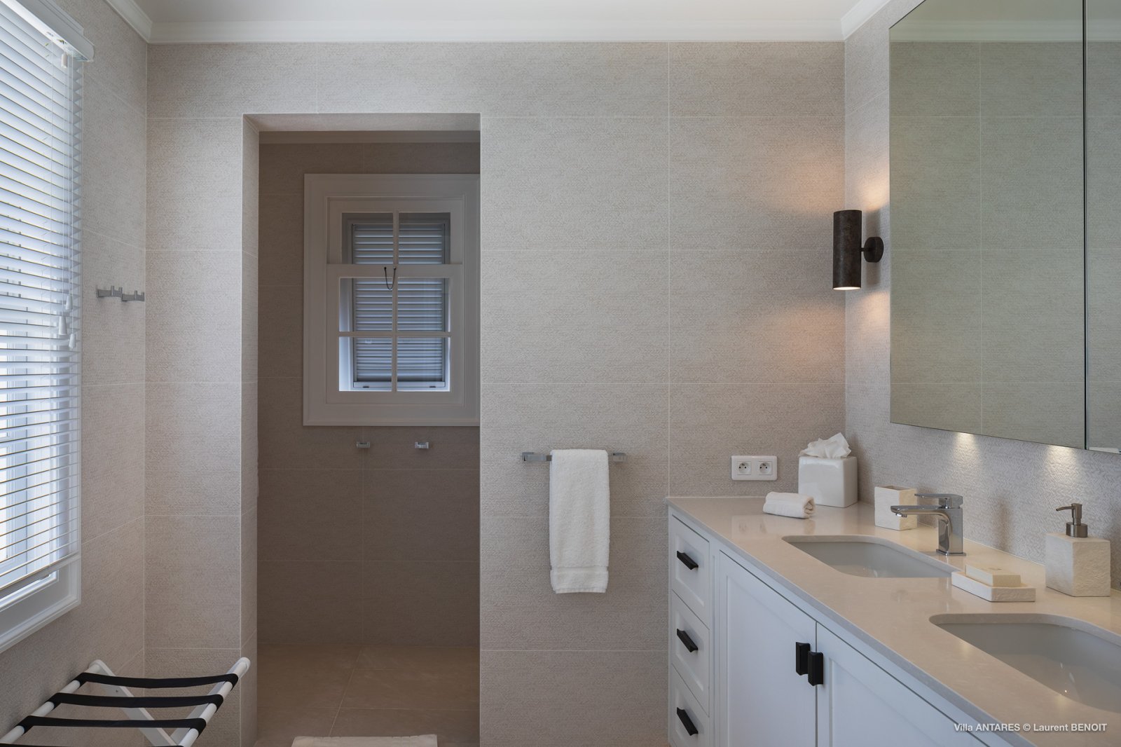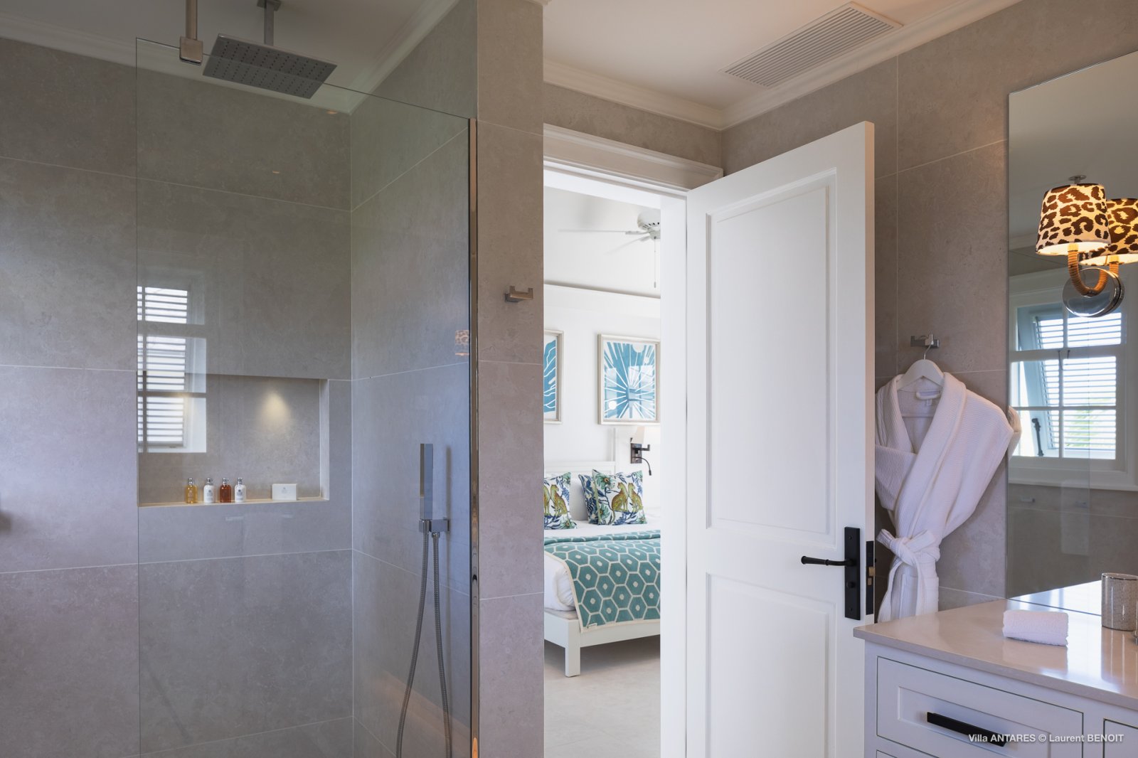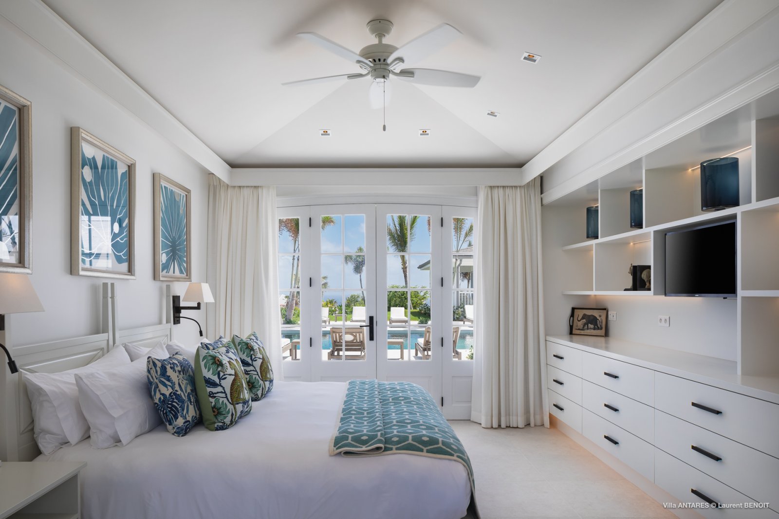 The master bedroom is very private, on its own side of the pool with a wrap-around covered terrace with lovely white wicker furniture and a swing seat, with views out to sea and the surrounding gardens. The four other beautifully decorated double bedrooms each have a king-size bed and an ensuite bathroom, making Villa Antares a perfect place for four couples.