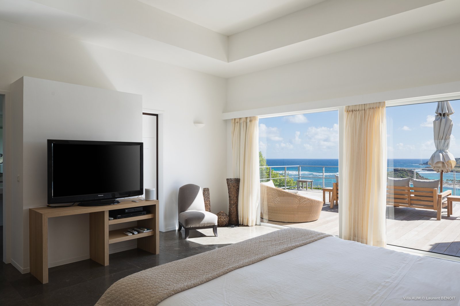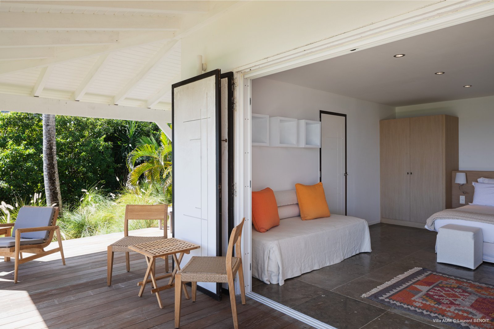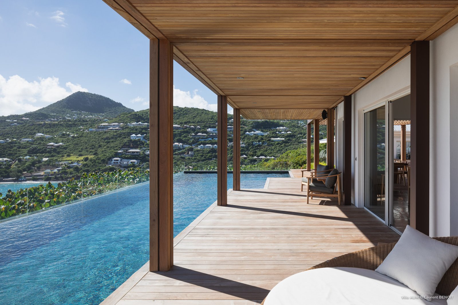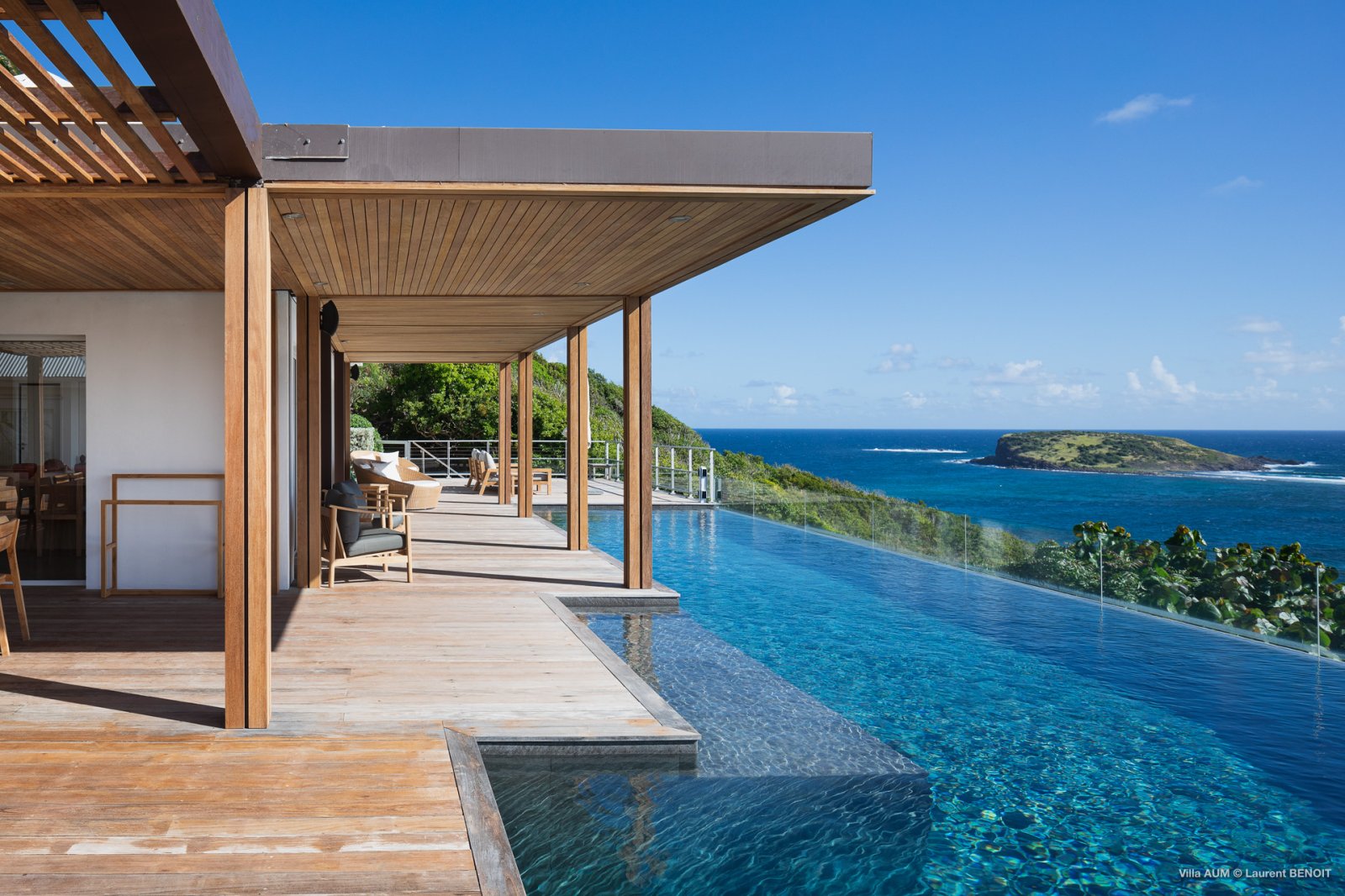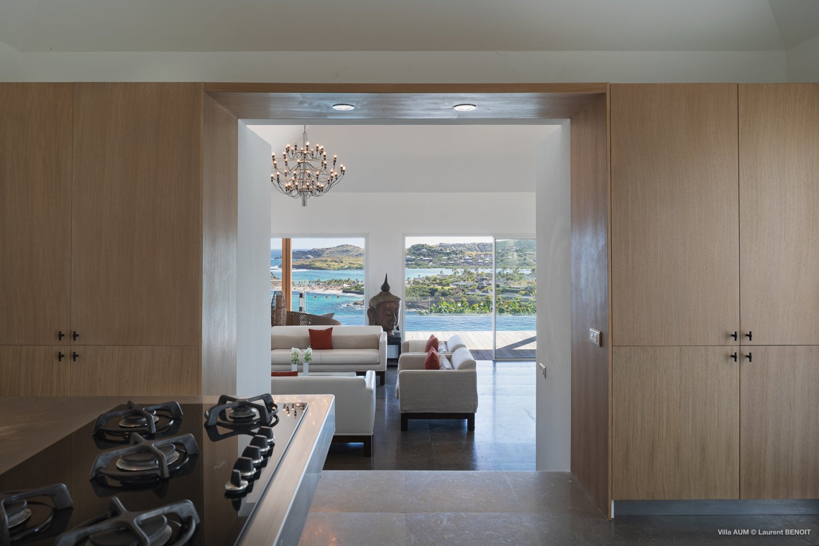 Step through the entrance to Villa AUM and you are greeted by pleasing expanses of green grass adjacent to a broad deck overlooking Marigot Bay and the vast blue of the Atlantic Ocean beyond. Located in the private, gated community of Mont Jean, Villa AUM offers its guests the perfect combination of exclusivity and ease. Just minutes from Saline Beach and the village of Lorient, AUM is convenient and yet blissfully secluded.