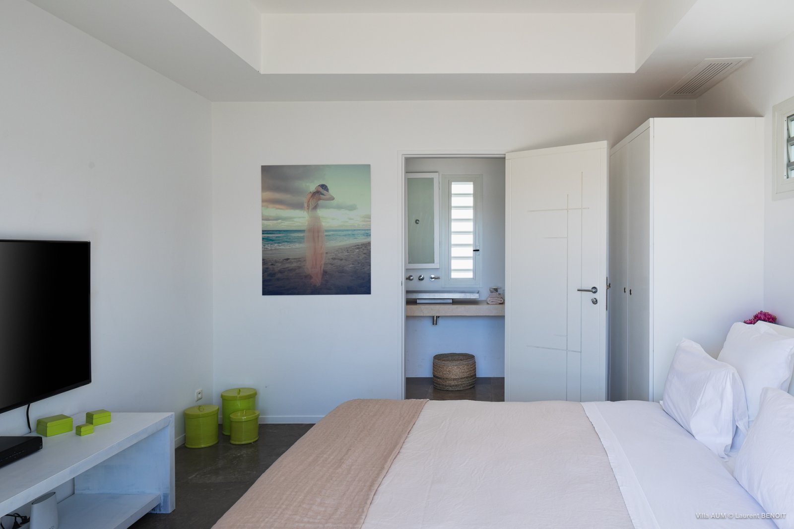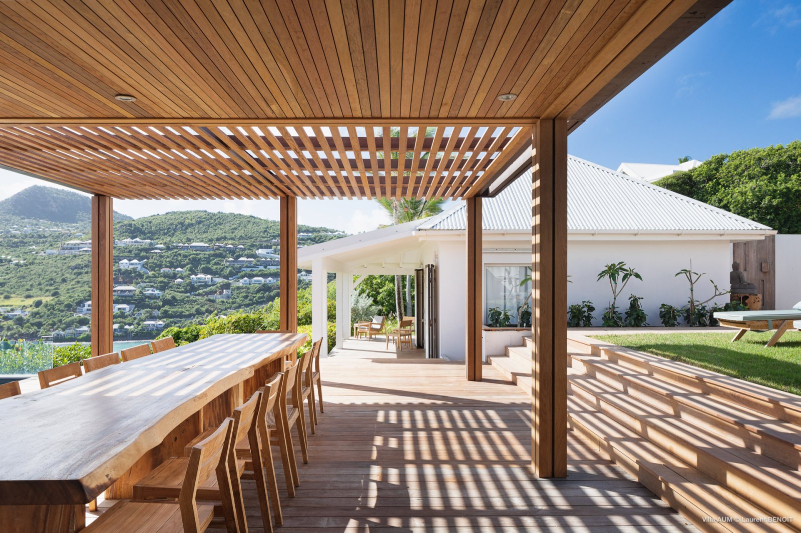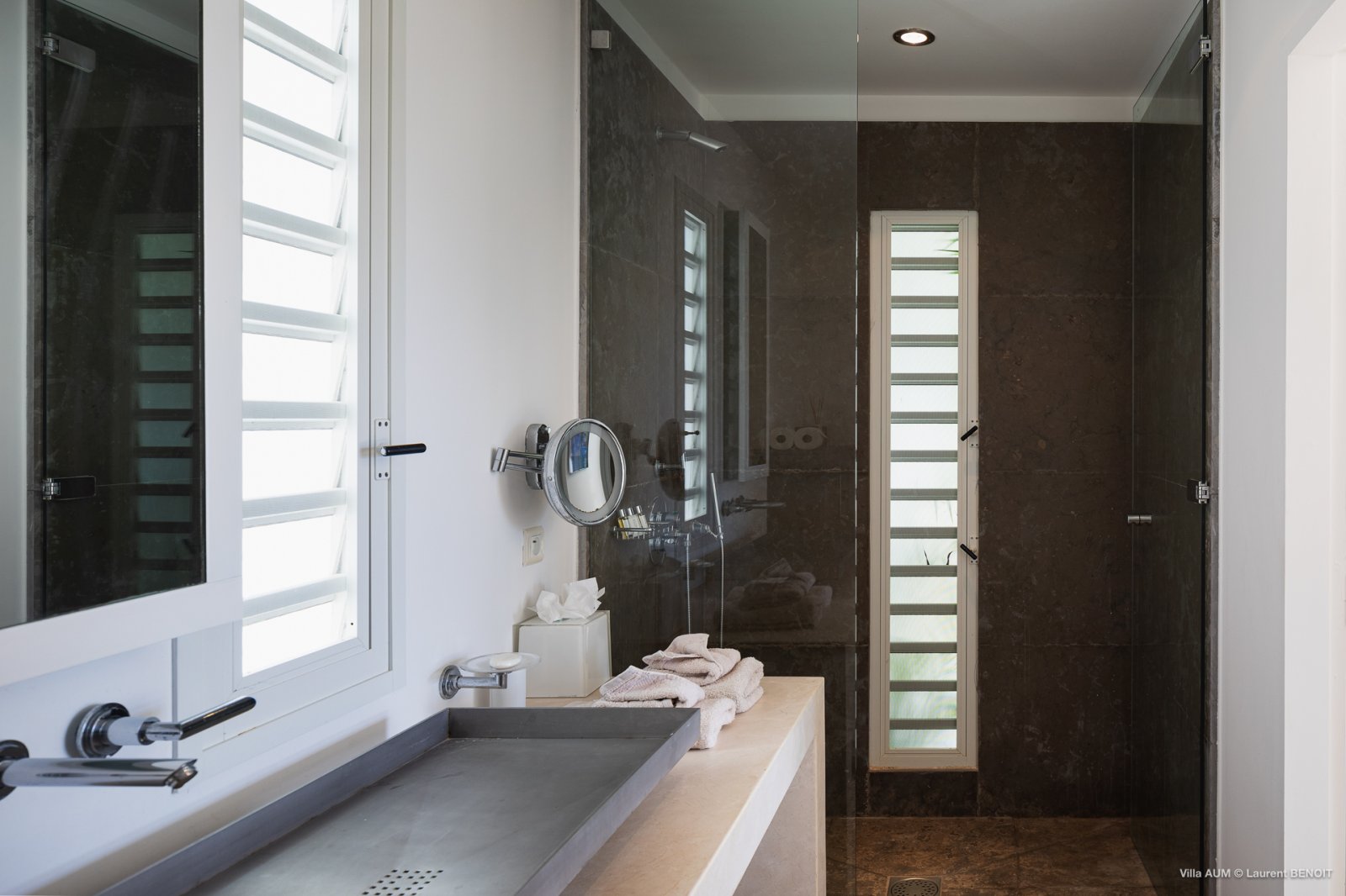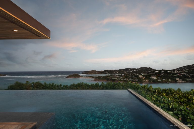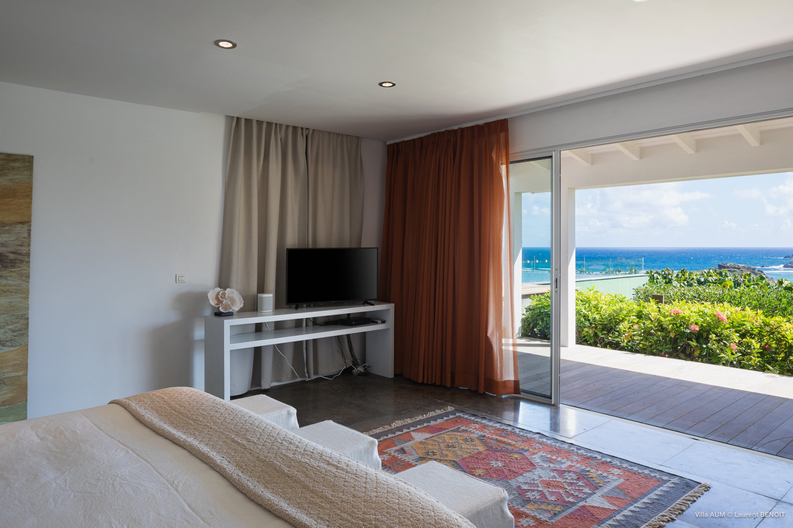 Step through the entrance to Villa AUM and you are greeted by pleasing expanses of green grass adjacent to a broad deck overlooking Marigot Bay and the vast blue of the Atlantic Ocean beyond. Located in the private, gated community of Mont Jean, Villa AUM offers its guests the perfect combination of exclusivity and ease. Just minutes from Saline Beach and the village of Lorient, AUM is convenient and yet blissfully secluded.