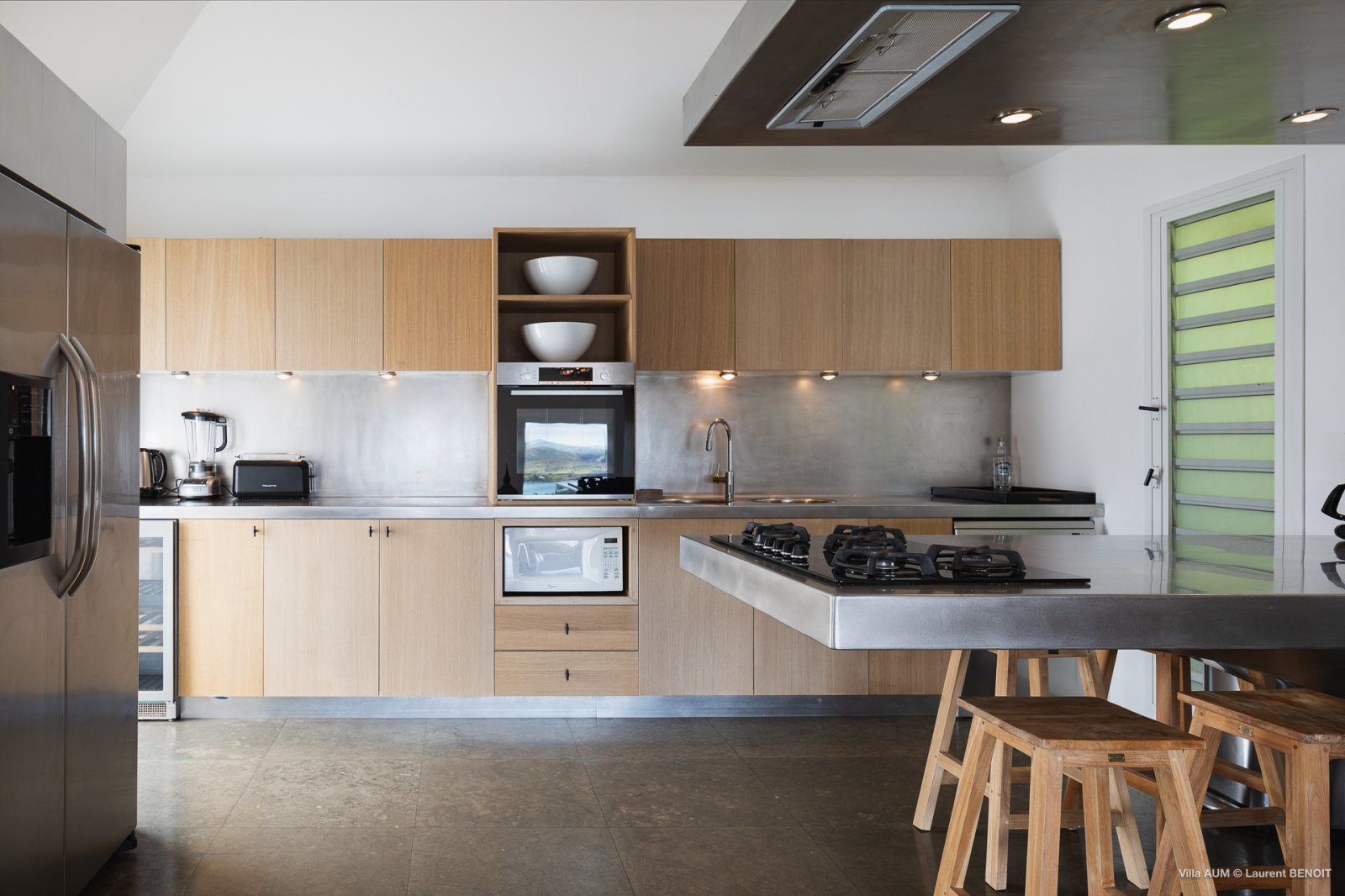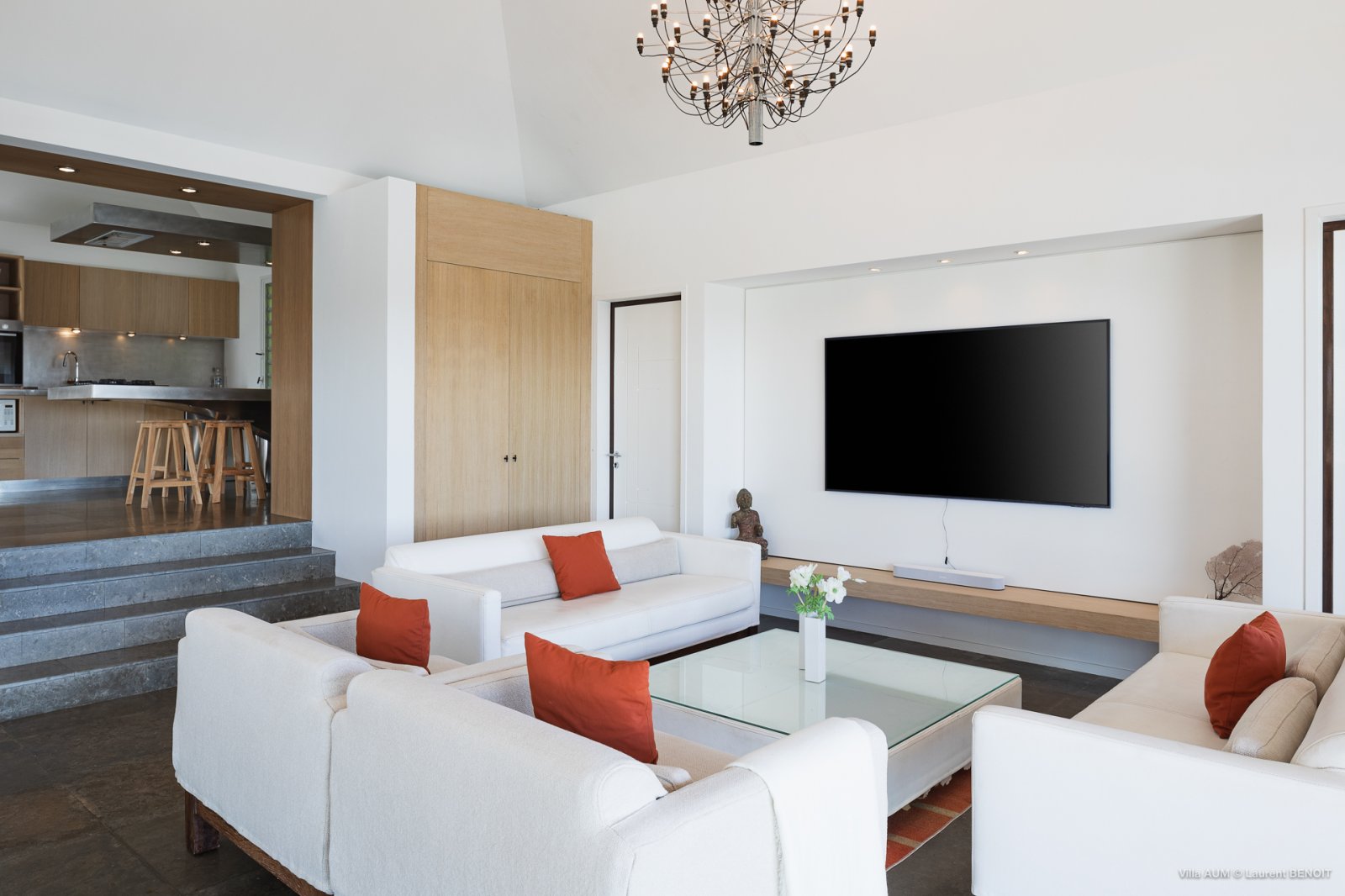 Designed with forethought and attention to detail, Villa AUM exemplifies chic comfort and clean lines, all accentuated by commissioned art from various artists and Asian decorative works. The kitchen is a high-tech masterpiece: a dramatic steel "floating" island holds the gas range-top, and plentiful counter space surrounds gourmet touches such as dual sinks and a Leibherr wine-storage unit.