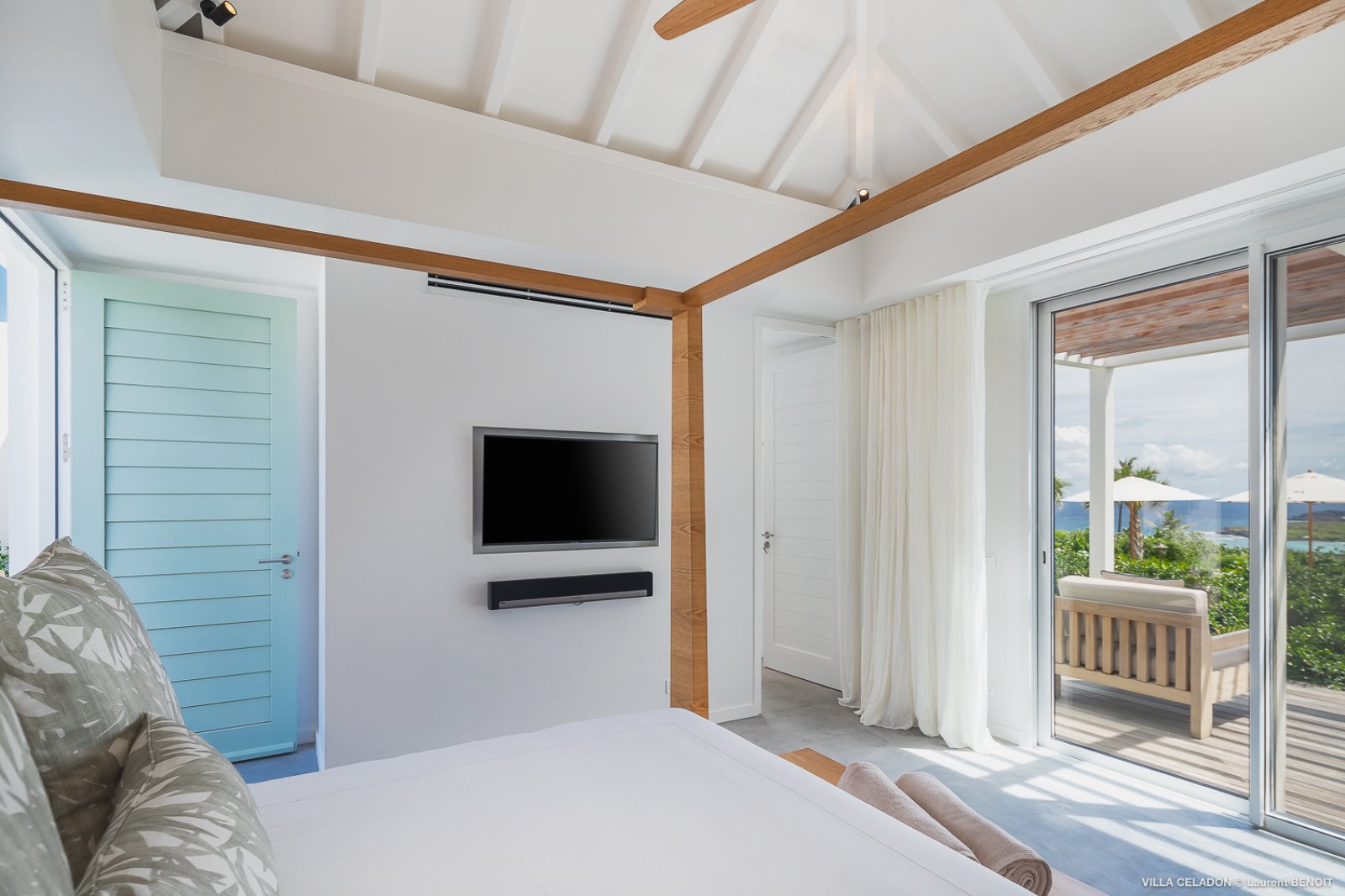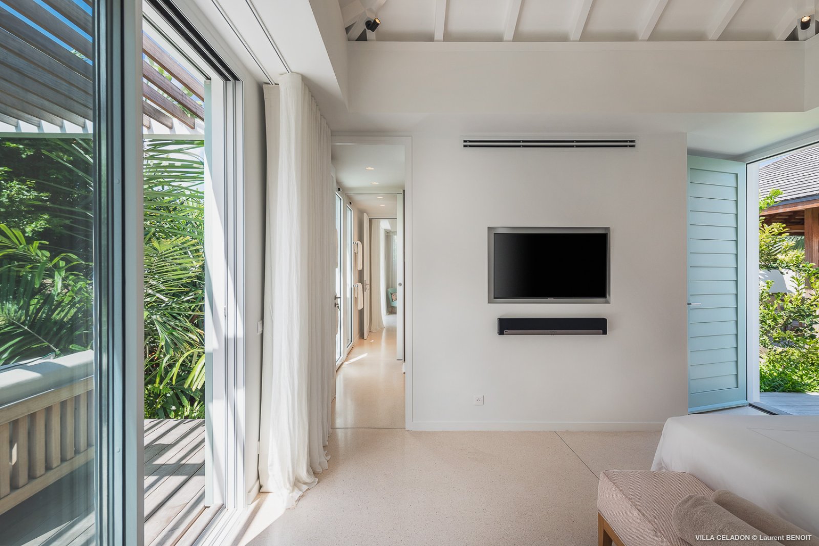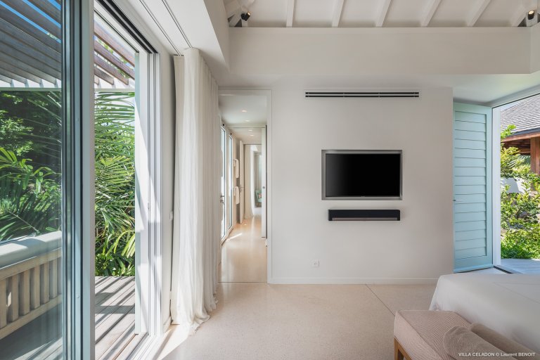 All five of the bedrooms are comparable in size and in offerings, including ensuite bathrooms, televisions, and terraces in front. Three of the bedrooms are to the left of the indoor living area and have sea views, and the remaining two, which can be connected, are to the right of the kitchen and have garden views.