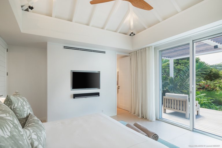 Throughout the villa, everything is decorated in a modern, clean style with pastel colors. Chief among those is the soothing light blue color from which the house takes its name. Despite the modern leanings, the home is warm and welcoming. From its location within the gated community of Mont Jean, it enjoys a large garden on the property, and views of Marigot Bay and the hills around it in the background.