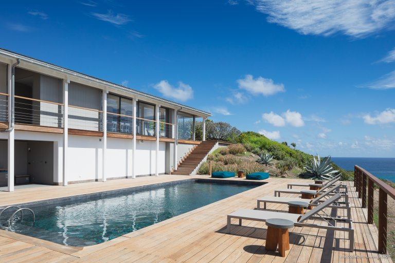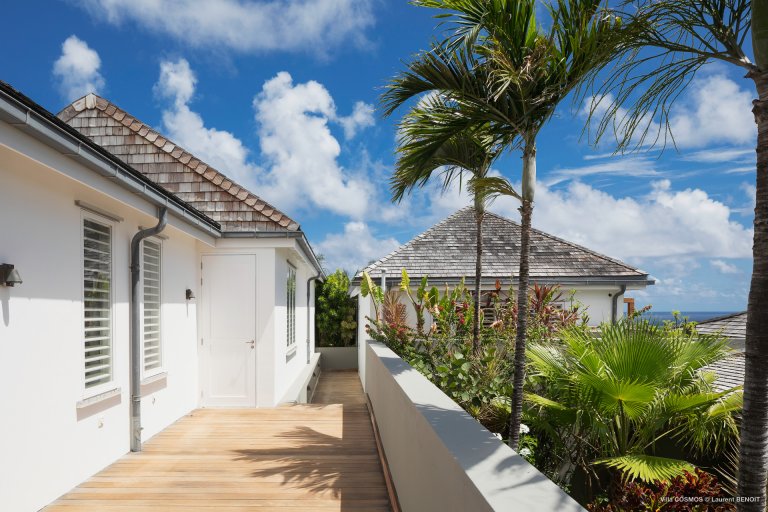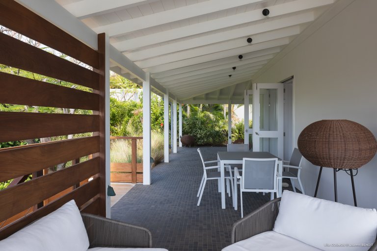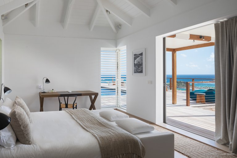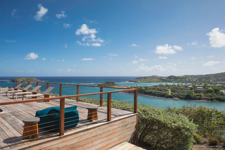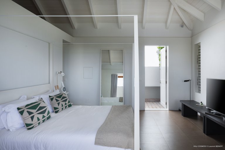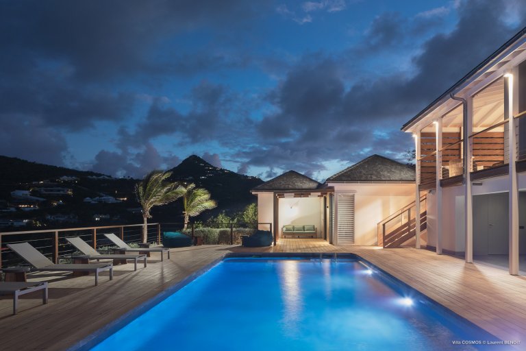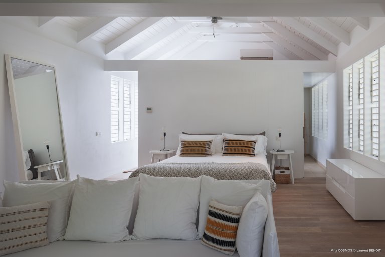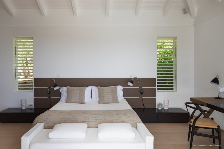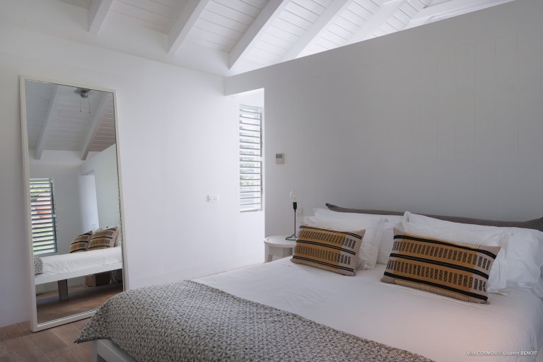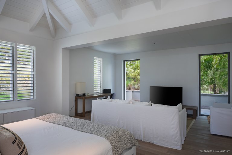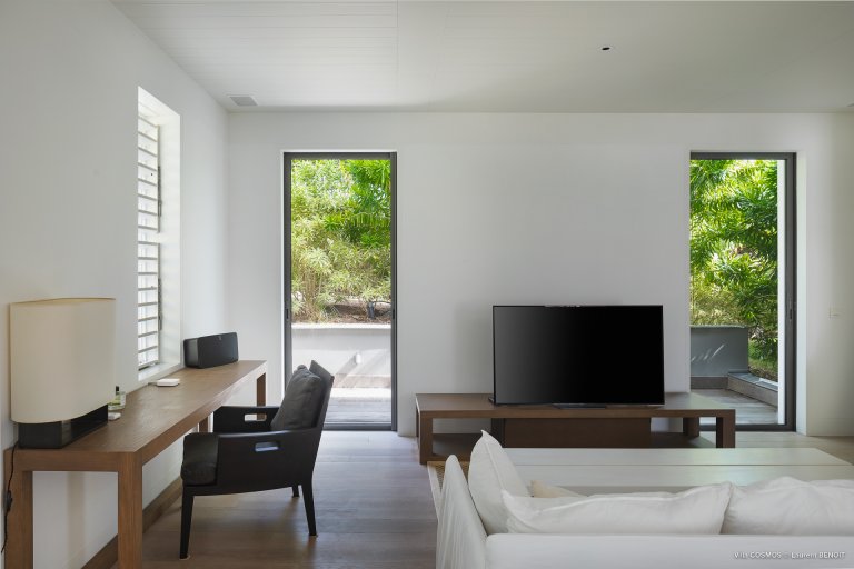 An otherworldly Zen permeates the minimalist retreat known as Villa Cosmos (CMS). The sleek, uncluttered design calms the mind, improves the mood, and focuses your attention exactly where it should be: on the glorious view across Marigot and Grand Cul de Sac. The simple, understated color scheme compliments the clean lines, resulting in a state of utter relaxation. This is a luxury rental property where it is easy to feel at home—both physically and spiritually.