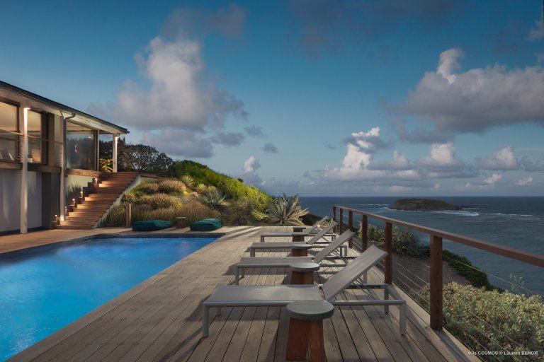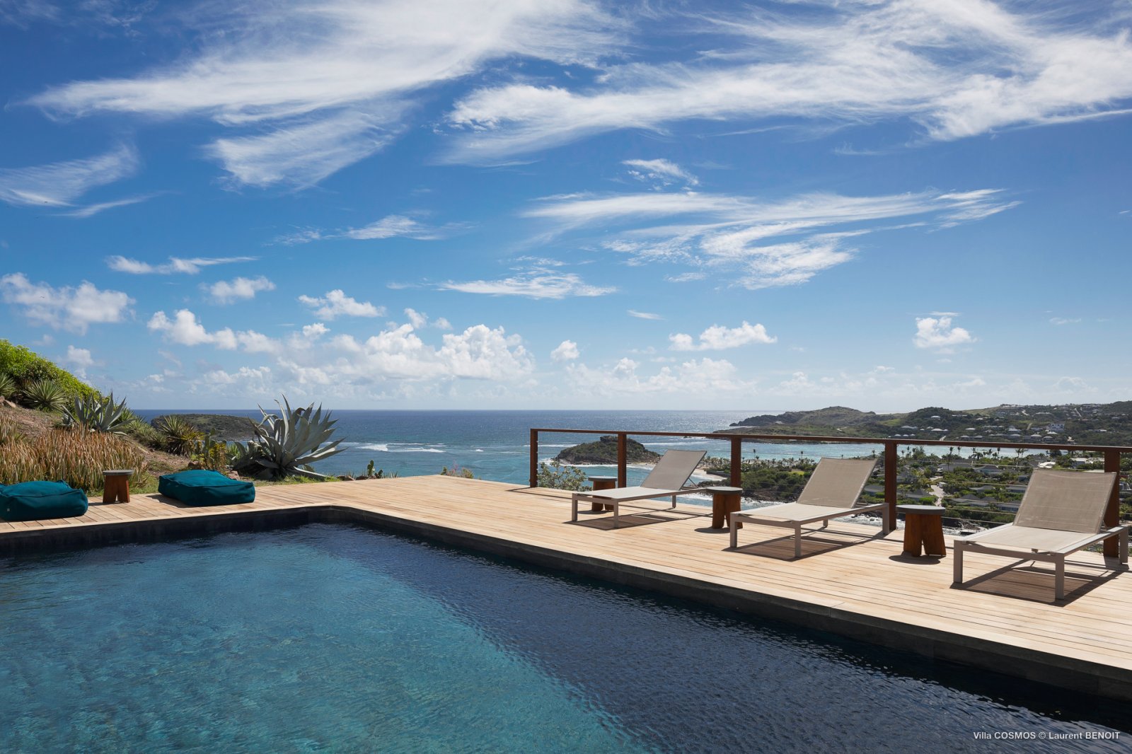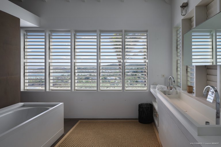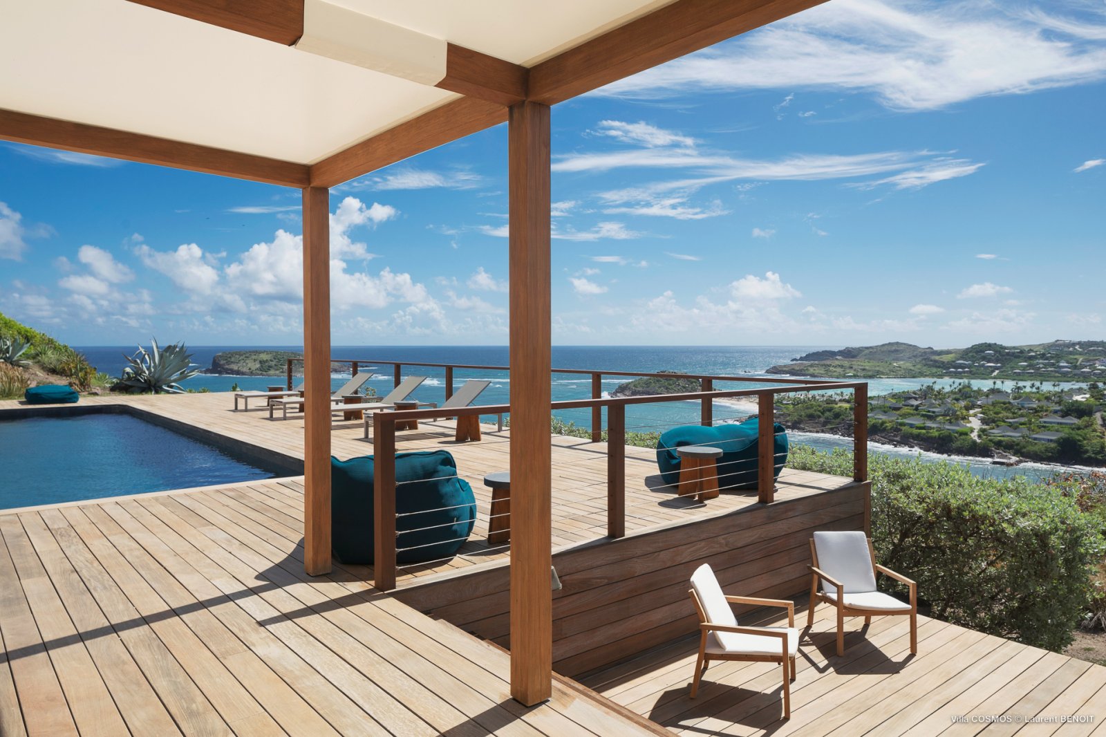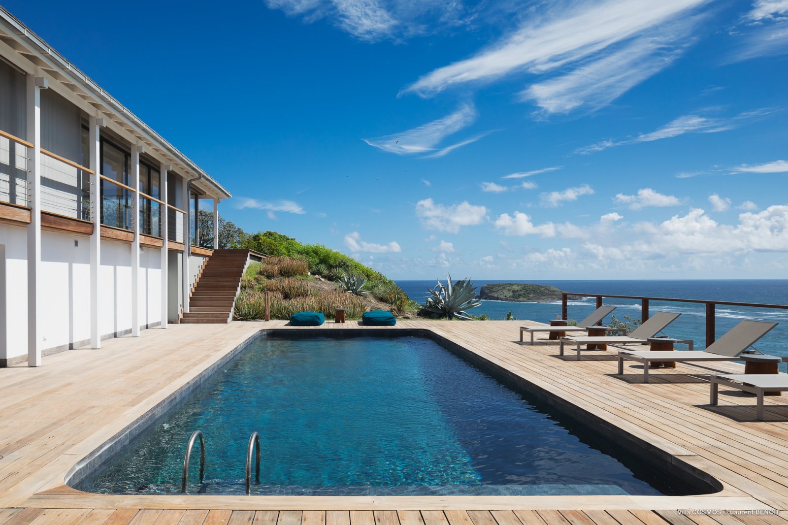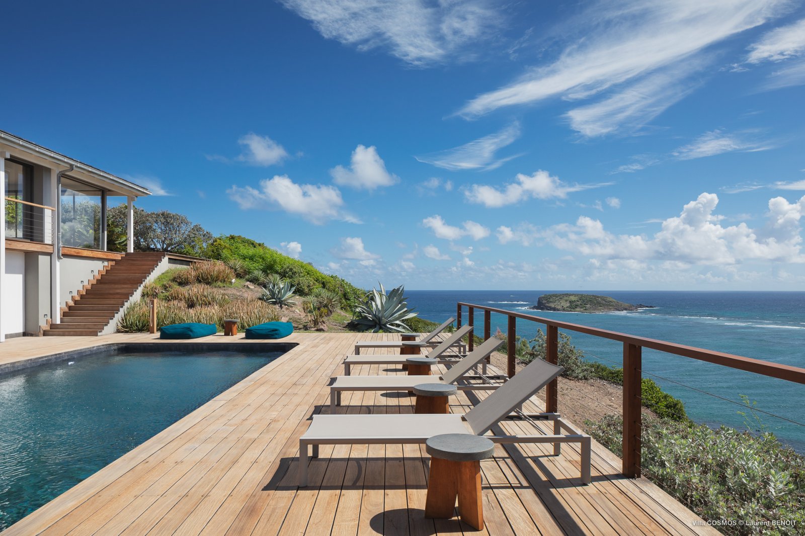 An otherworldly Zen permeates the minimalist retreat known as Villa Cosmos (CMS). The sleek, uncluttered design calms the mind, improves the mood, and focuses your attention exactly where it should be: on the glorious view across Marigot and Grand Cul de Sac. The simple, understated color scheme compliments the clean lines, resulting in a state of utter relaxation. This is a luxury rental property where it is easy to feel at home—both physically and spiritually.