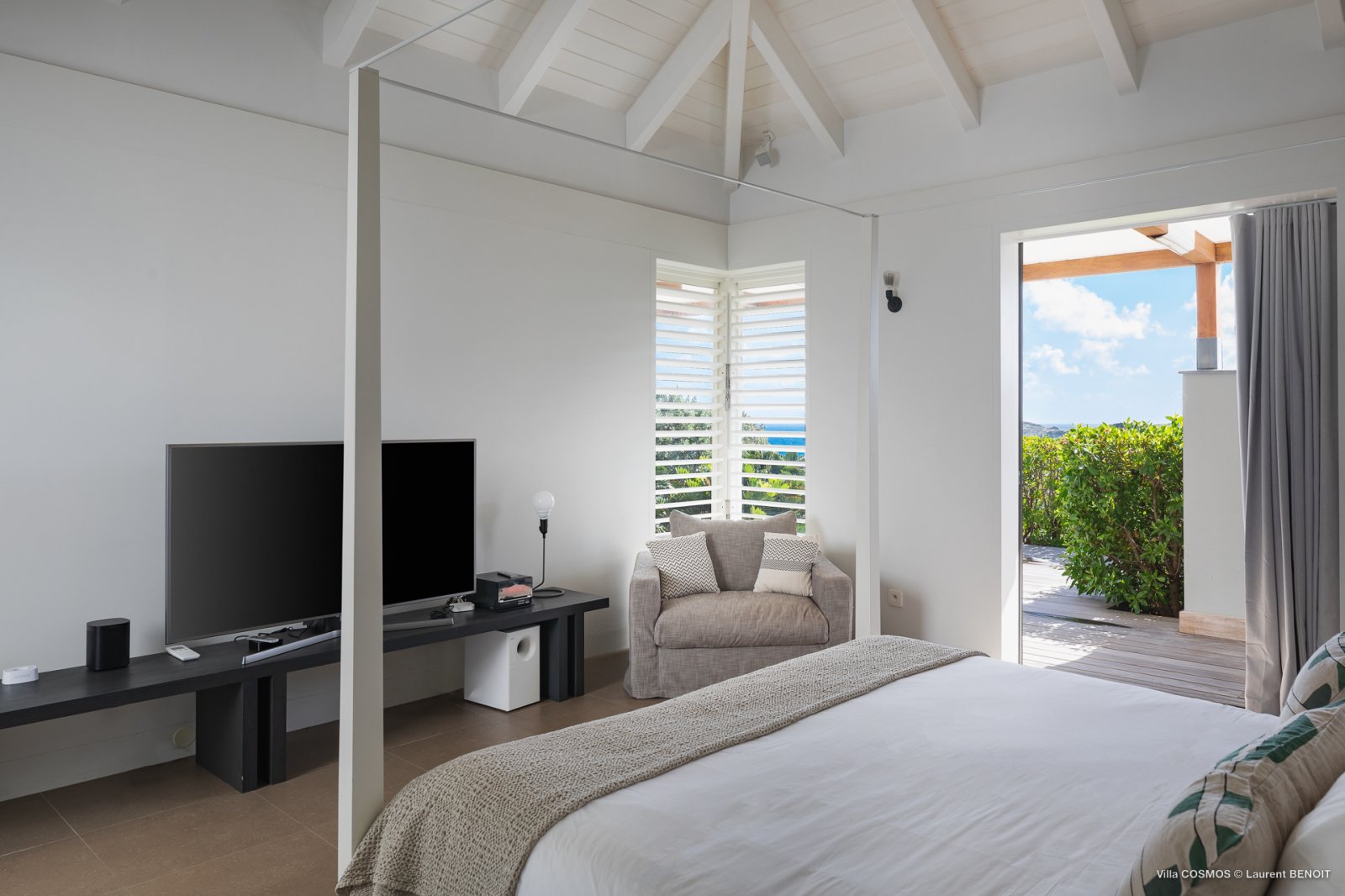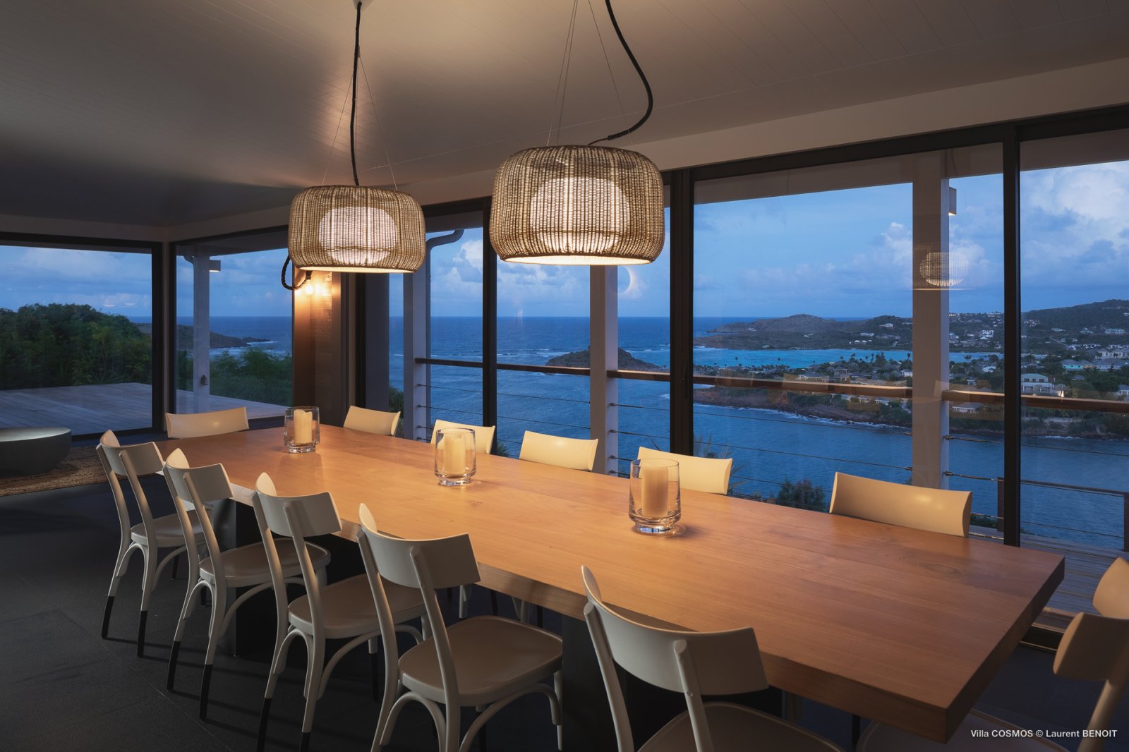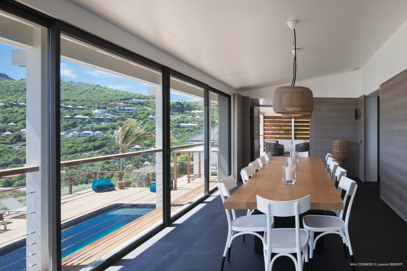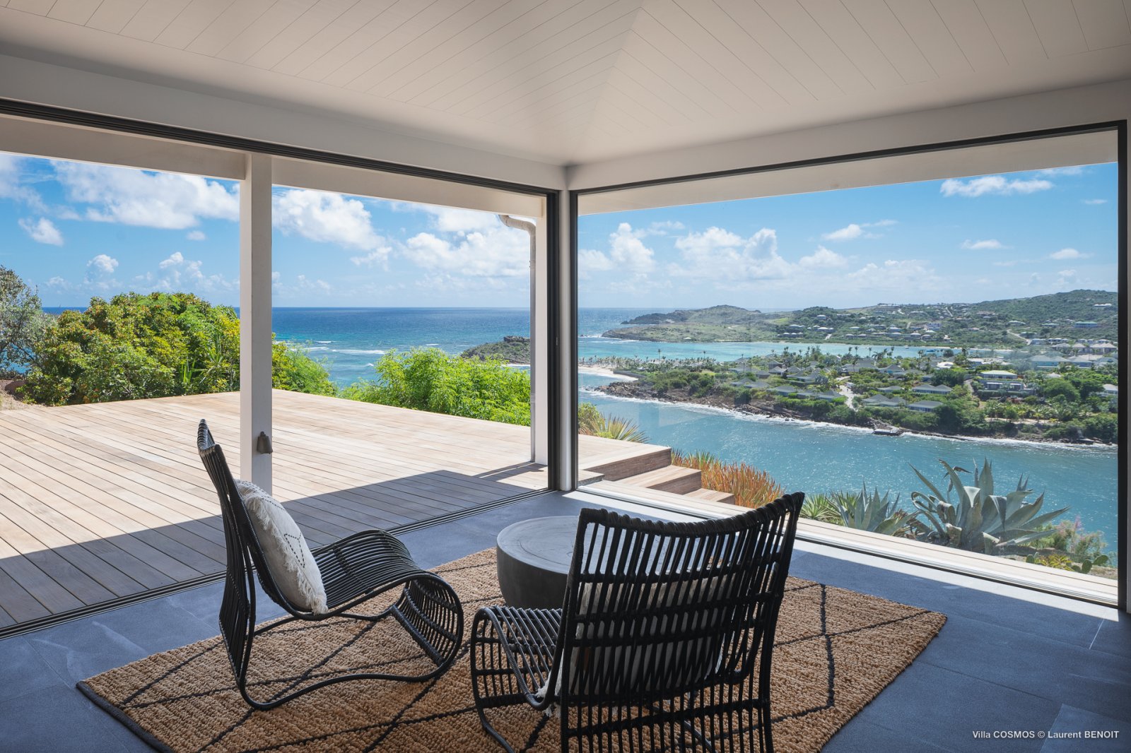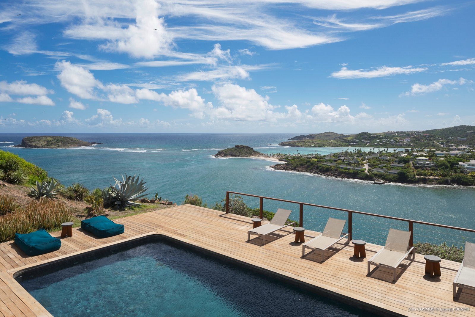 An otherworldly Zen permeates the minimalist retreat known as Villa Cosmos (CMS). The sleek, uncluttered design calms the mind, improves the mood, and focuses your attention exactly where it should be: on the glorious view across Marigot and Grand Cul de Sac. The simple, understated color scheme compliments the clean lines, resulting in a state of utter relaxation. This is a luxury rental property where it is easy to feel at home—both physically and spiritually.