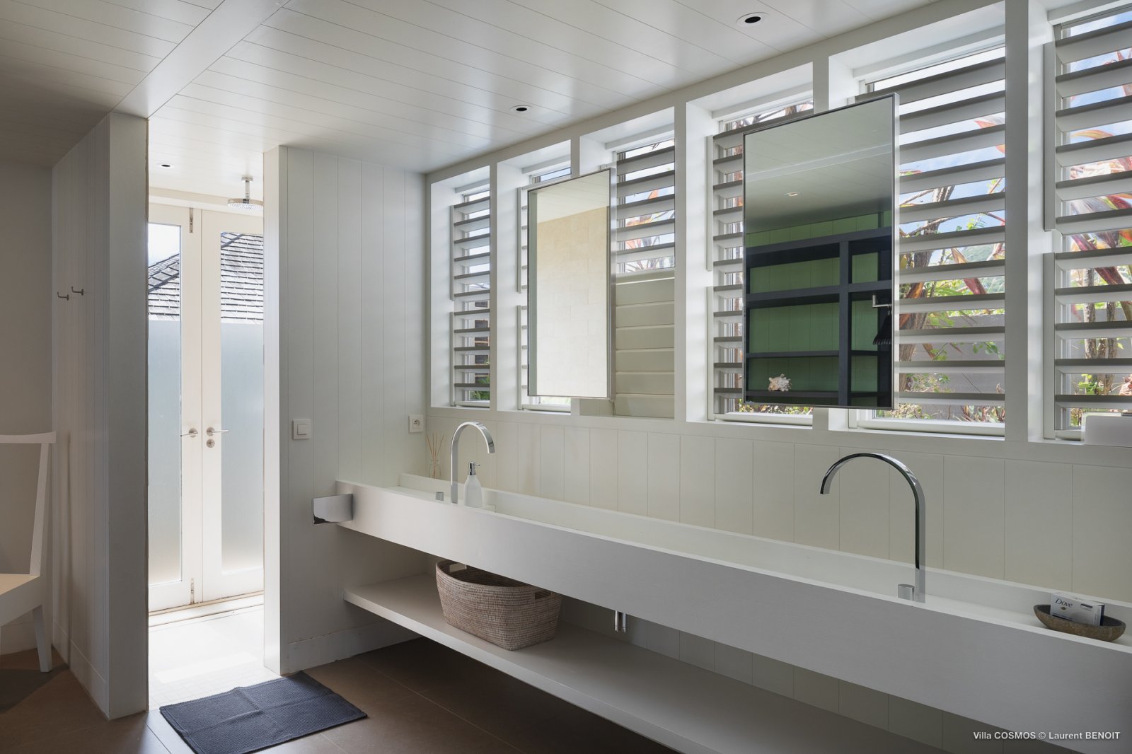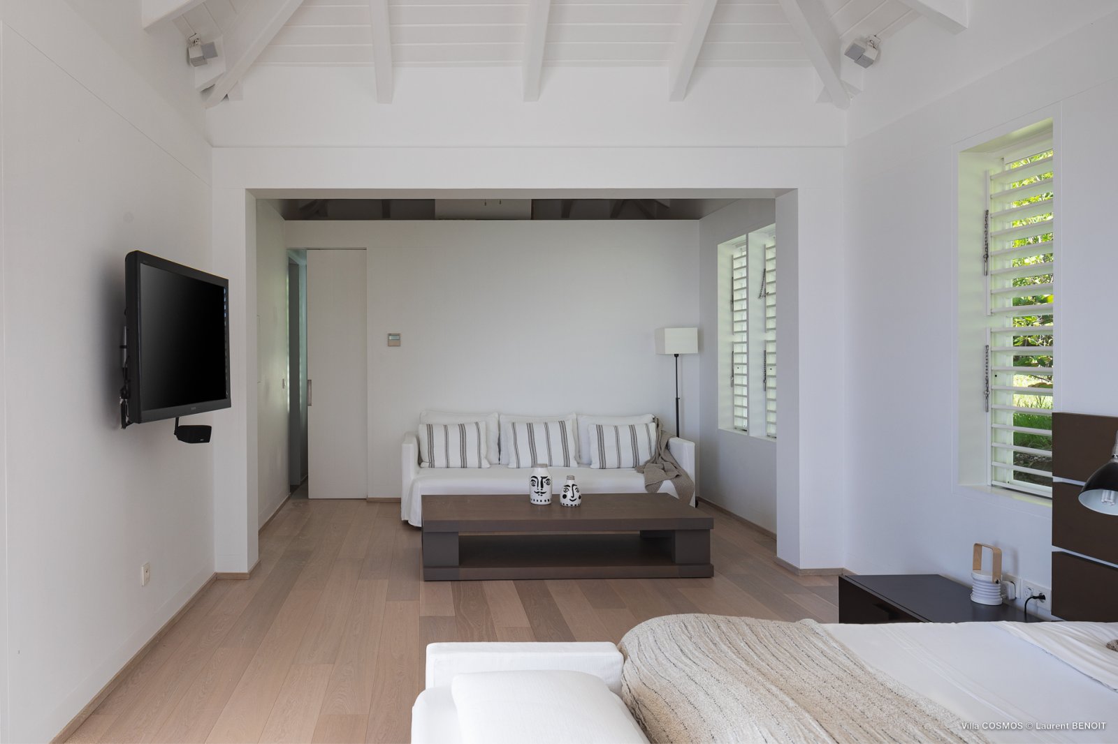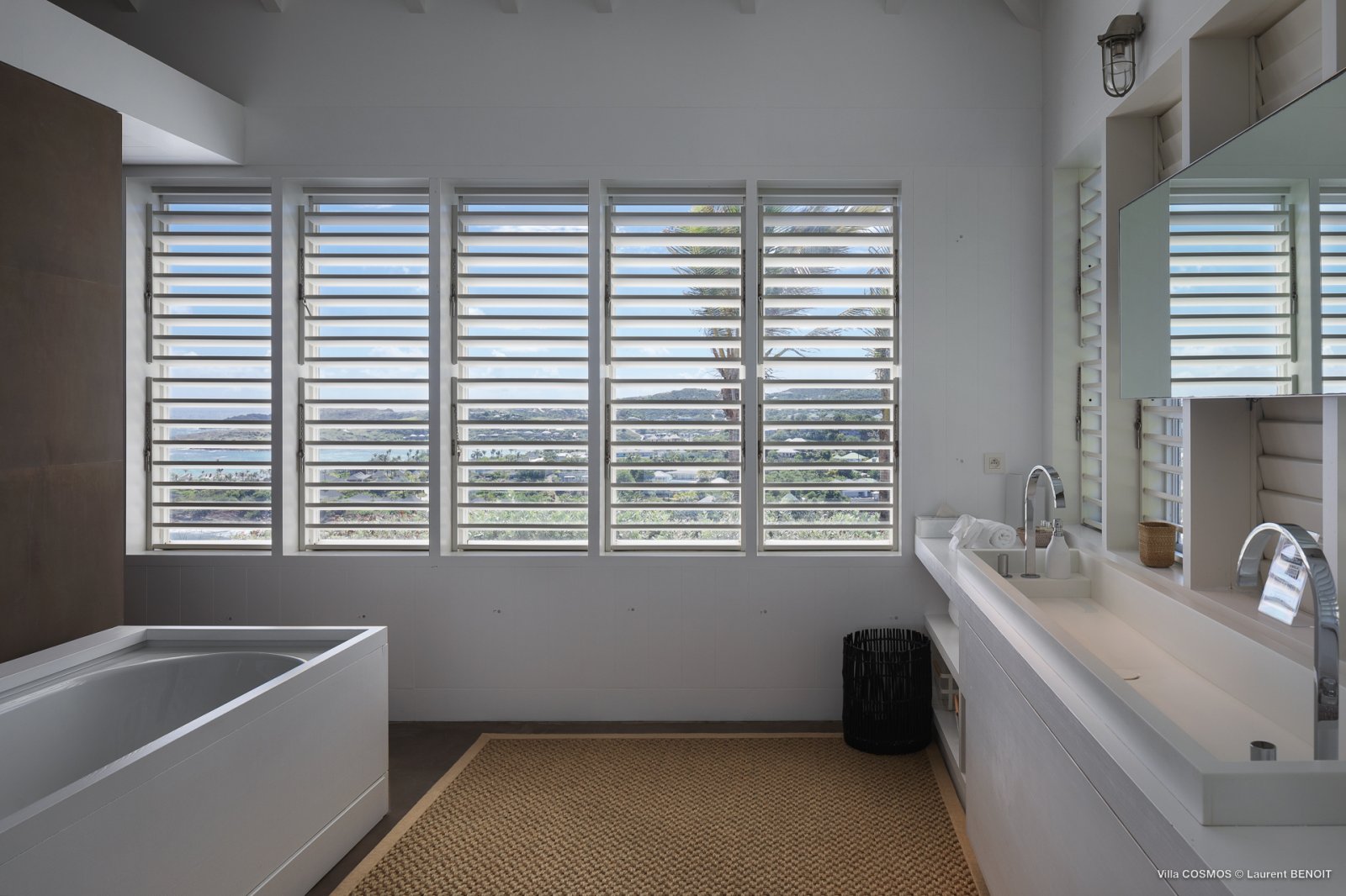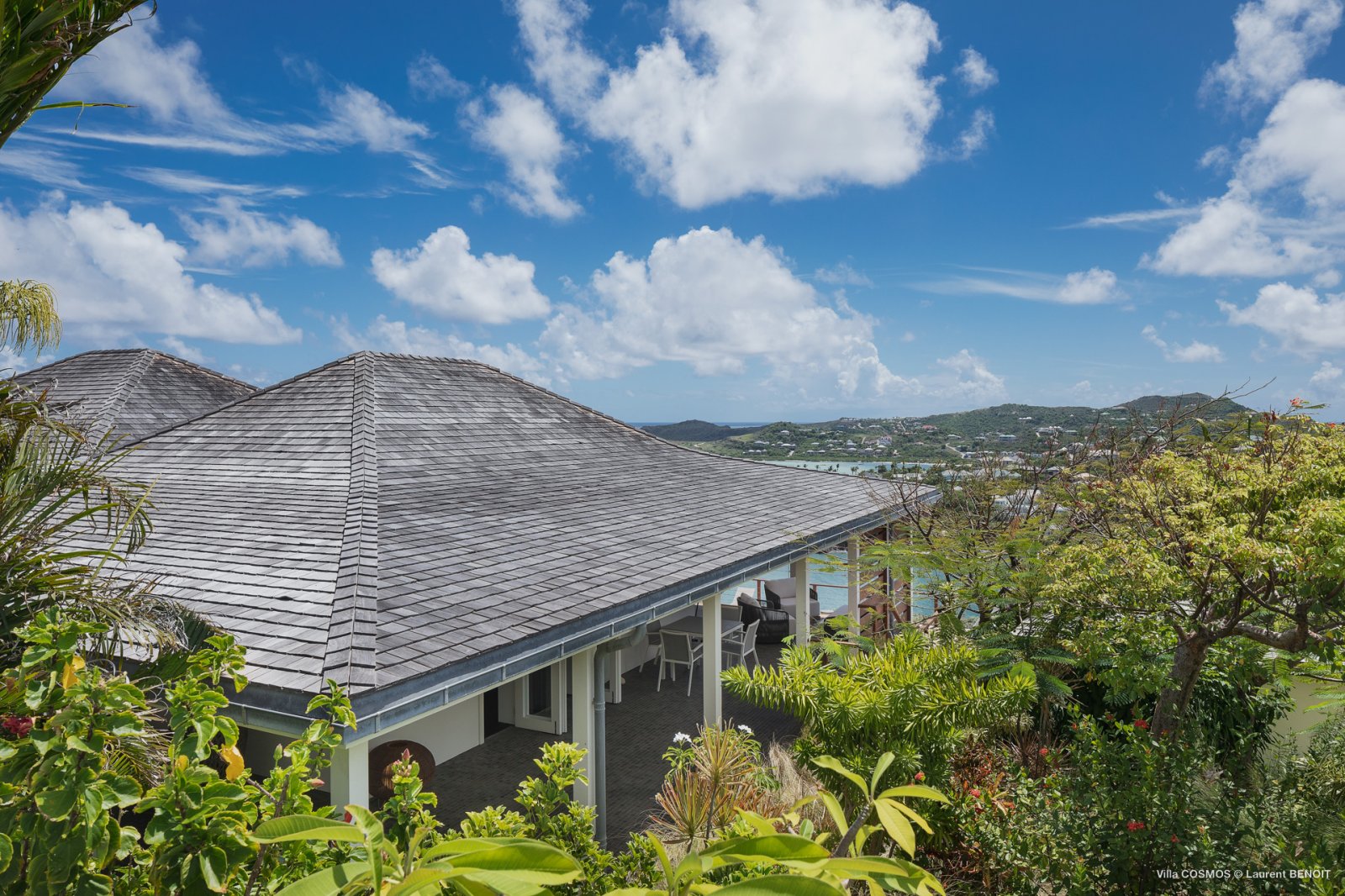 An otherworldly Zen permeates the minimalist retreat known as Villa Cosmos (CMS). The sleek, uncluttered design calms the mind, improves the mood, and focuses your attention exactly where it should be: on the glorious view across Marigot and Grand Cul de Sac. The simple, understated color scheme compliments the clean lines, resulting in a state of utter relaxation. This is a luxury rental property where it is easy to feel at home—both physically and spiritually.