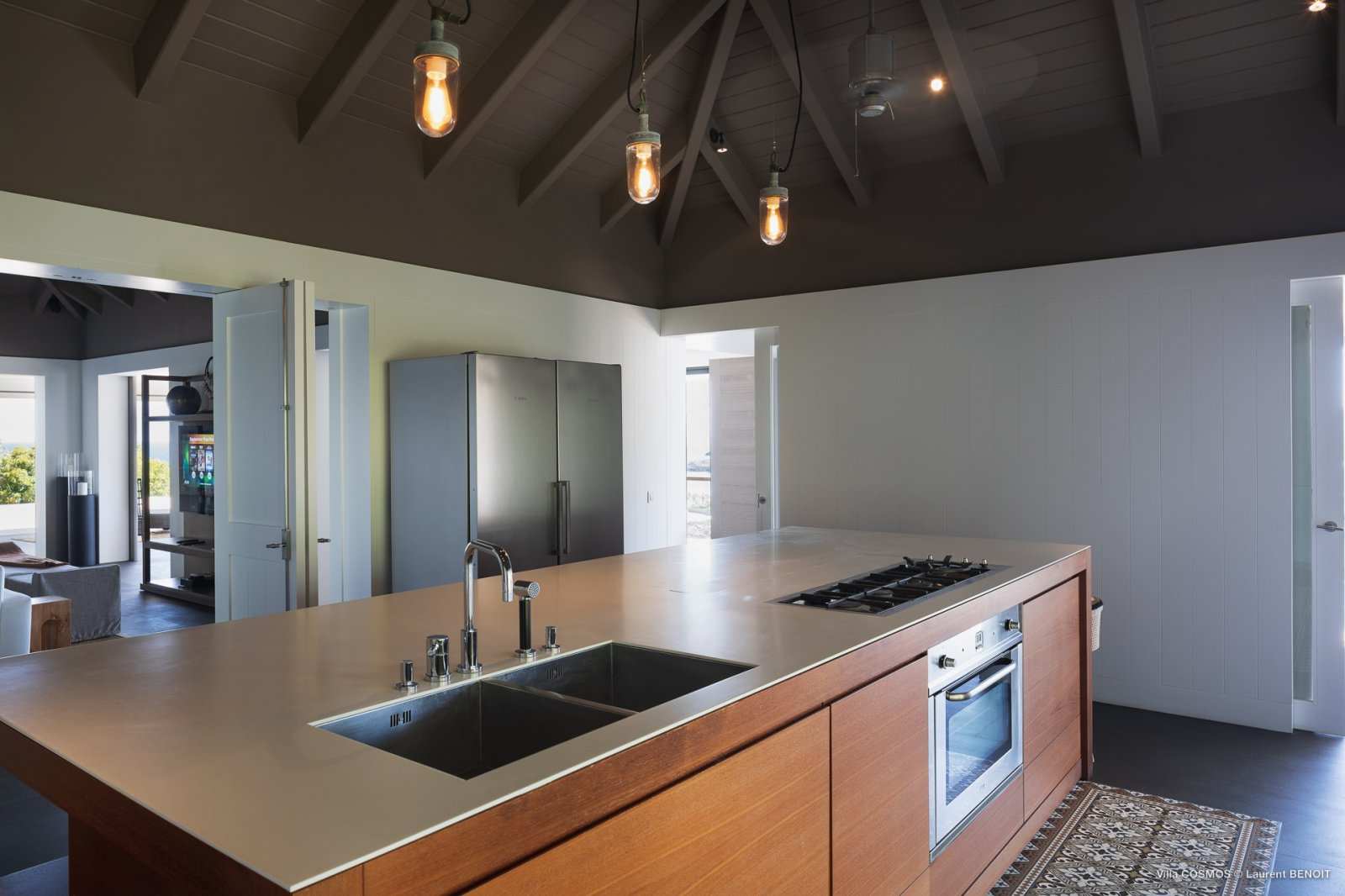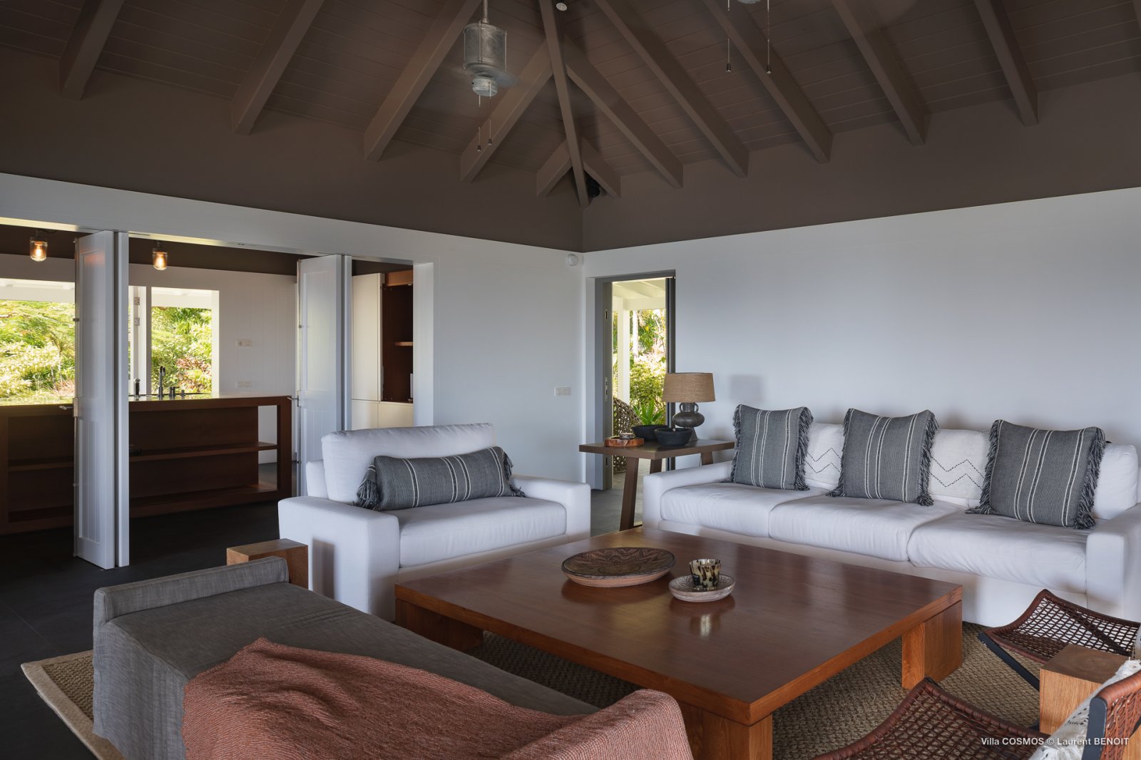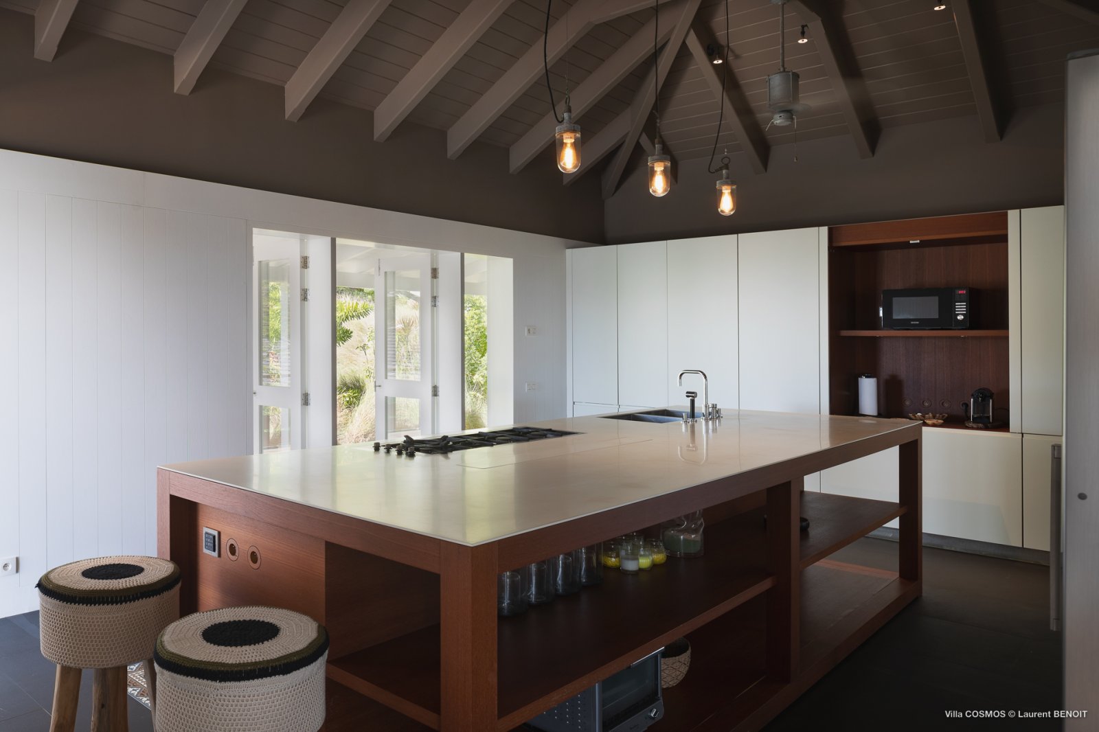 Also on this level, the true heart of Villa Cosmos—and something that sets it apart from other villas on St. Barth—is the high-caliber kitchen, spacious and equipped with everything an ambitious cook might want (and all of it artfully concealed within the cabinetry). It can be left open to the living area for those who wish to make preparing a meal together a family endeavor, or closed off in case you’d rather let a private chef take care off the cooking.