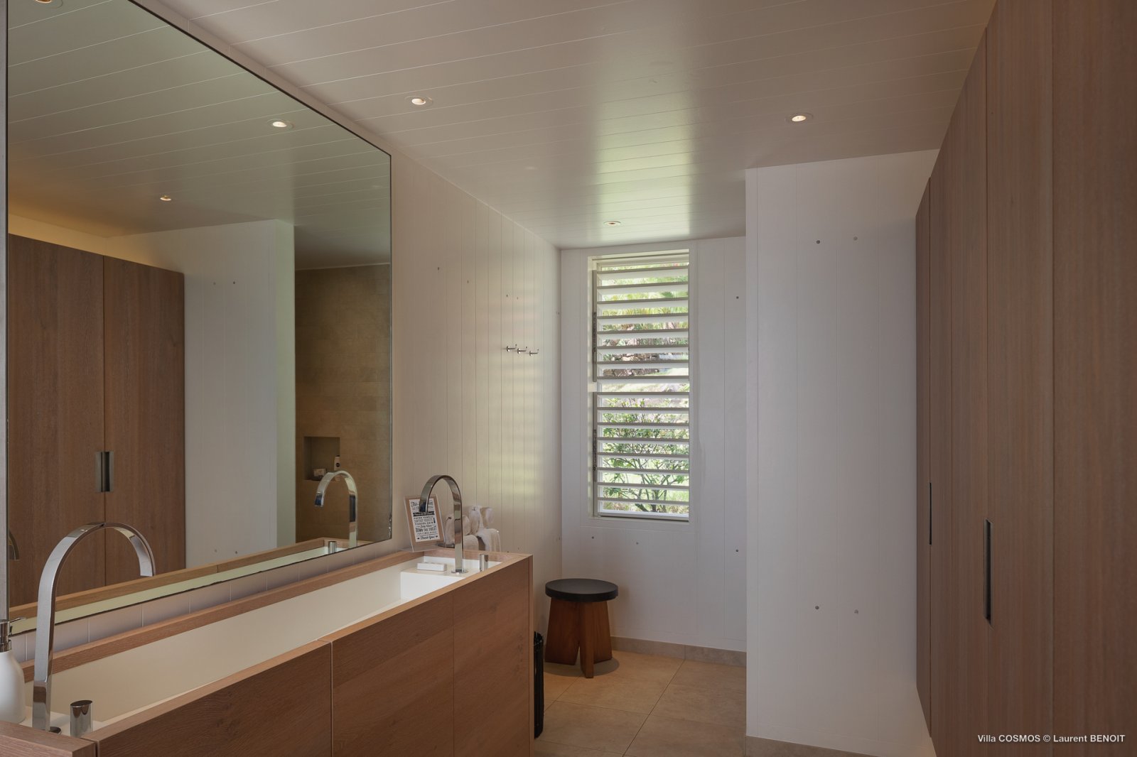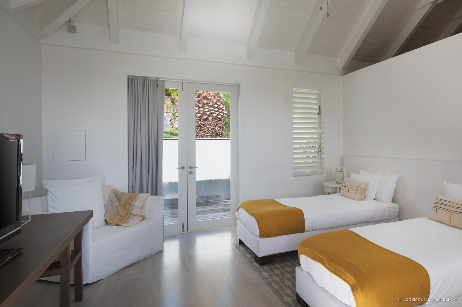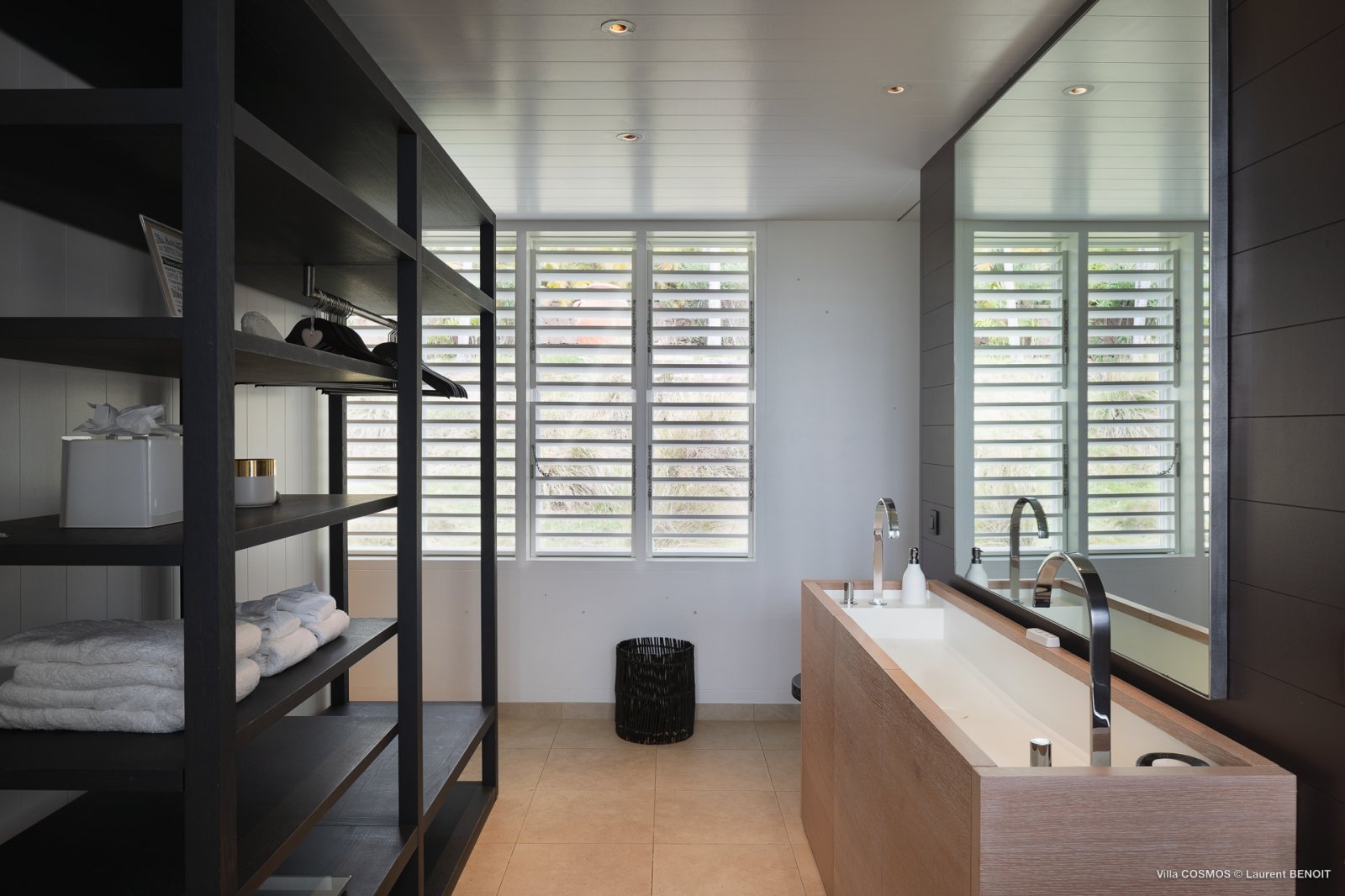 Also on this level, the true heart of Villa Cosmos—and something that sets it apart from other villas on St. Barth—is the high-caliber kitchen, spacious and equipped with everything an ambitious cook might want (and all of it artfully concealed within the cabinetry). It can be left open to the living area for those who wish to make preparing a meal together a family endeavor, or closed off in case you’d rather let a private chef take care off the cooking.