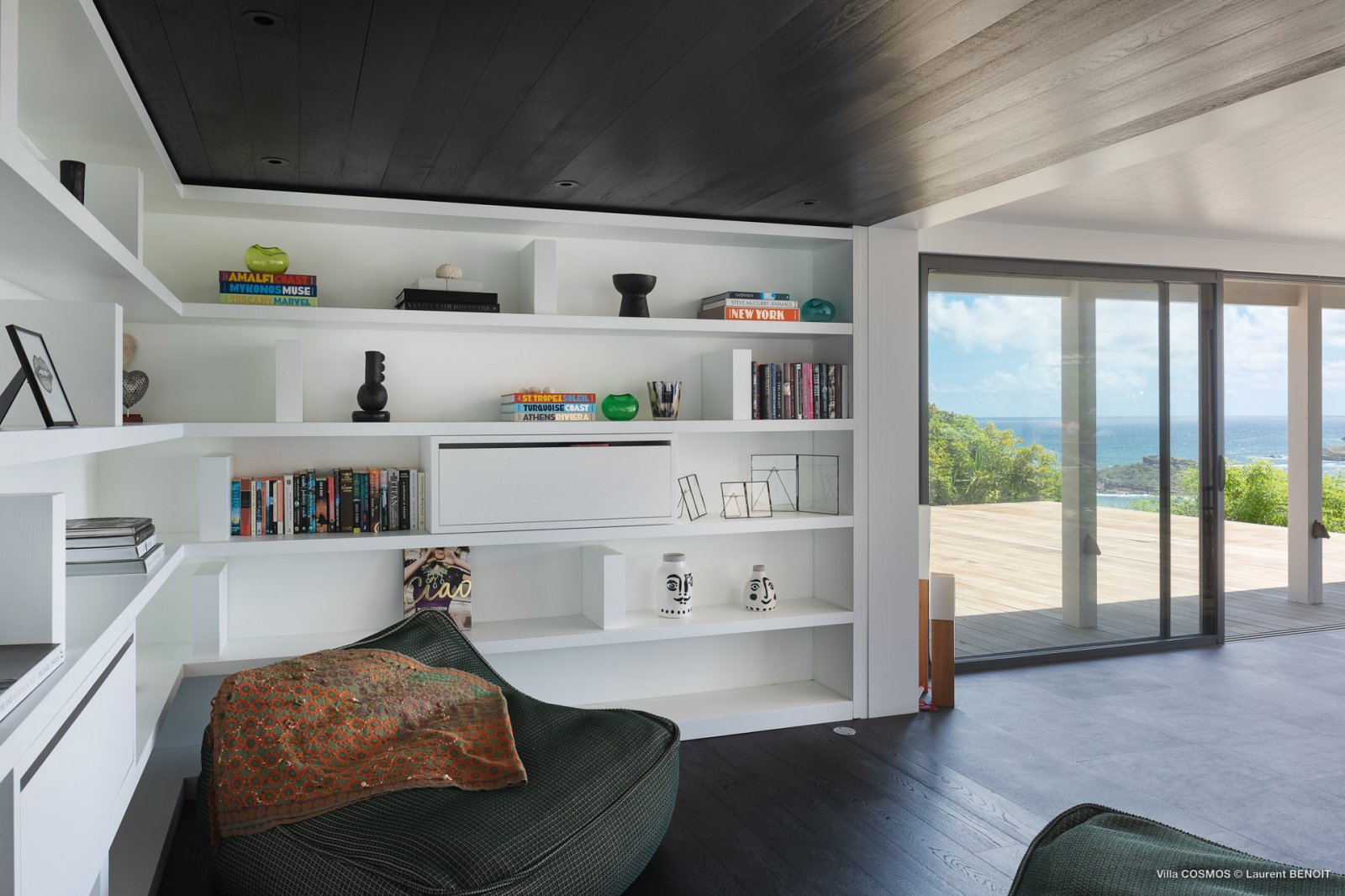 While the layout flows harmoniously across three floors, the heart of Villa Cosmos lies on the middle level. This is the main living space, and it includes an indoor living space, stunning library and office area, and 12-person dining room with glass walls that retract to merge the interior with the nature outside. Outside this living space is a wrap-around covered terrace with a table for twelve, as well an area that is positively dreamy for entertaining—evening cocktails, anyone?