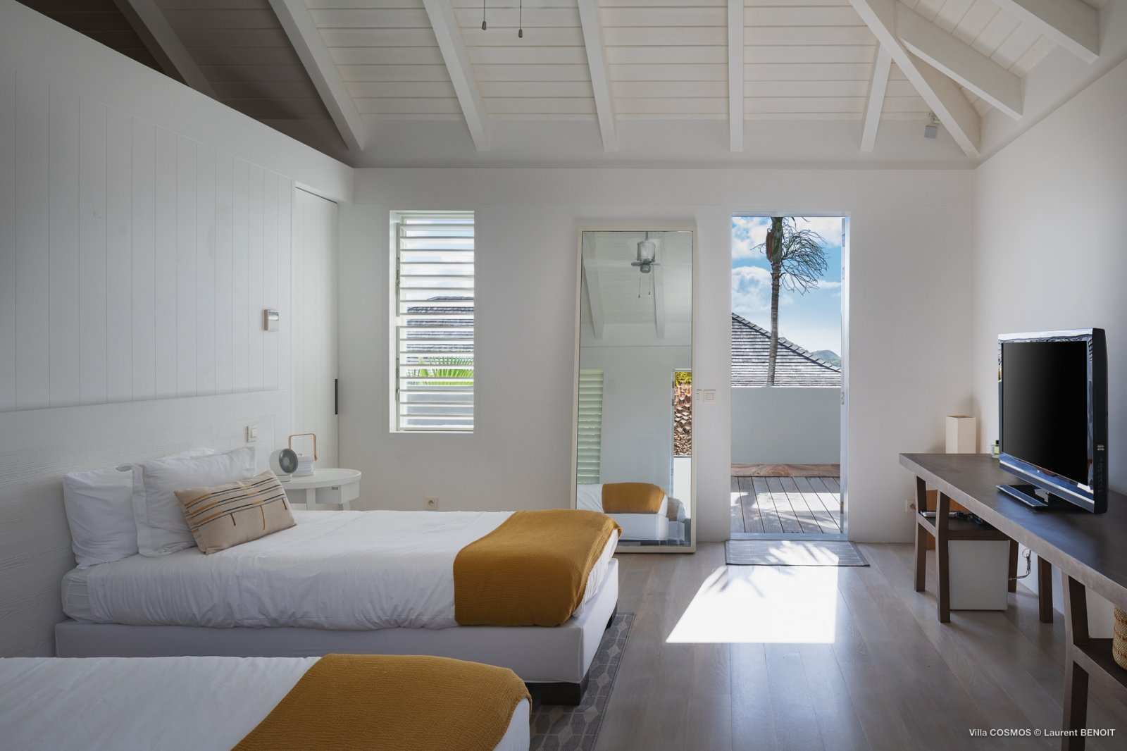 Bed: 2 Twin Beds w/Option as King Bed • En-Suite Bath with Rainfall Shower and Dual Vanity • Air Conditioning • Ceiling Fan • Flat-Screen, High Definition TV • iPod Docking Station • DVD Player • Sound System • Iron & Ironing Board • Hair Dryer • 110 Voltage • Direct Access to Private Terrace