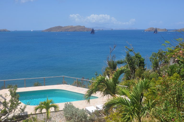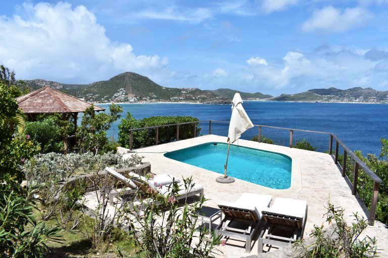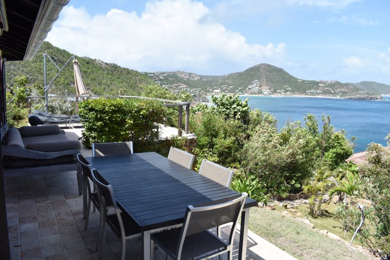 In front, there is the terrace, with its panoramic views and a covered dining area facing the sea. A path leads down to a garden, swimming pool, and deck chairs with views of Pointe Milou Cove and the Saint-Jean and Flamands districts. A furnished gazebo offers another spot for alfresco dining.