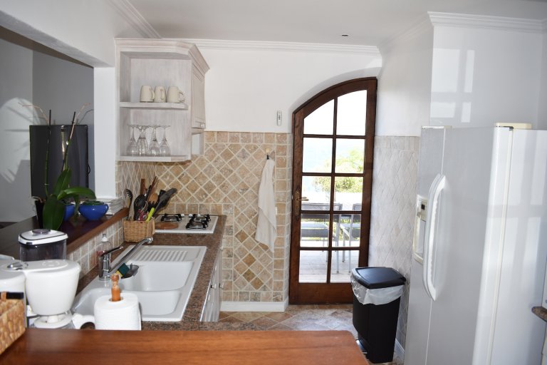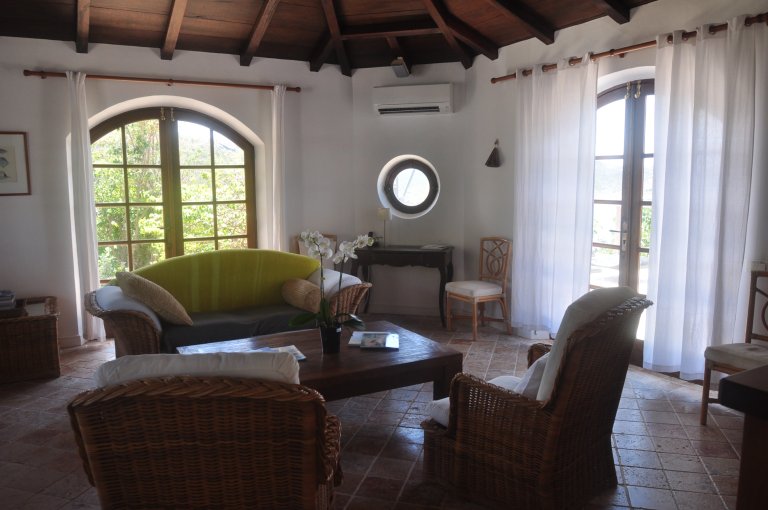 The living room has a sofa and rattan armchairs with cushions. The natural wood ceiling and porthole windows give it a nautical feeling, and it can be opened to the trade winds or fully air-conditioned. Behind it is the kitchen, which is well equipped with a gas stove and microwave but no oven.