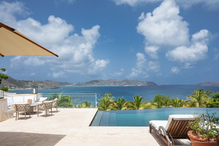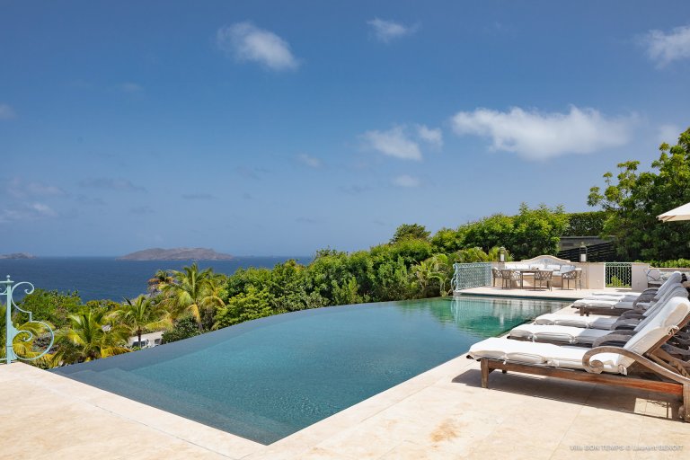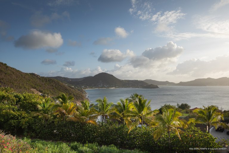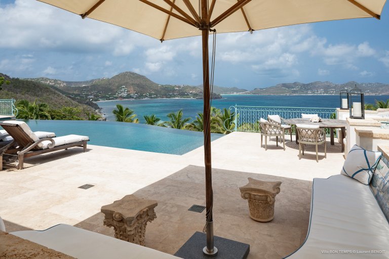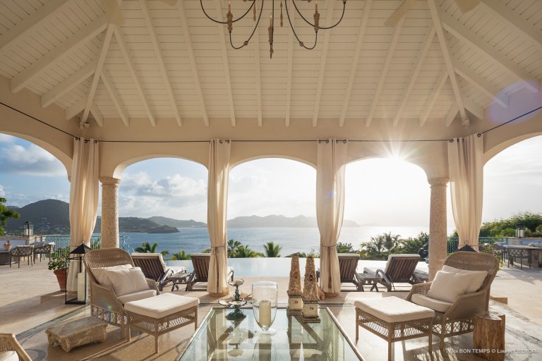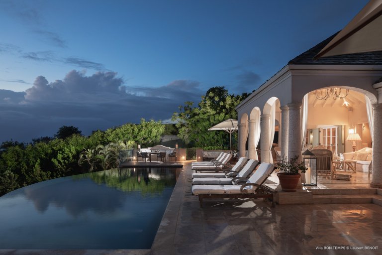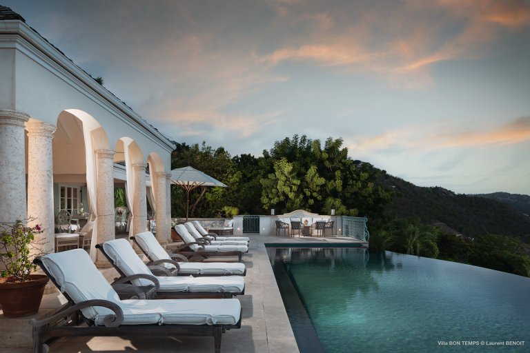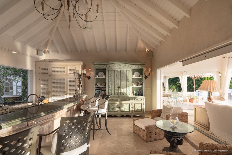 Situated on the western side of the peninsula of Pointe Milou, Villa Bon Temps (BTR) offers a gracious lifestyle in the perfect Caribbean setting, amid lush tropical foliage and with unparalleled sunset views. From the vantage point of the expansive and elegantly designed stone terrace, the clear water of the 50-foot infinity pool seems to merge with the blues of the Bay of Lorient, the islets of Chavreaux and Fourchue and the island of St. Maarten visible in the distance.