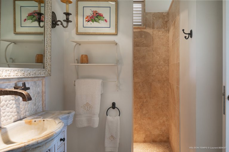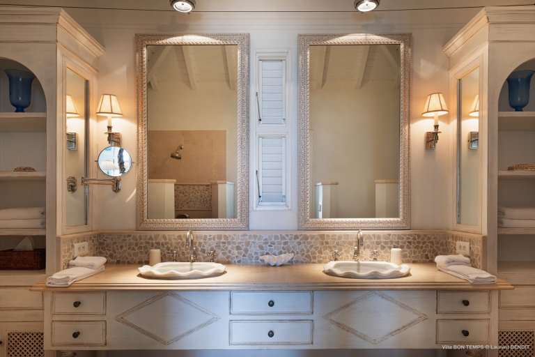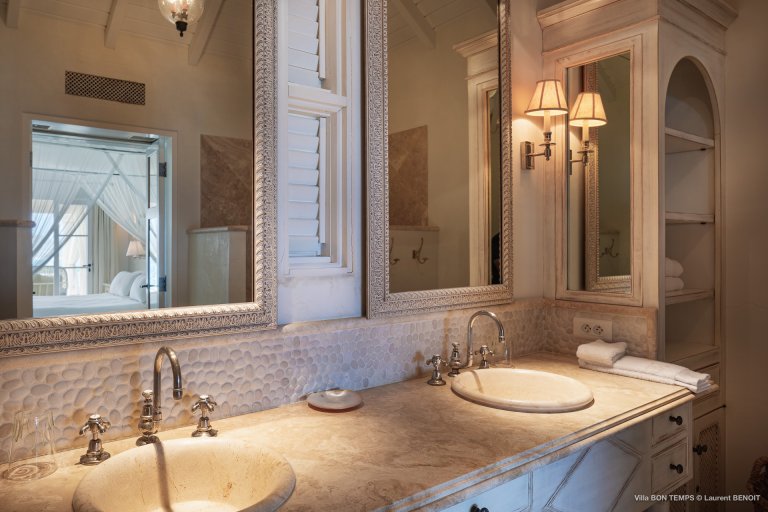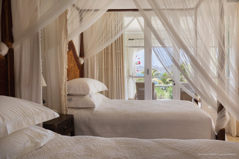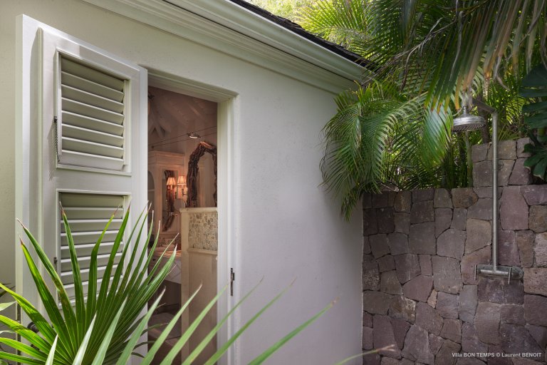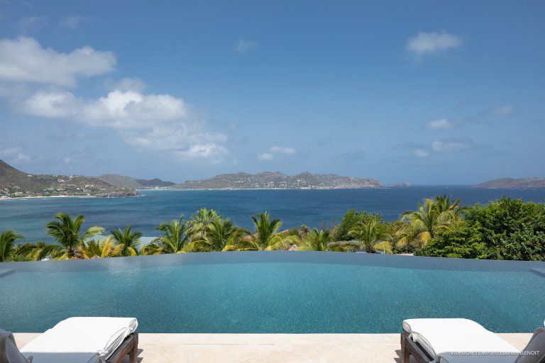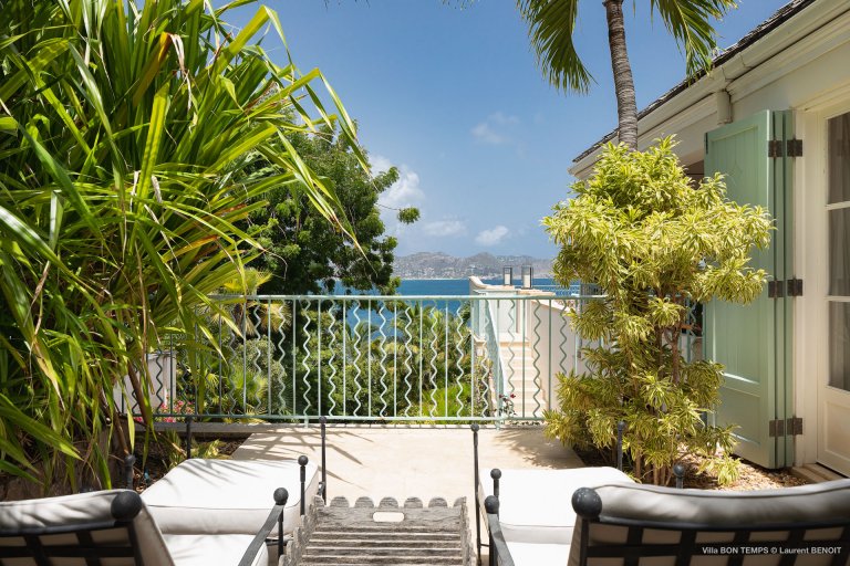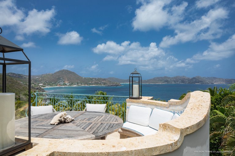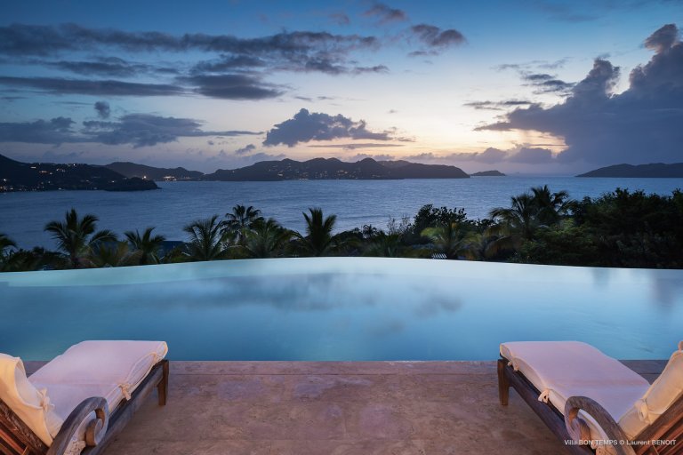 Situated on the western side of the peninsula of Pointe Milou, Villa Bon Temps (BTR) offers a gracious lifestyle in the perfect Caribbean setting, amid lush tropical foliage and with unparalleled sunset views. From the vantage point of the expansive and elegantly designed stone terrace, the clear water of the 50-foot infinity pool seems to merge with the blues of the Bay of Lorient, the islets of Chavreaux and Fourchue and the island of St. Maarten visible in the distance.