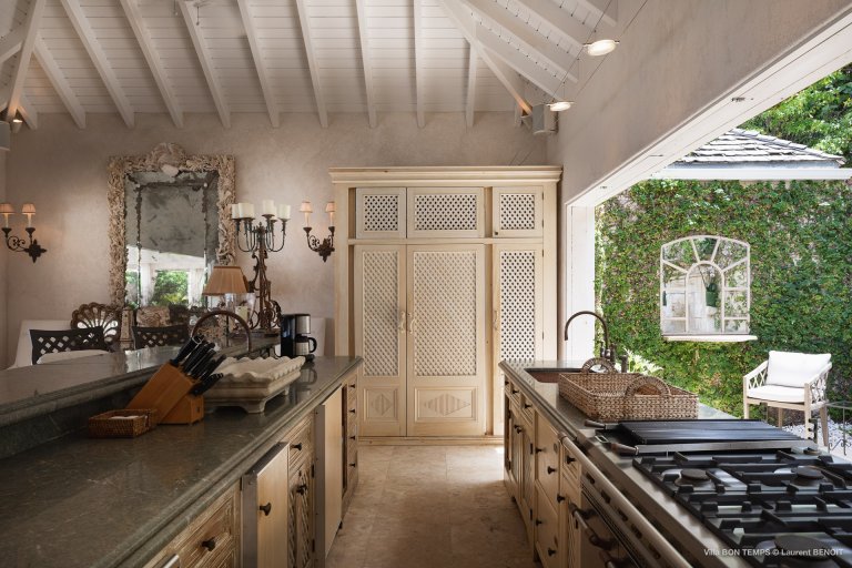 The open-air chef's kitchen is equipped with a LaCanche range, marble countertops, unique Italian and French glassware, dishes, linens and table setting for entertaining. Villa BTR also provides its guests with the modern conveniences of an HDTV in the kitchen and certain bedrooms as well as the living area, a stereo system with indoor and outdoor speakers, and a well-equipped fitness room.