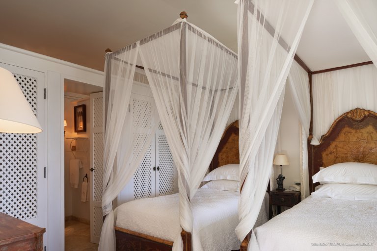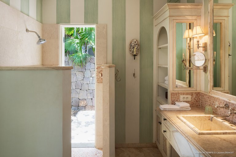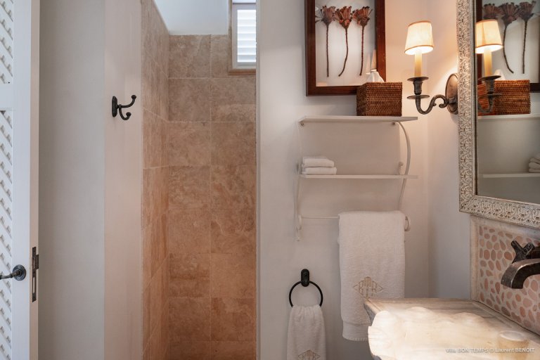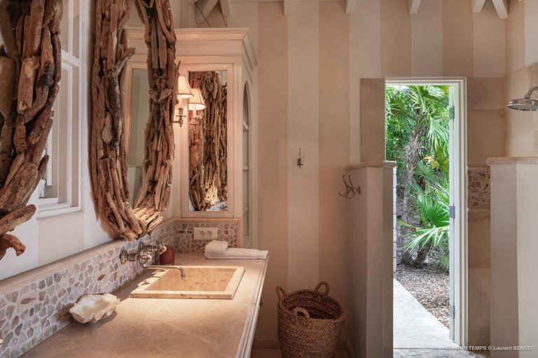 Villa BTR is decorated in soft, natural hues of blue and green against a background of cream and off-white. Custom mosaic floors, hand-painted tile details, and a stone colonnade offering shade from the sun all lend this exceptional home a particularly Mediterranean feel. The villa's six bedrooms are all equally well-appointed, with high ceilings, travertine-tiled bathrooms and ocean views. Four of the bedrooms are on the same level as the main house, while the other two are on a lower level and offer private, covered porches.