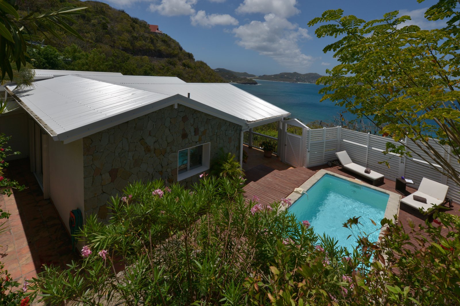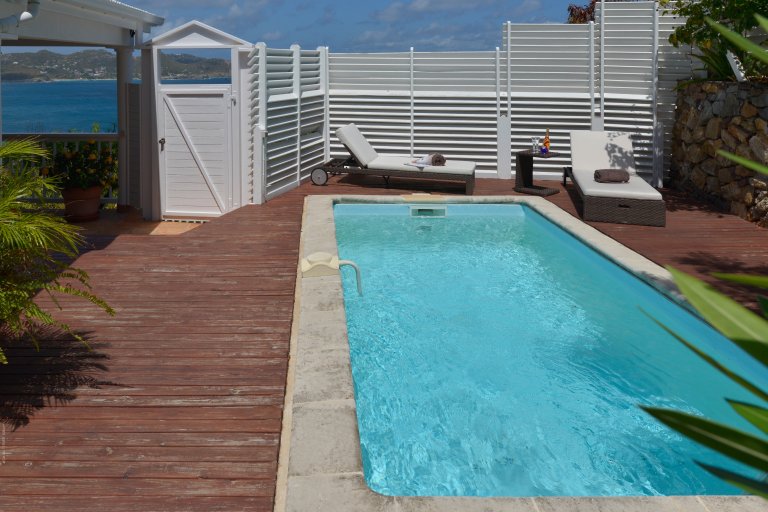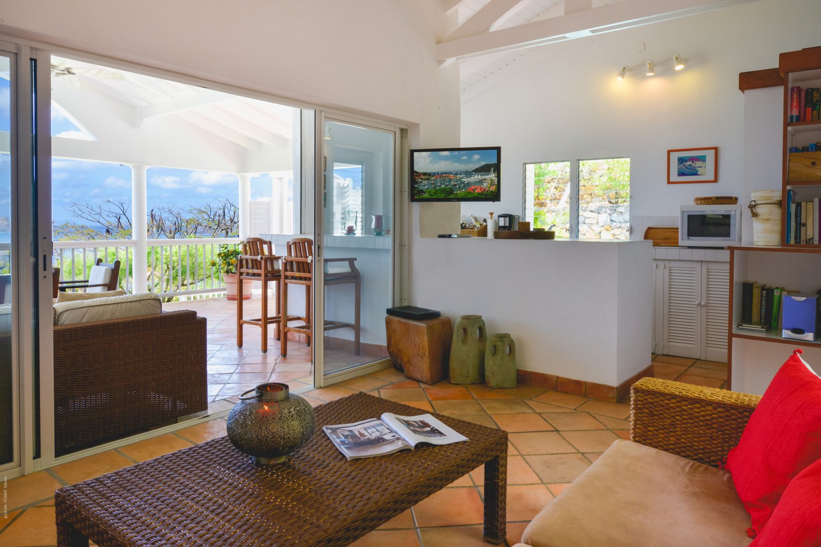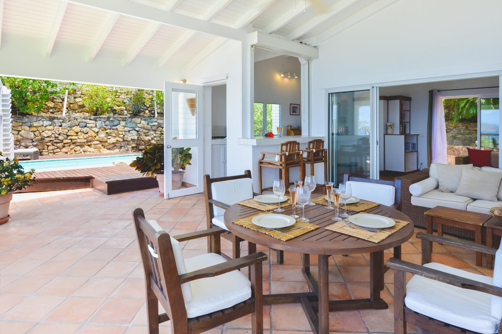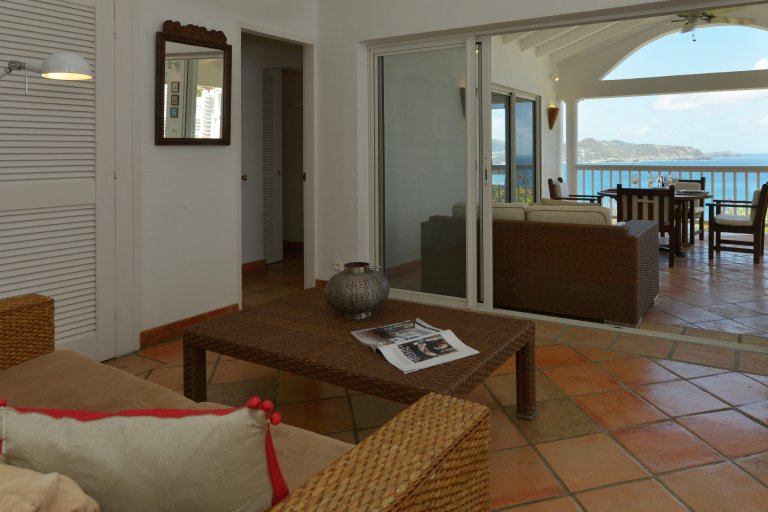 Guests spend more time on the pretty terrace that overlooks the magnificent view of Pointe Milou. Adjacent to the terrace is a small swimming pool. The villa is bright and cheery and totally screened.