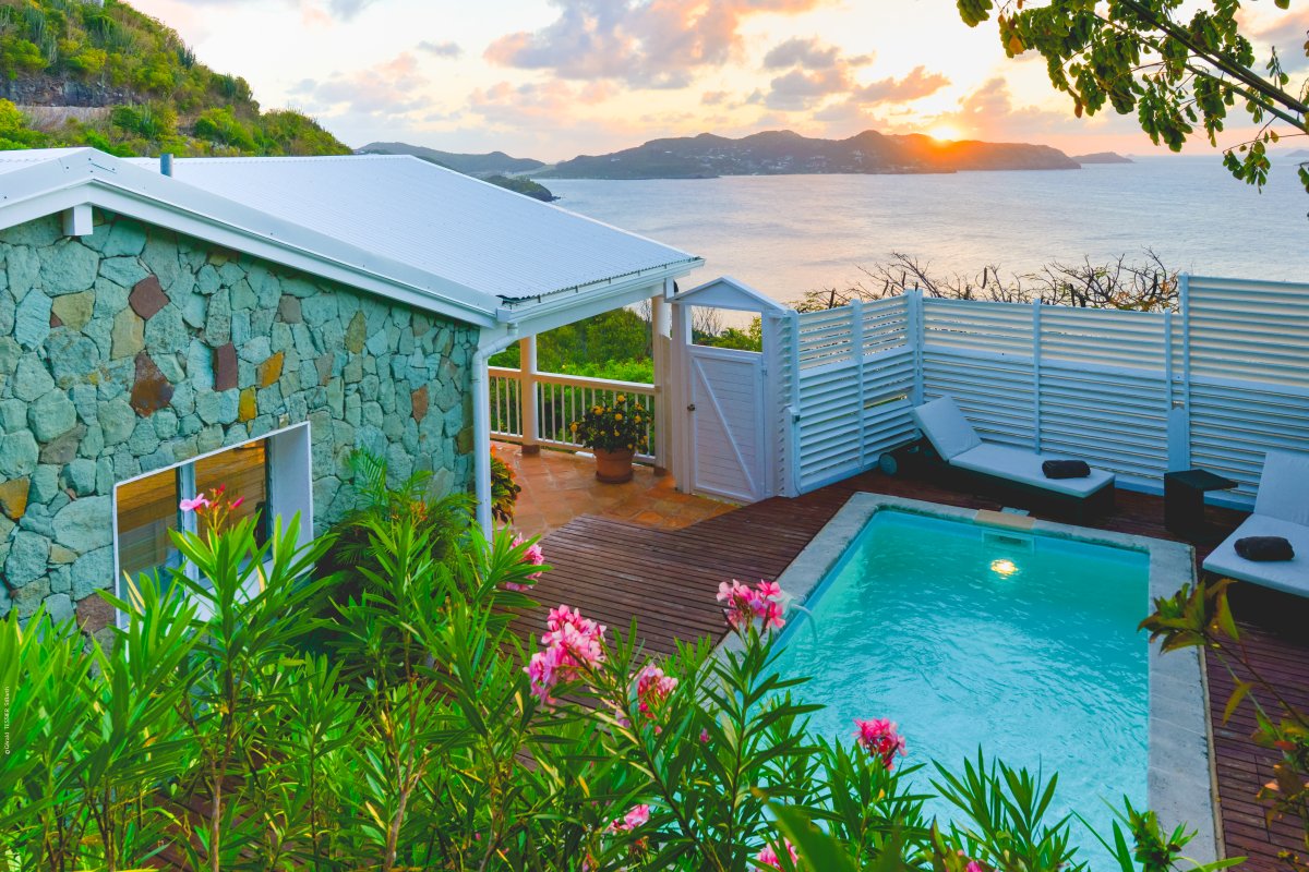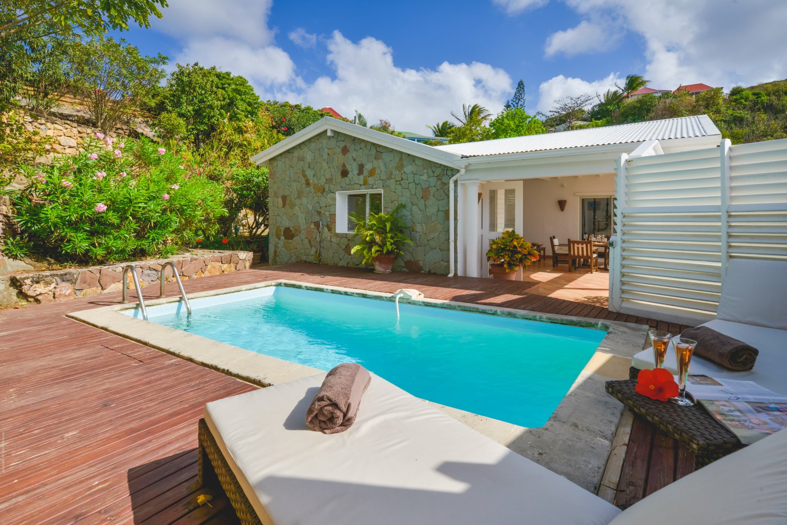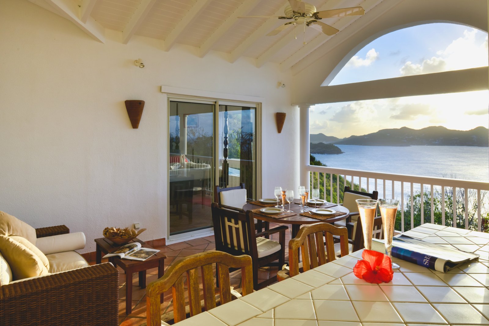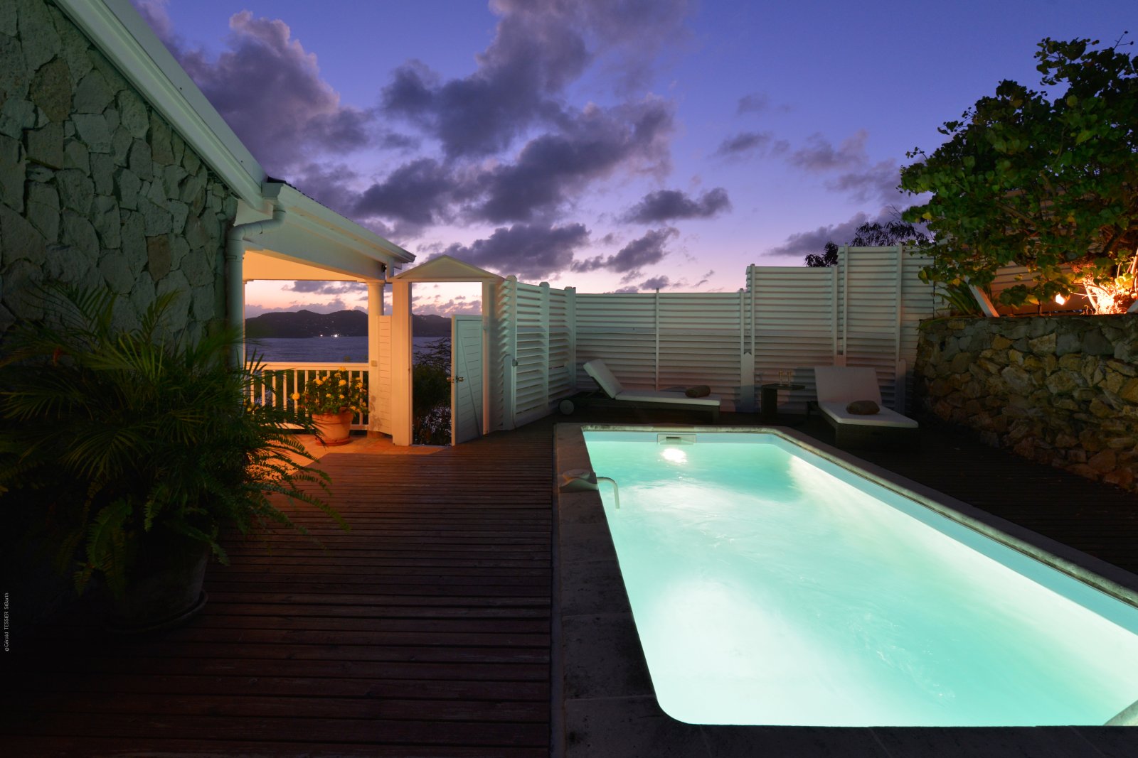 Guests spend more time on the pretty terrace that overlooks the magnificent view of Pointe Milou. Adjacent to the terrace is a small swimming pool. The villa is bright and cheery and totally screened.
