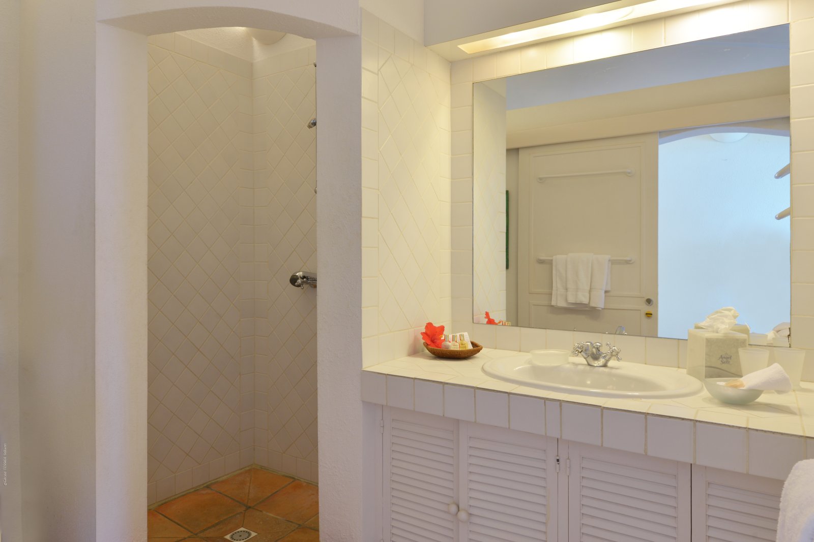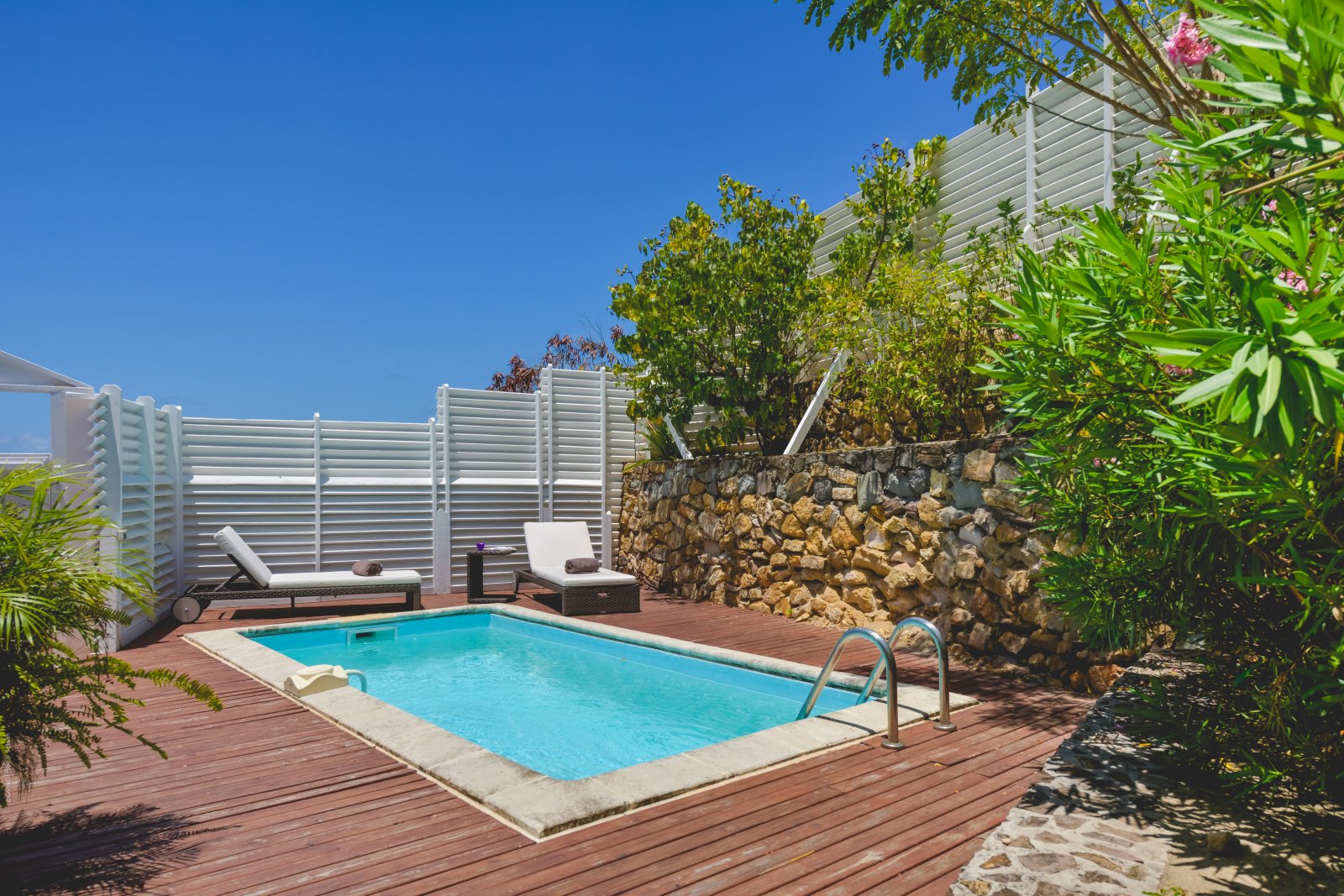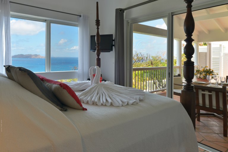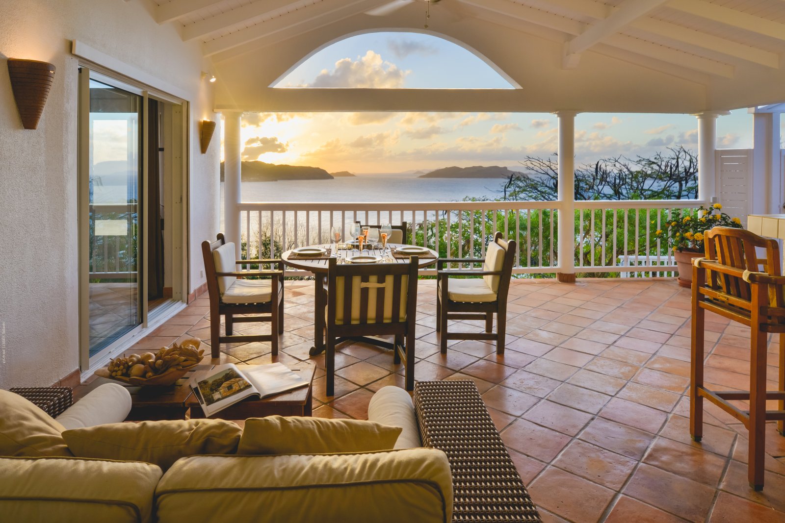 Guests spend more time on the pretty terrace that overlooks the magnificent view of Pointe Milou. Adjacent to the terrace is a small swimming pool. The villa is bright and cheery and totally screened.