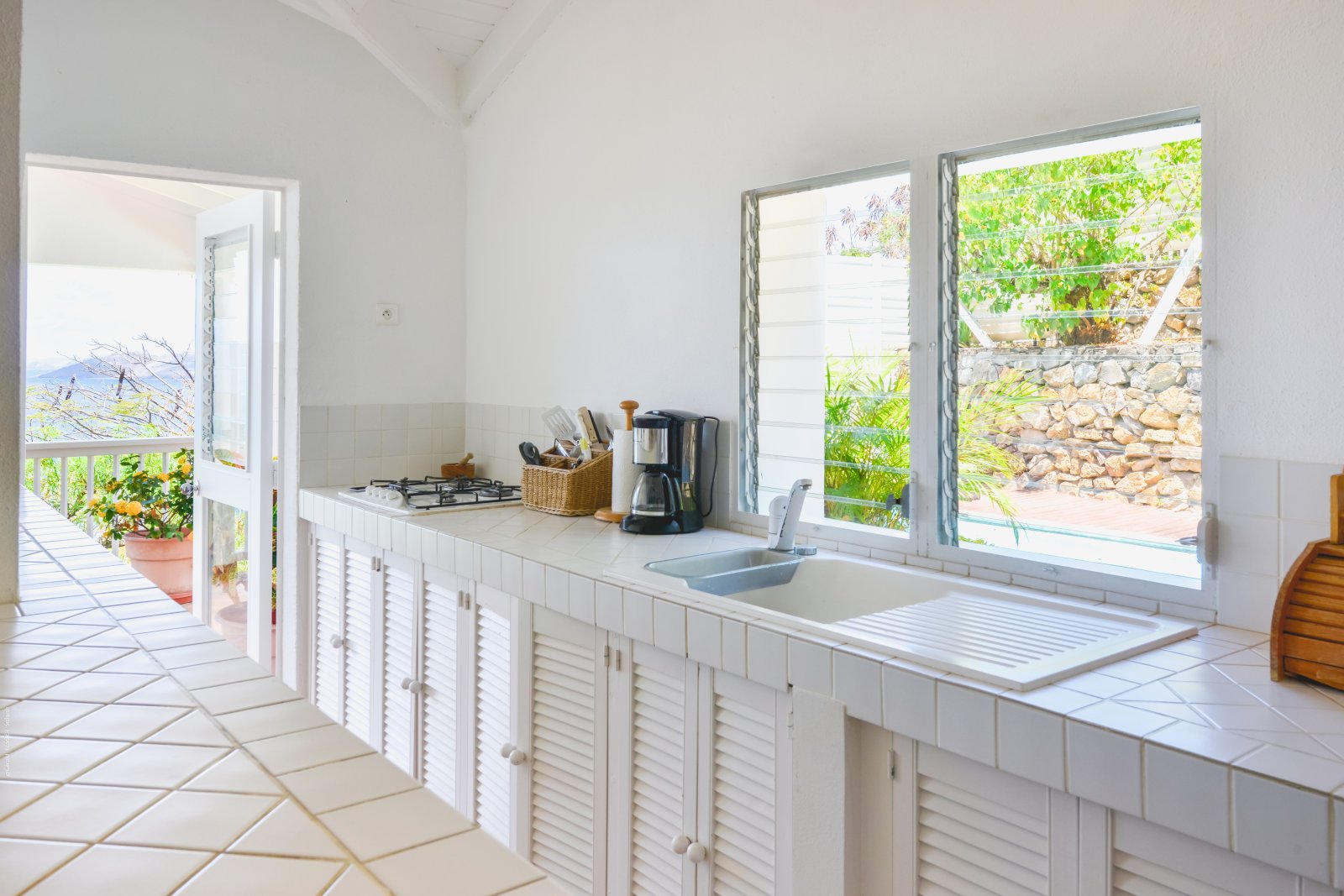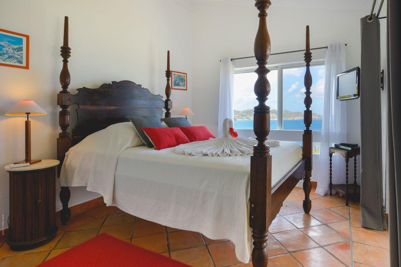 Located at the entrance to Pointe Milou is the charming Villa Colibri. The bedroom overlooks the ocean and comes furnished with a 4-poster bed with mosquito netting. The small living area is separated from the kitchen by a counter.