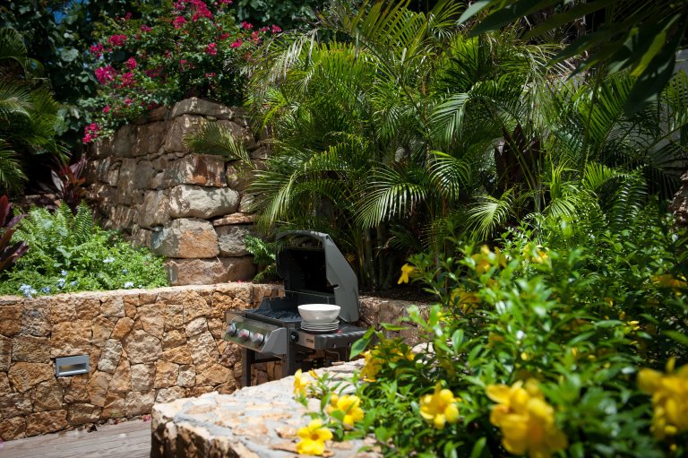 All four of the bedrooms are luxurious, making the villa a good choice for extended families with adult children or groups of friends traveling together. Three of the bedrooms are in freestanding pavilions on the upper level, accessible by the inside and outside. One is on the left side of the central living room, and the other two are on the right side. These two can be connected.