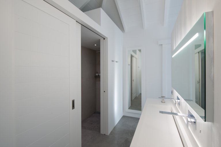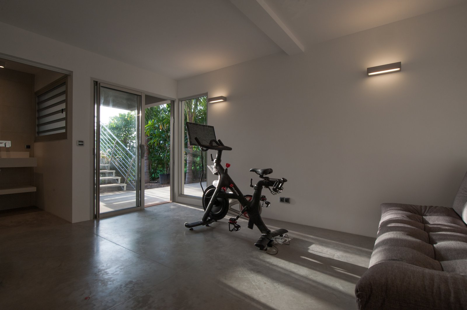 The fourth bedroom is downstairs next to the small fitness room. The former has another king bed and a private terrace. The latter has a Peloton Bike, which offers many possibilities for working out.