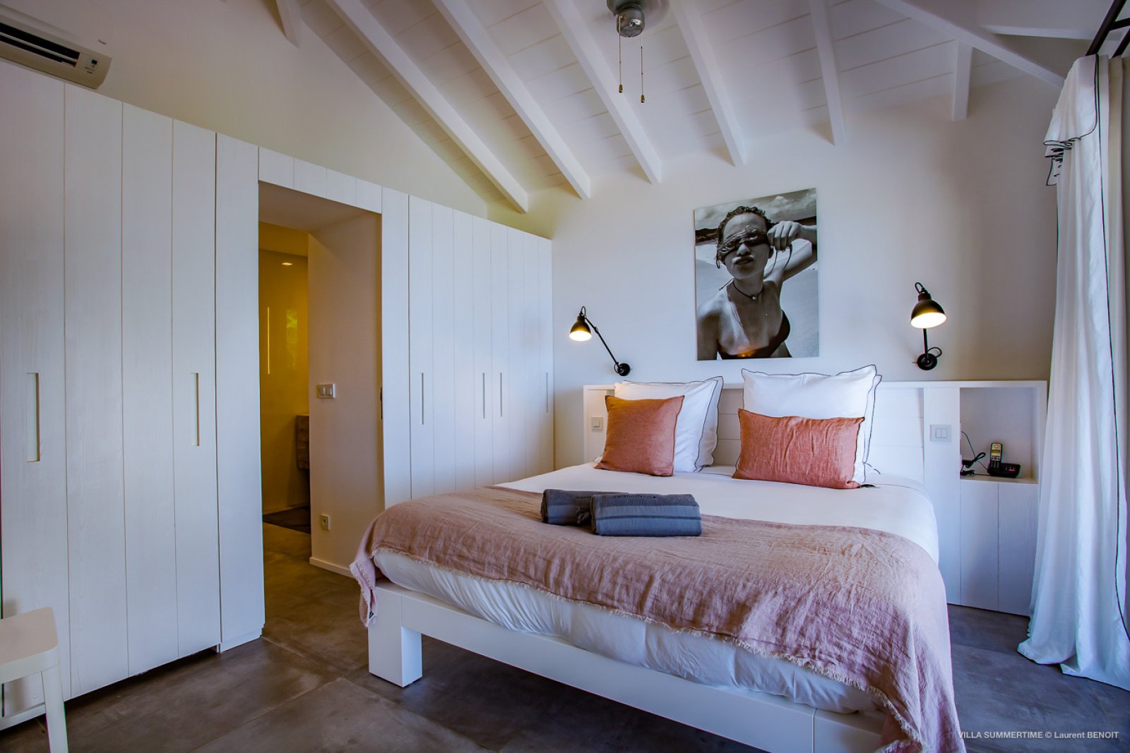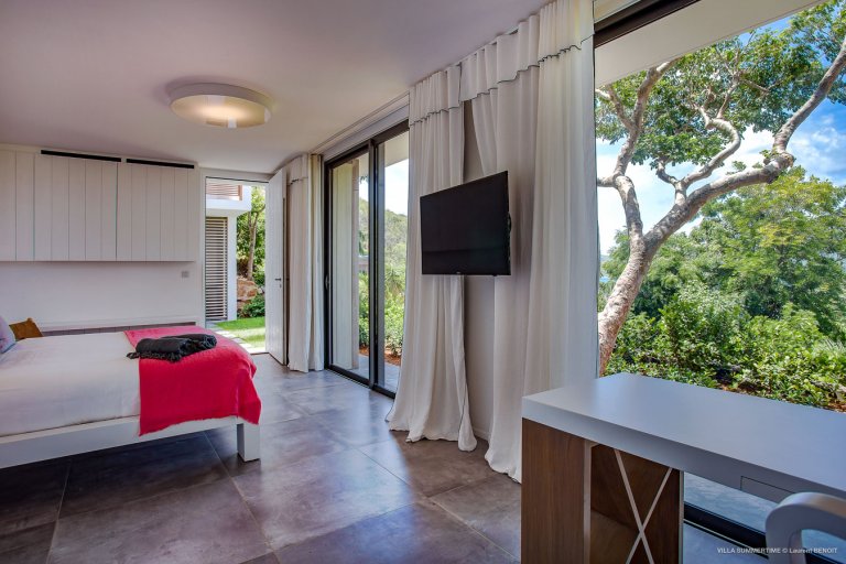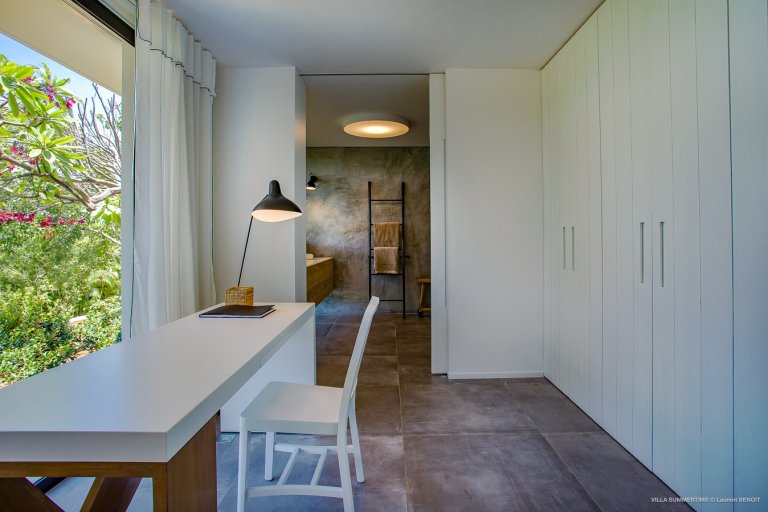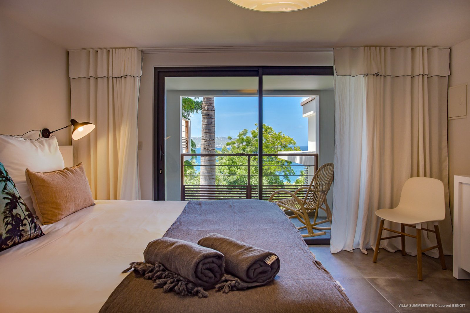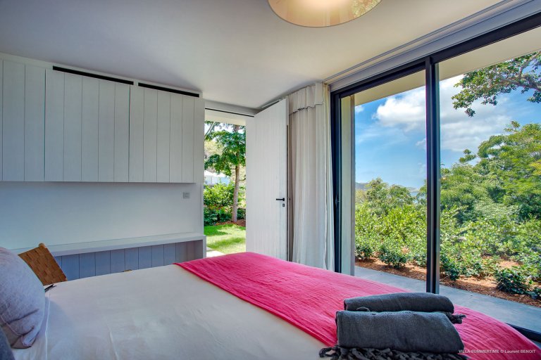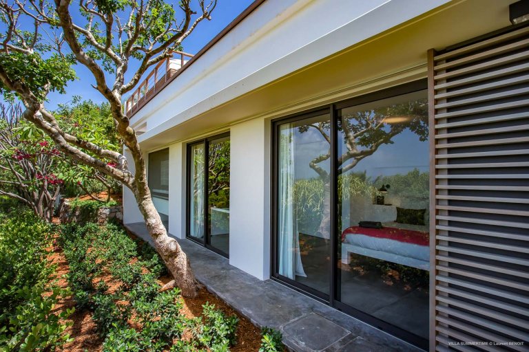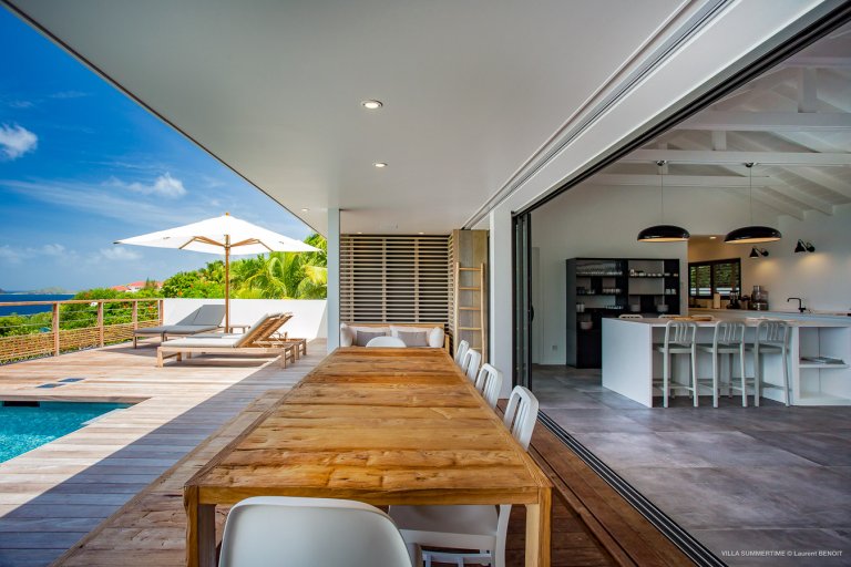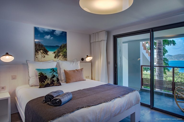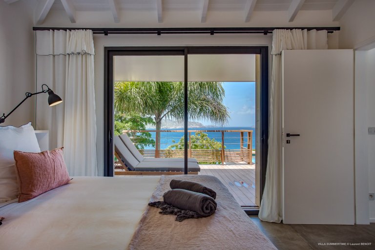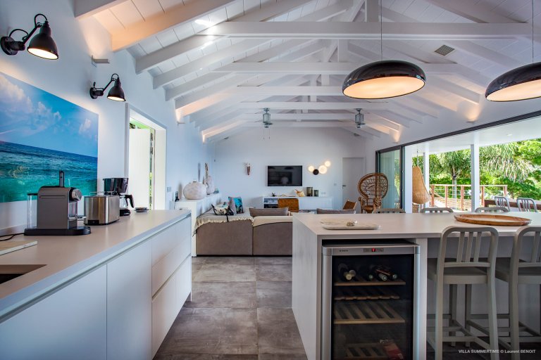 Fresh from a significant renovation, Villa Summertime abounds with island grace and charm. As with the summer itself, the luxury rental property is a place where the living is easy. Its airy, light-filled rooms are designed with neutral materials, which serve as an elegant backdrop for more eclectic, playful elements such as antique furniture, screen-printed cushions that match the blue sky and palm trees outside, and large-scale photography that includes a très St. Barth portrait of a girl pouting on the beach.
