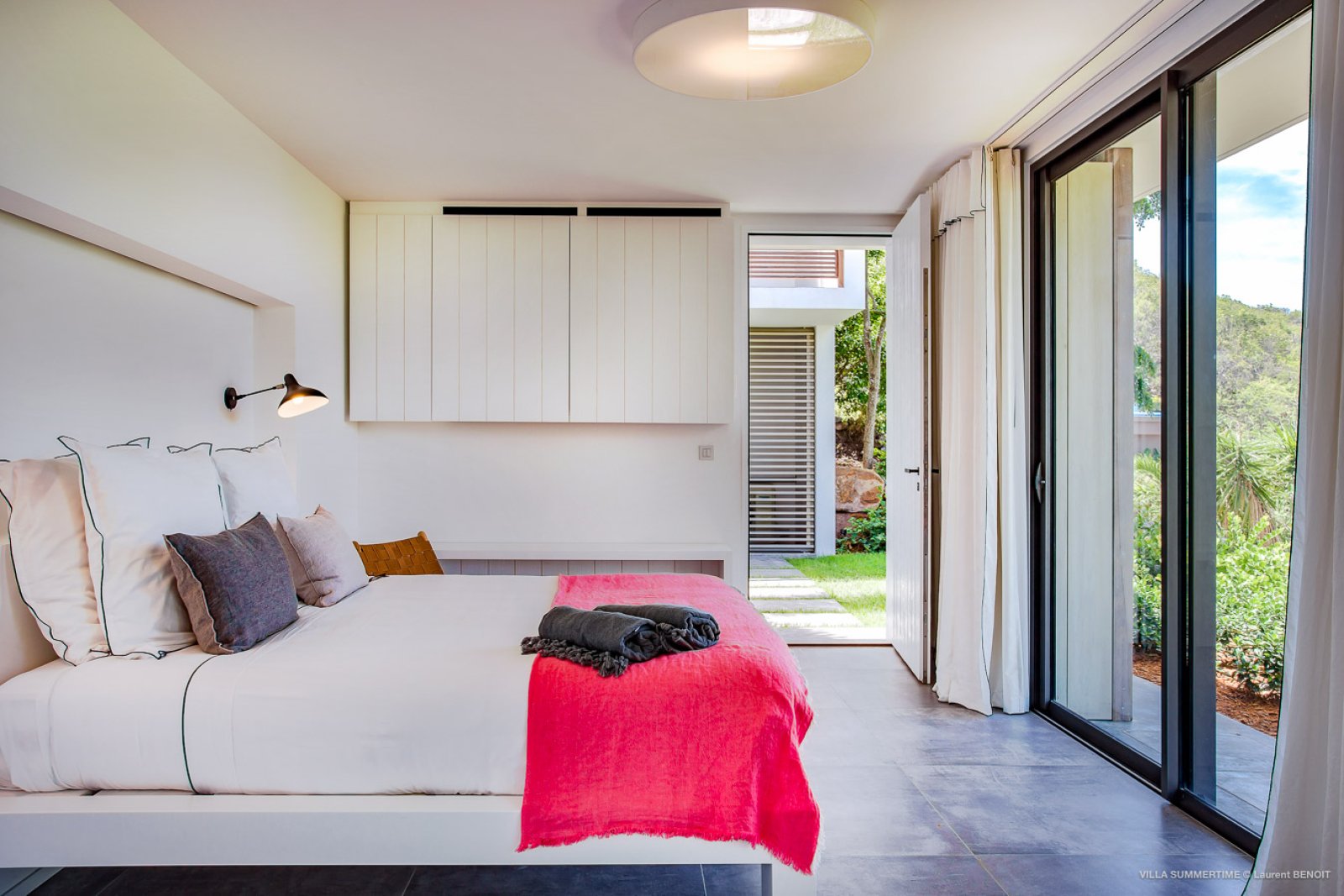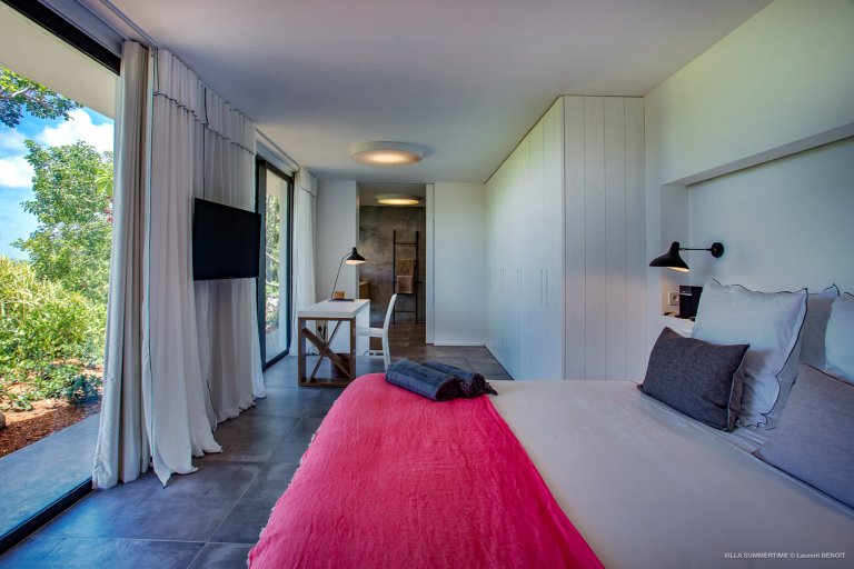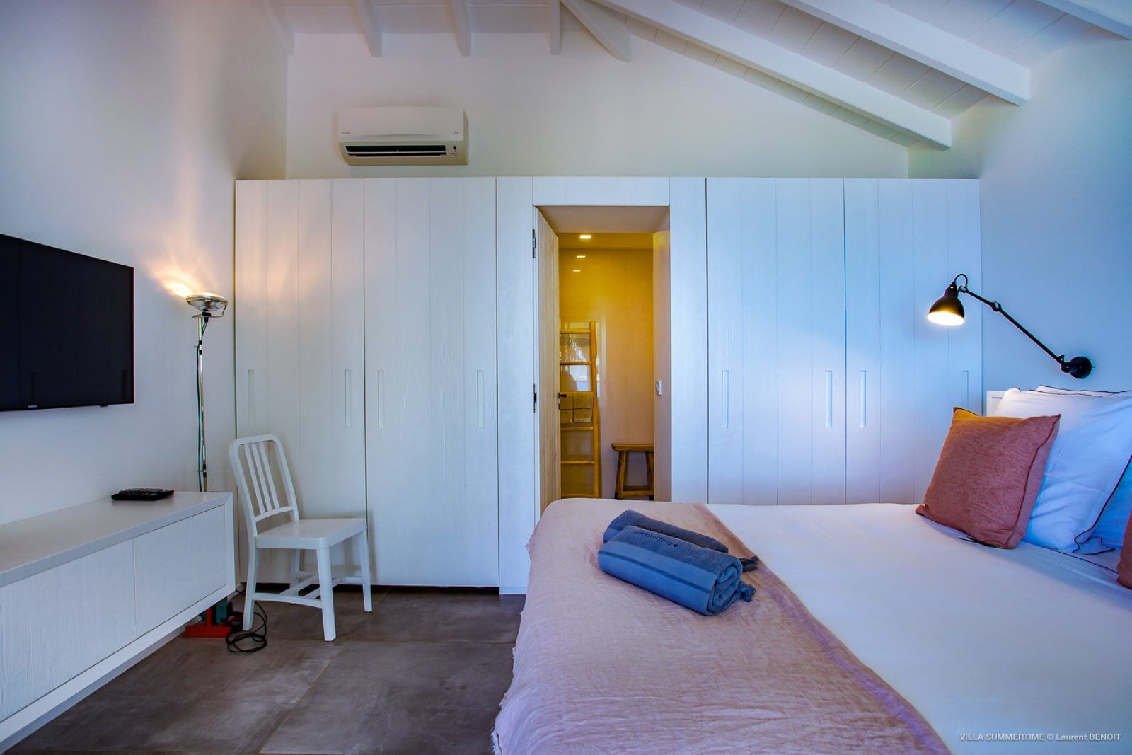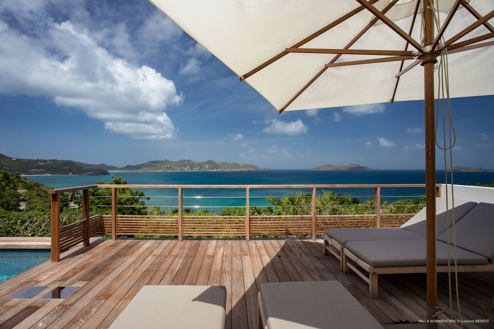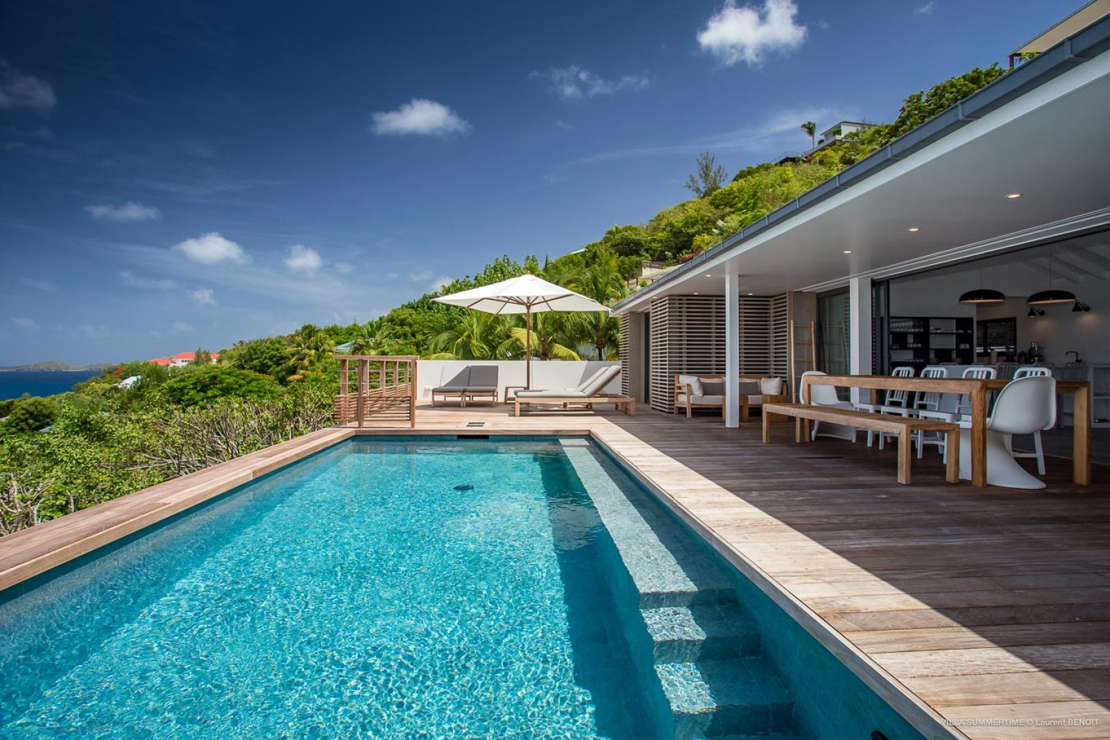 Fresh from a significant renovation, Villa Summertime abounds with island grace and charm. As with the summer itself, the luxury rental property is a place where the living is easy. Its airy, light-filled rooms are designed with neutral materials, which serve as an elegant backdrop for more eclectic, playful elements such as antique furniture, screen-printed cushions that match the blue sky and palm trees outside, and large-scale photography that includes a très St. Barth portrait of a girl pouting on the beach.