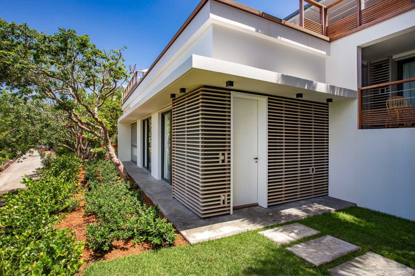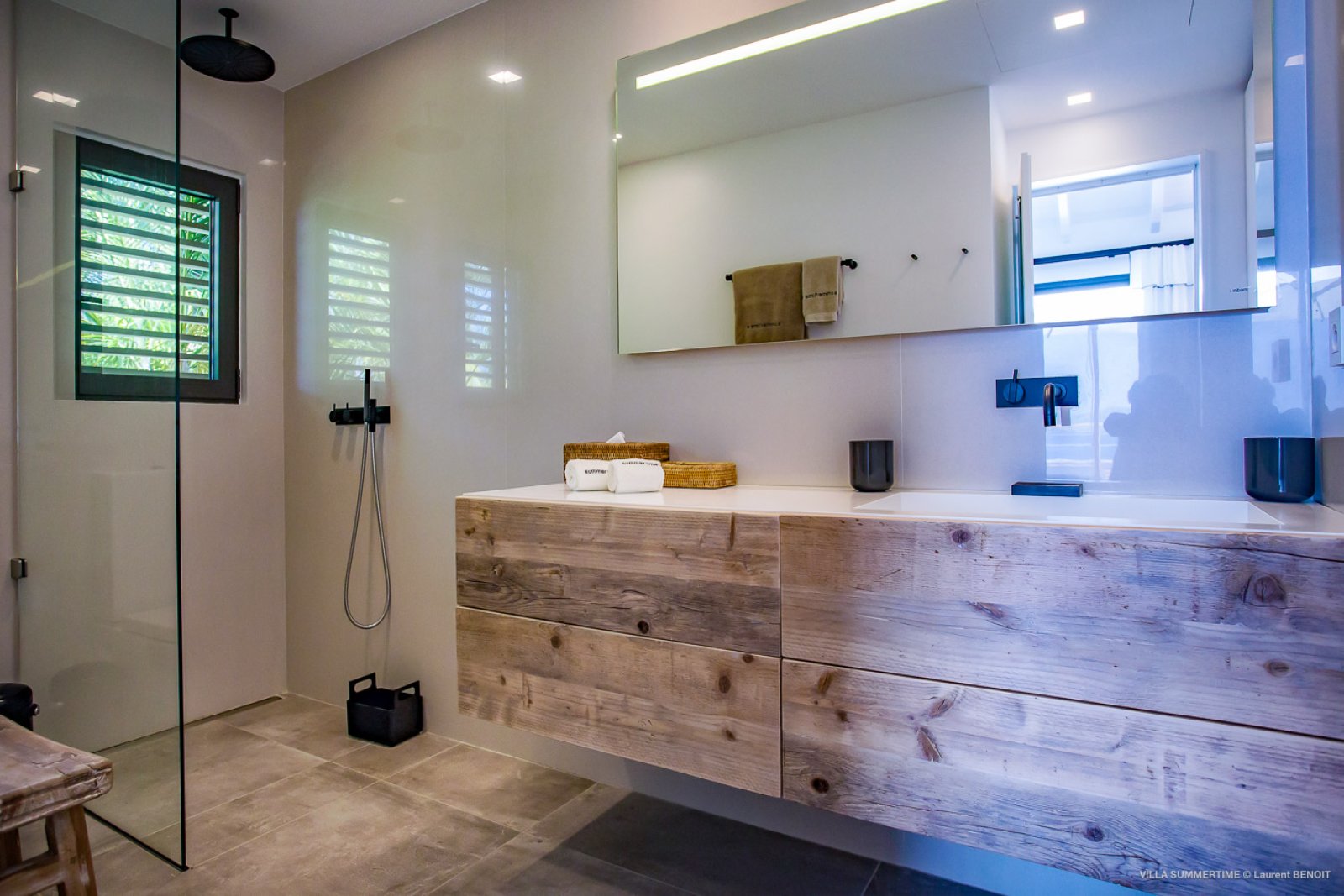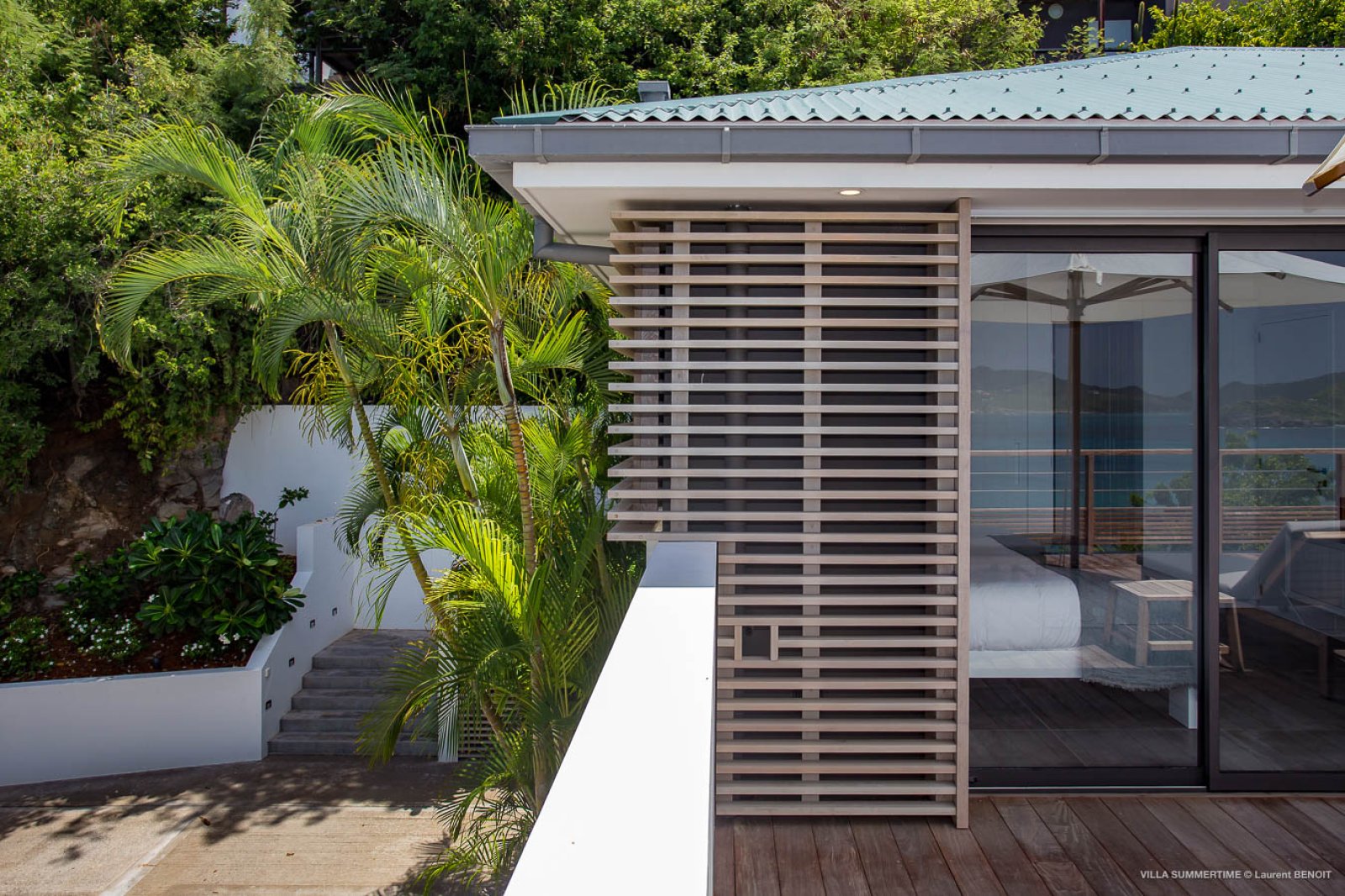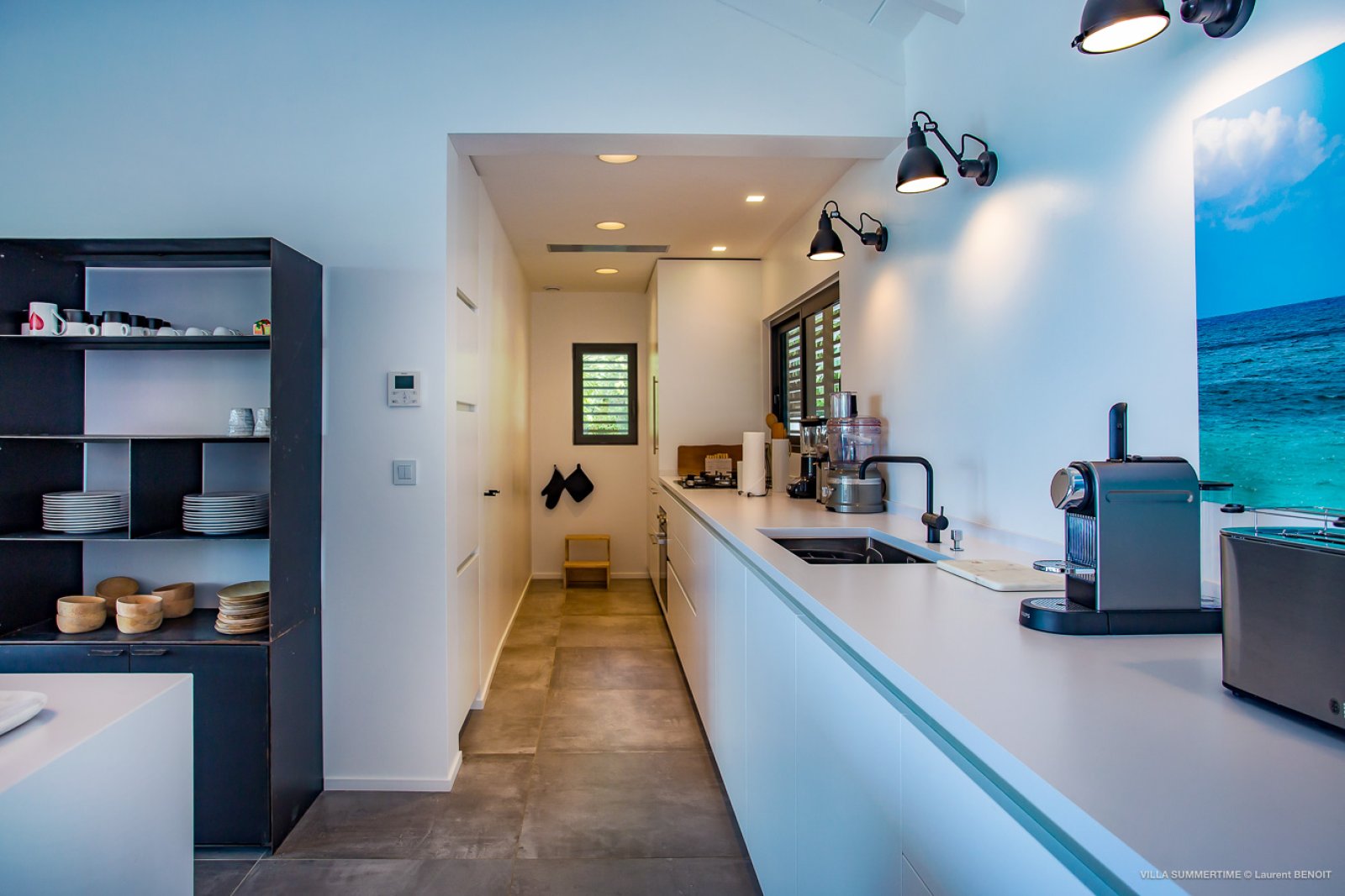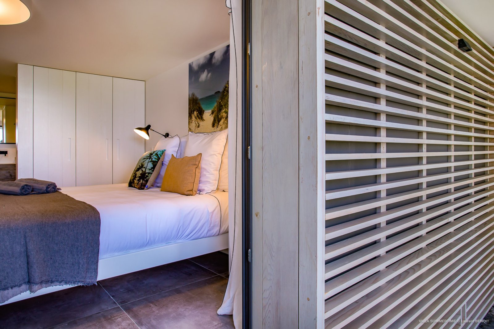 Fresh from a significant renovation, Villa Summertime abounds with island grace and charm. As with the summer itself, the luxury rental property is a place where the living is easy. Its airy, light-filled rooms are designed with neutral materials, which serve as an elegant backdrop for more eclectic, playful elements such as antique furniture, screen-printed cushions that match the blue sky and palm trees outside, and large-scale photography that includes a très St. Barth portrait of a girl pouting on the beach.