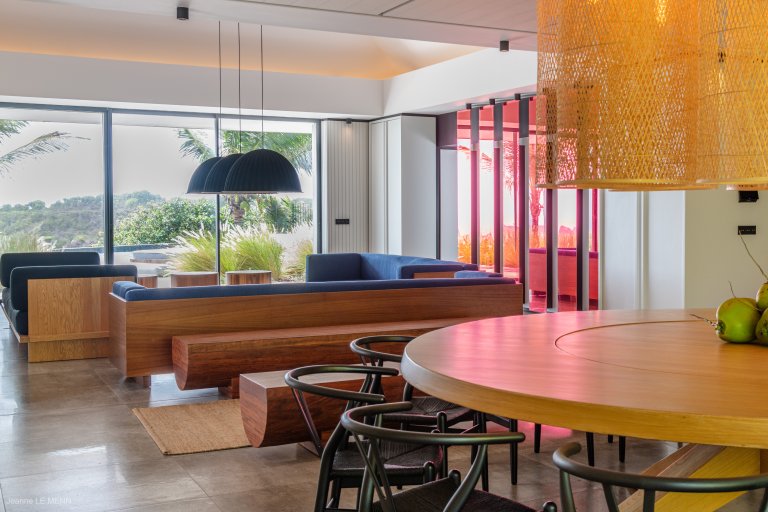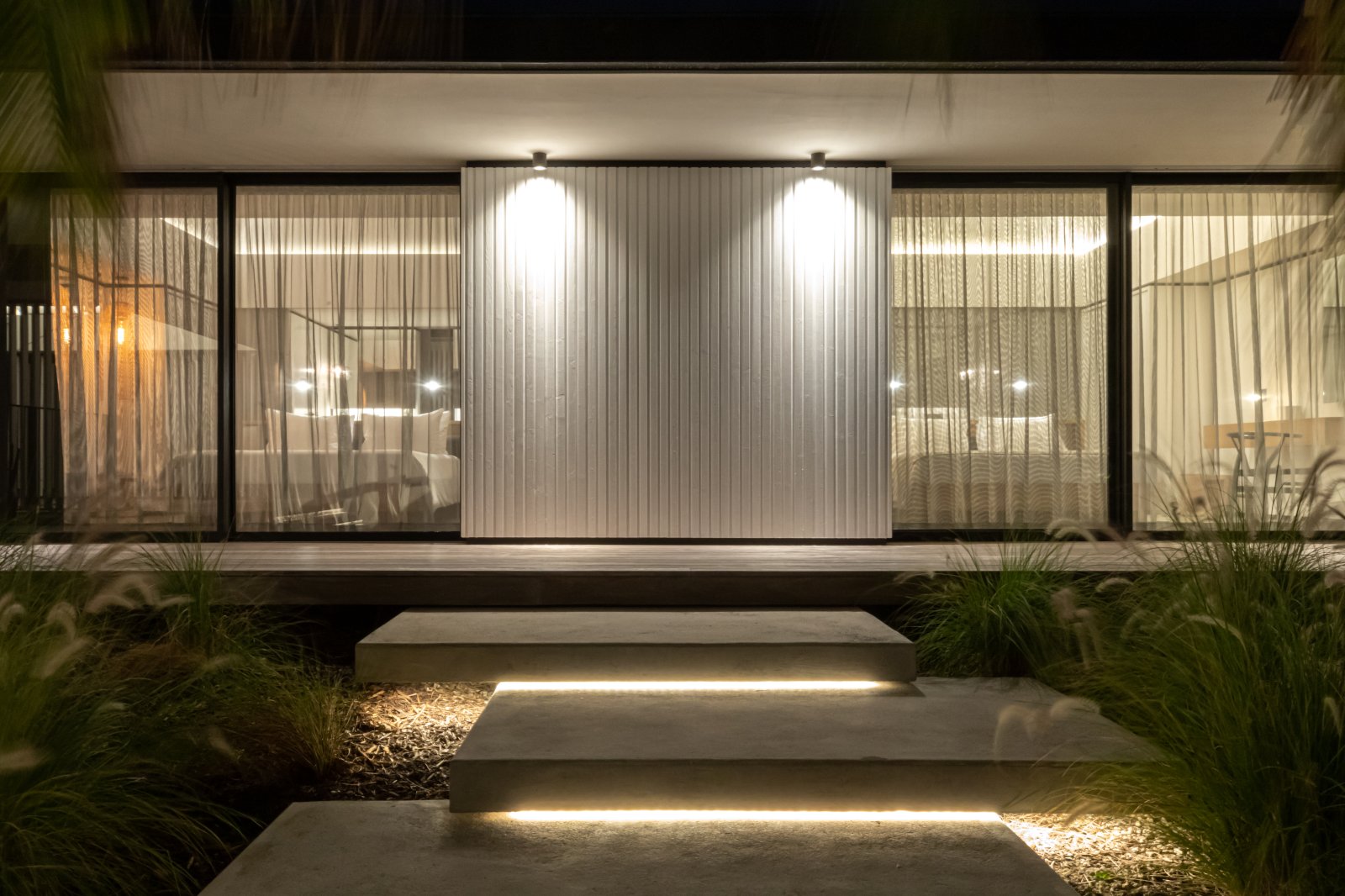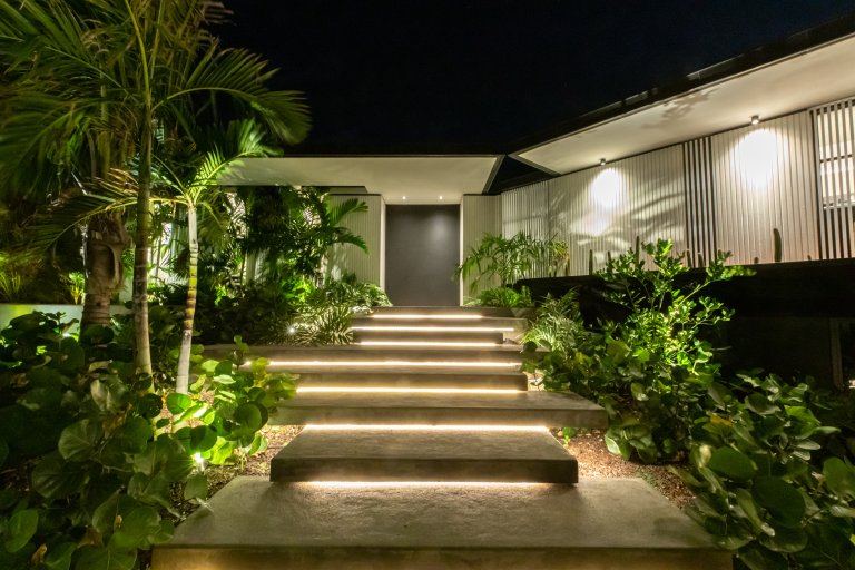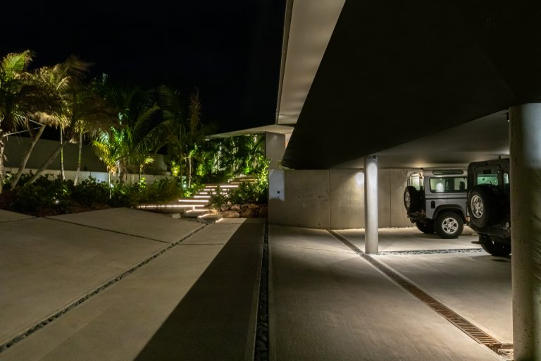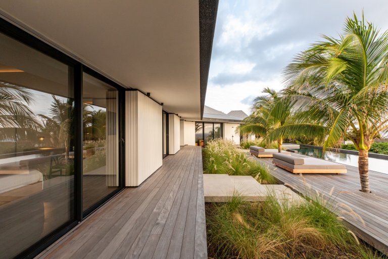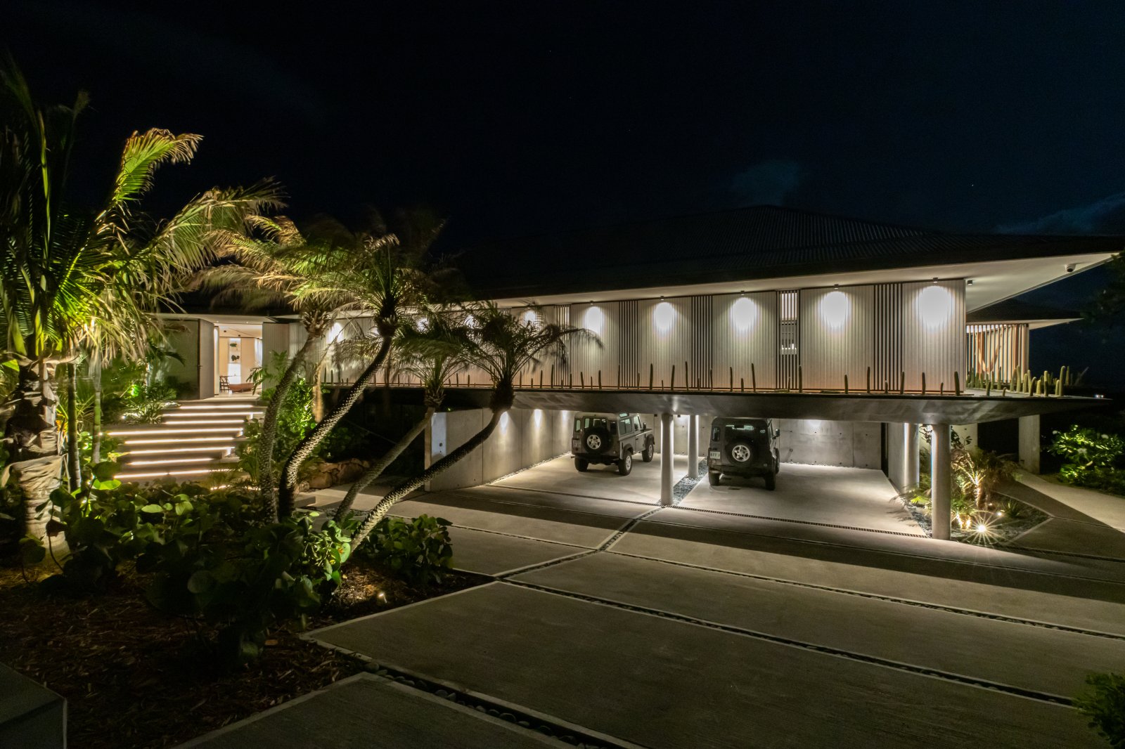The five-bedroom holiday house has sweeping views of the Atlantic to the east and is bathed in sunlight all day. That warm glow is a striking counterpoint to the modern and high-end design and fittings. Outside the entrance, there is a juxtaposition of large and smooth concrete steps and appealingly lush landscaping and greenery.