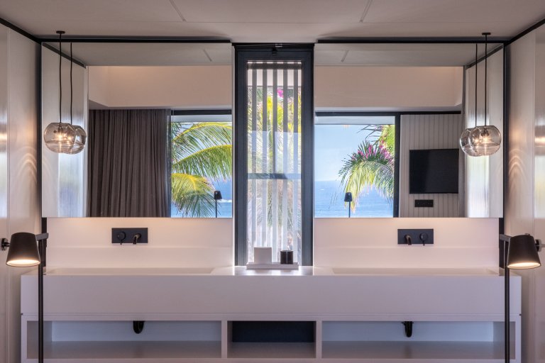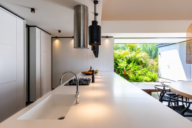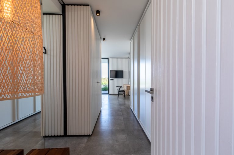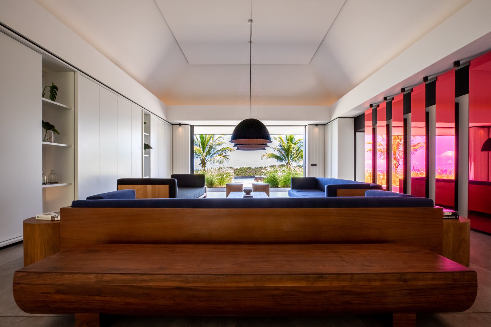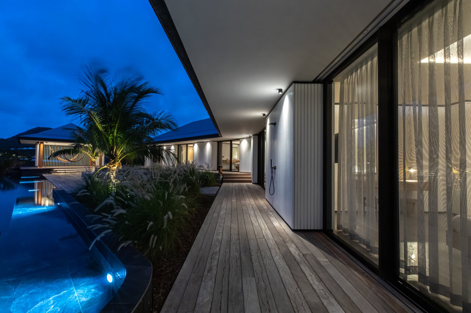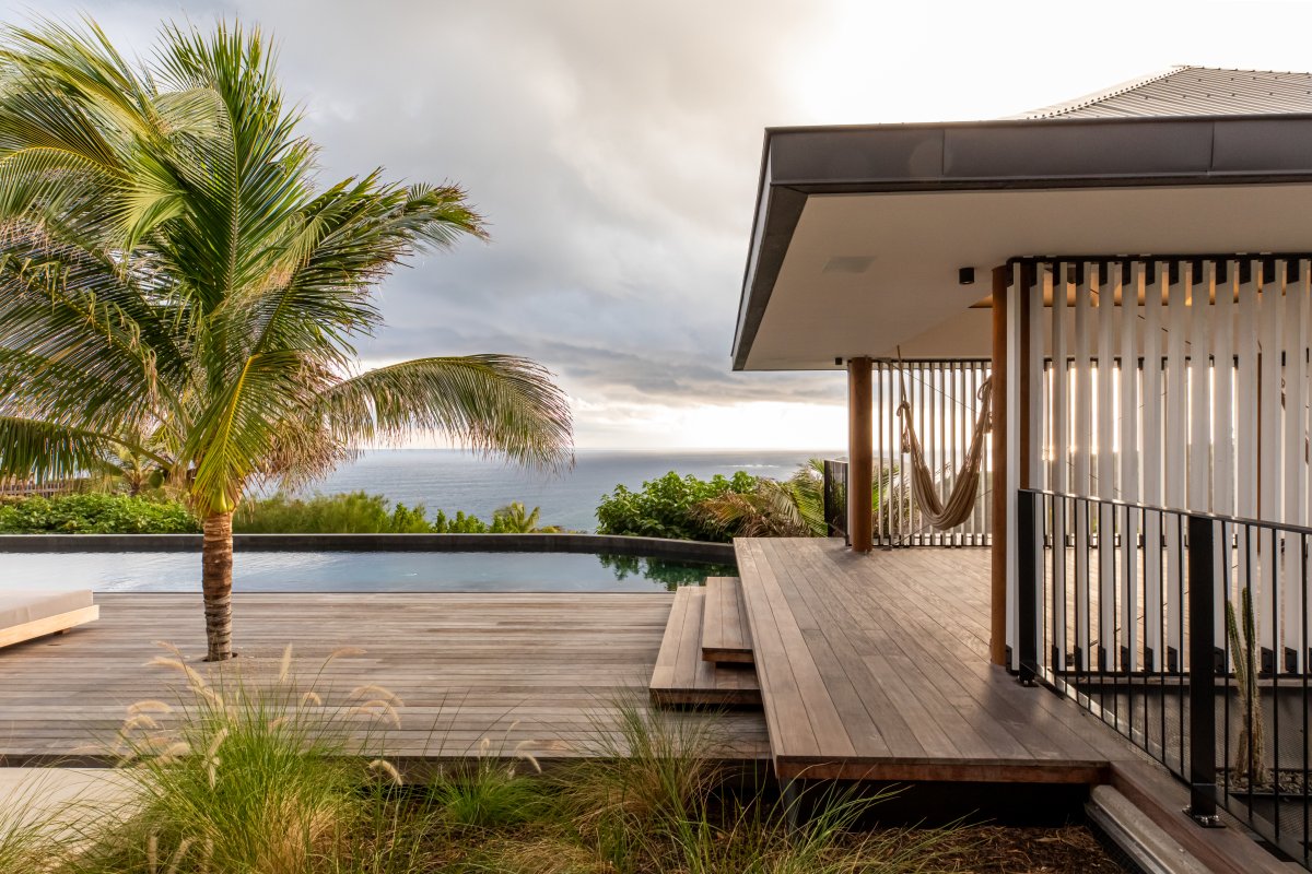 The five-bedroom holiday house has sweeping views of the Atlantic to the east and is bathed in sunlight all day. That warm glow is a striking counterpoint to the modern and high-end design and fittings. Outside the entrance, there is a juxtaposition of large and smooth concrete steps and appealingly lush landscaping and greenery.