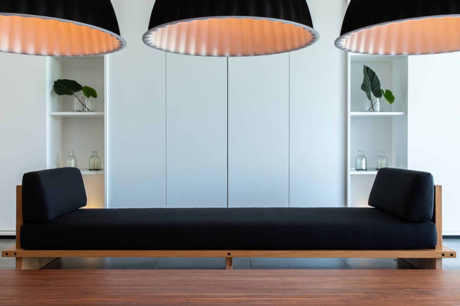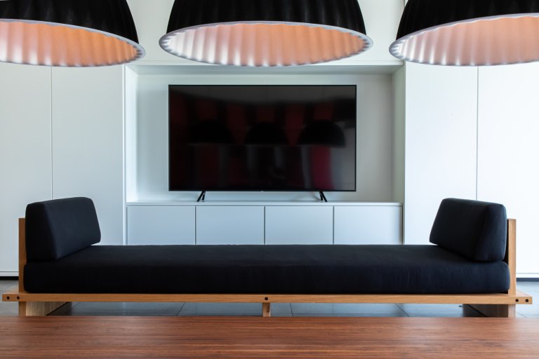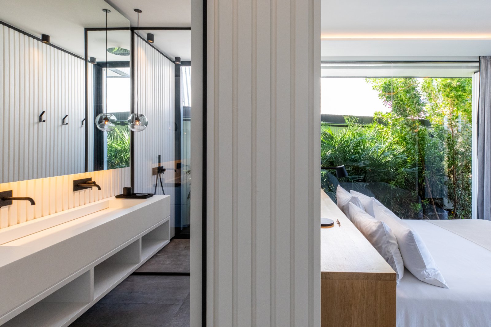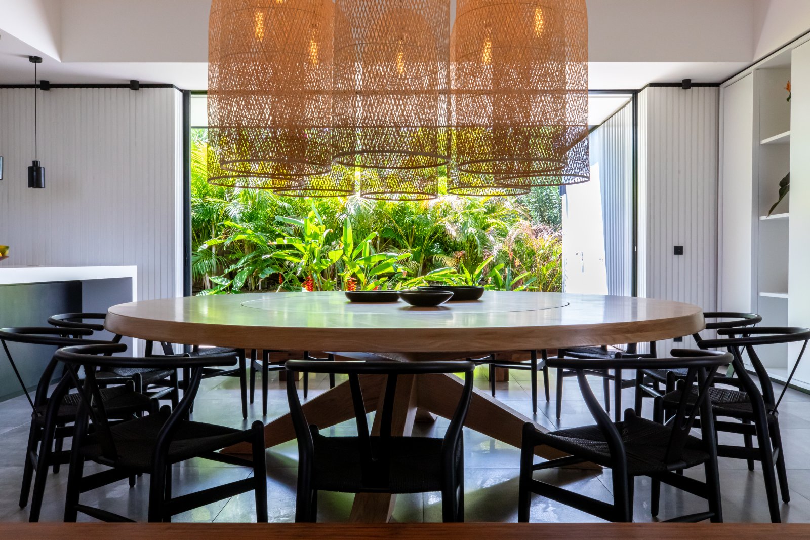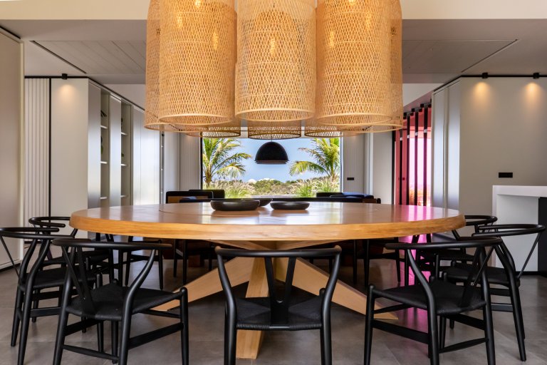 The owner of Villa Valentina (VIP) paid great attention to every detail of the significant early-2020 renovation, from the custom wood furniture, white vertical paneling, a circular dining table that seats 16 people and has a rotating center, Tom Dixon lamps glowing in pairs in the bathrooms. There are blackened-steel finishes throughout the house custom-built closets, and an 80-foot-long gray granite swimming pool made for sunbathing, laps, and play.