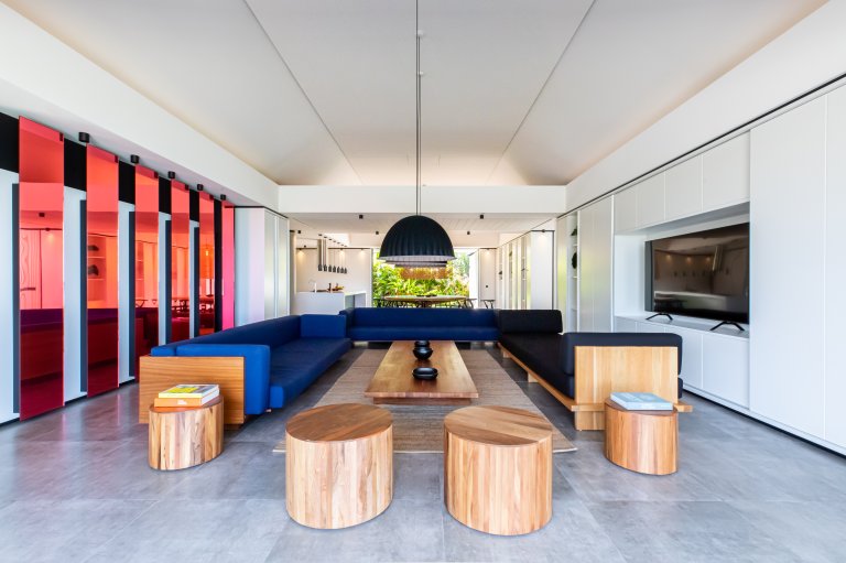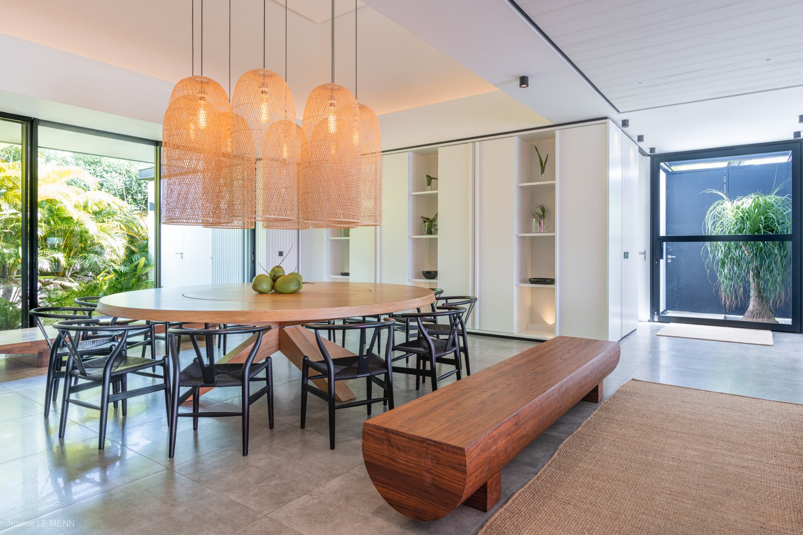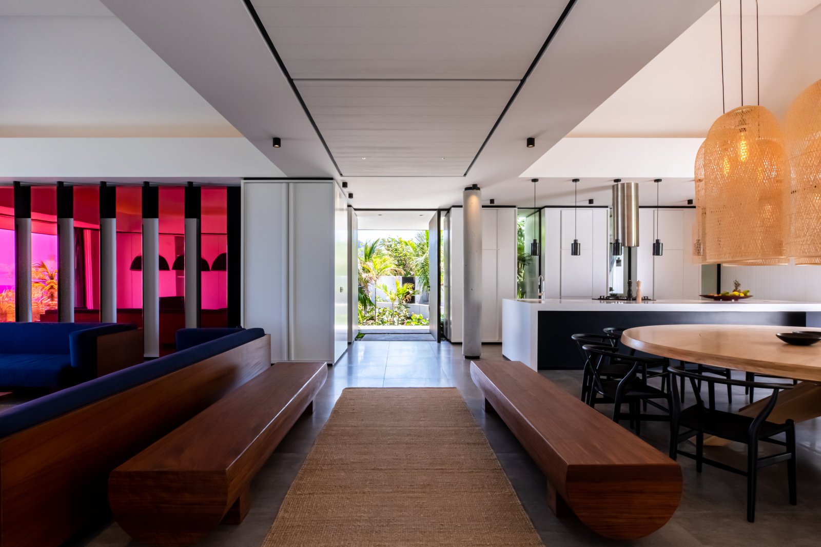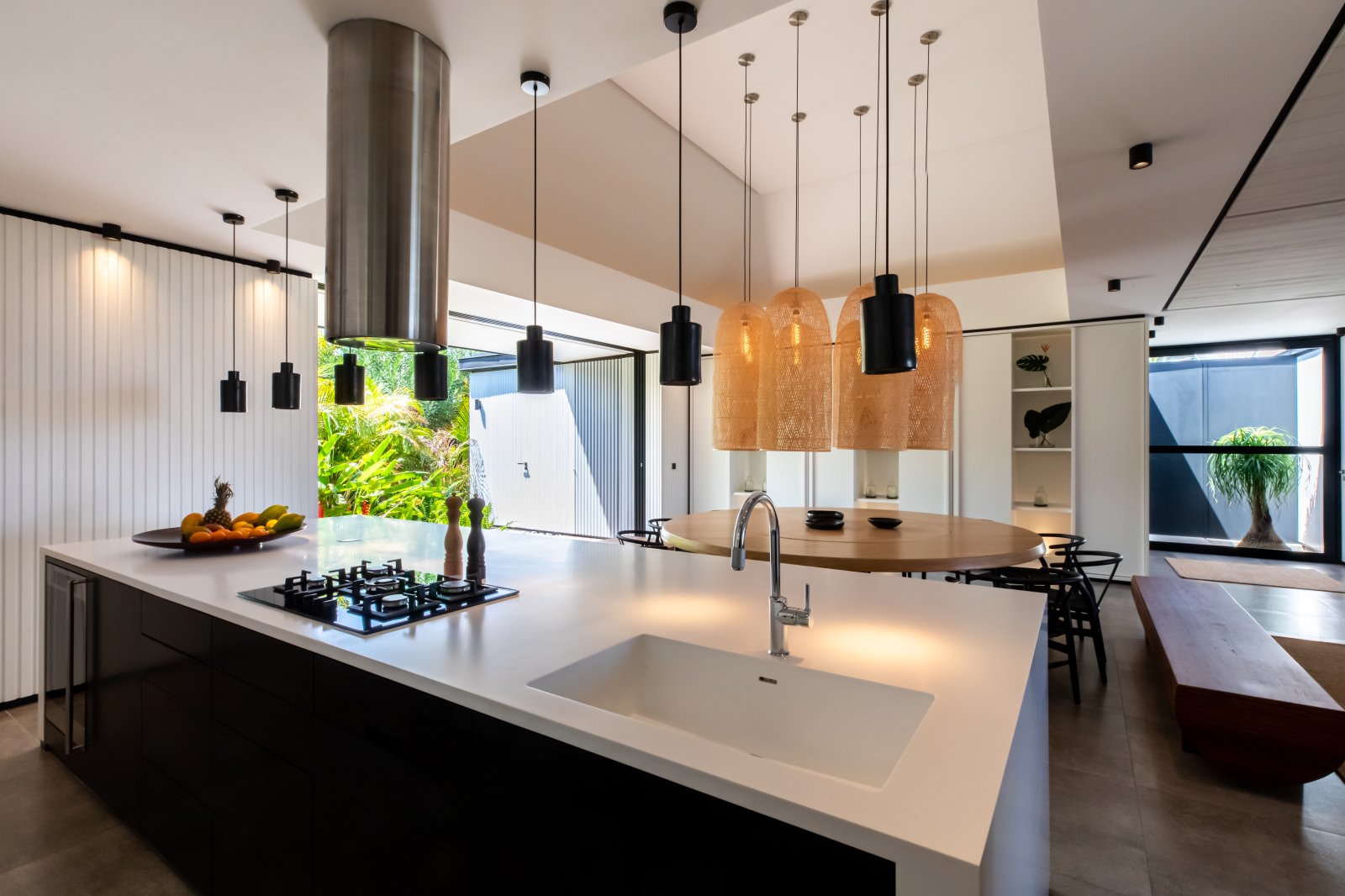The home is made for entertaining, with its open layout and grand living room with double-height ceilings. This room is divided evenly between the dining area and the lounge area, and it is equipped with a Sonos sound system and air-conditioning. There are two kitchens, one everyday use and the other for a private chef or catering with a total of four refrigerators and two dishwashers.