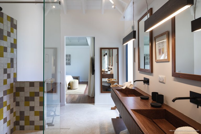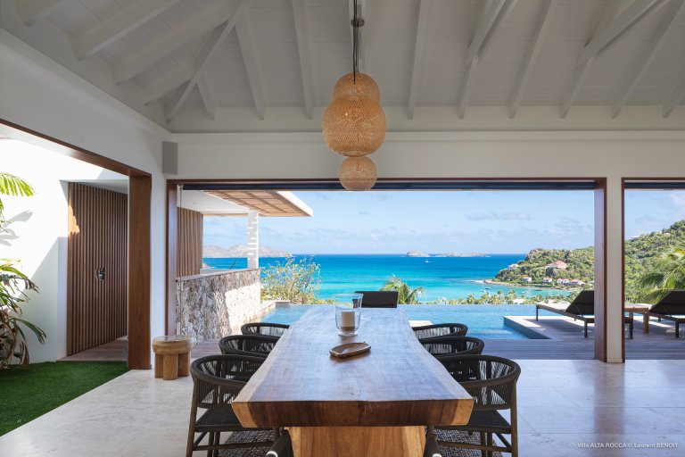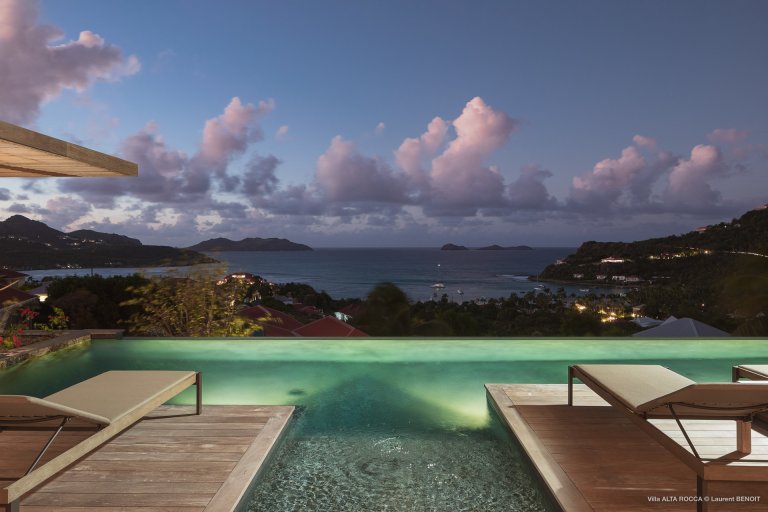 Among the many charms of the newly built Villa Alta Rocca (OCA) is its enviable location. As the name suggests, it’s a high fortress, situated up the hill from Nikki Beach in St. Jean. This means that when you choose this luxury rental property, it’s an easy walk down to the beach, or to the boutiques, restaurants, and social life of St. Jean.