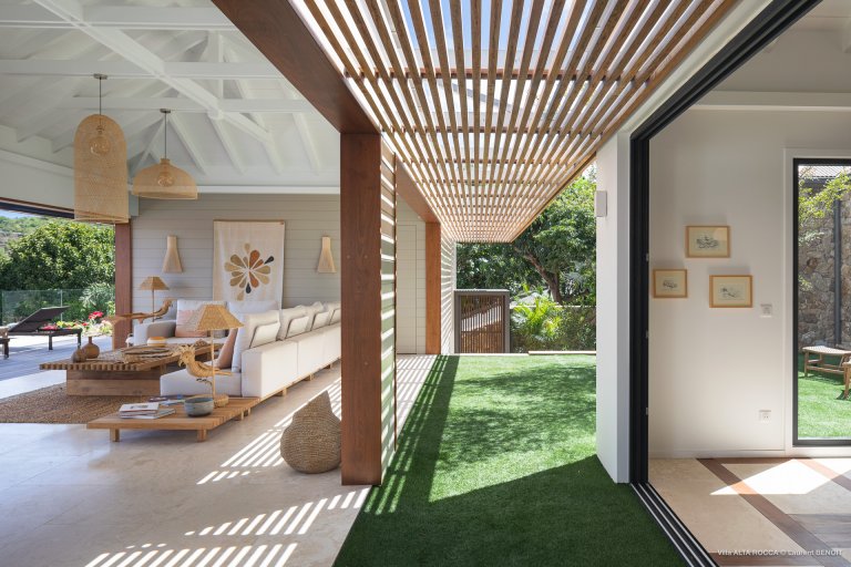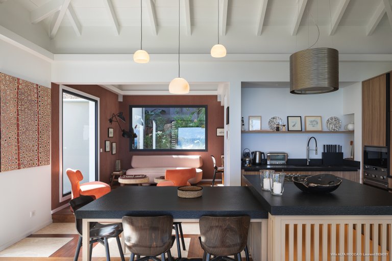 The design of Villa Alta Rocca is simultaneously warm, cozy and comfortable, and also contemporary and full of character. It practically drips with modern St. Barth charm, especially in the convivial wooden kitchen, which takes full advantage of the beautiful view.