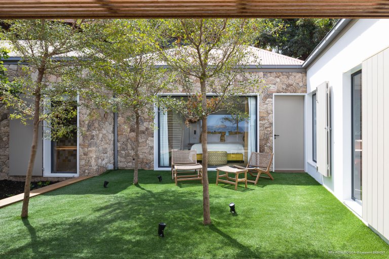Each of the three bedrooms has its own name, reflective of its special character. The one called Caraîbe is off to the right side of the outdoor living area. Afrique is off to the left side, near the swimming pool. The third bedroom, called Imprévue, is in the back in its own private bungalow. Each bedroom has a king-size bed (or twins that can be converted into a king), air-conditioning, HDTV with multiple programming options, private access, and an ensuite bathroom with a rain shower.
