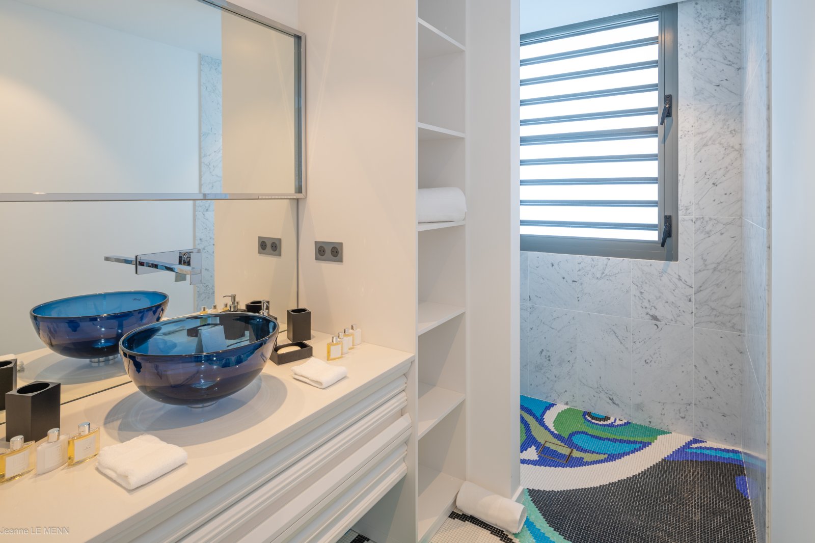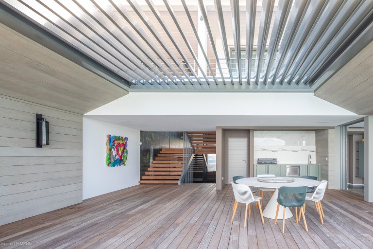 The primary bedroom is on the same level as the living areas and has its own private entrance from the pool deck. The second bedroom on this floor is situated next to the living area and kitchen. The remaining two bedrooms, on the top floor, can be connecting. Each bedroom has an ensuite bathroom.