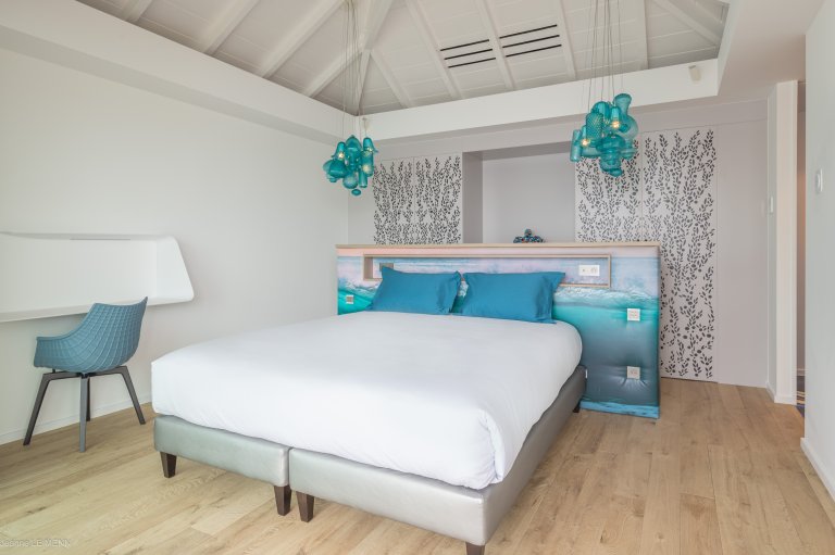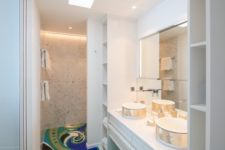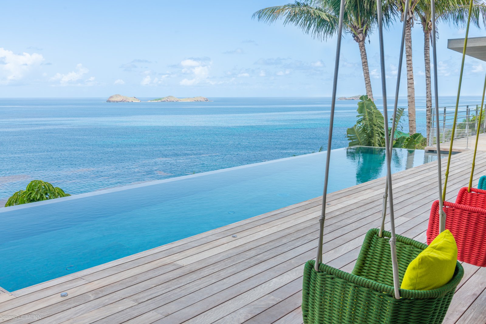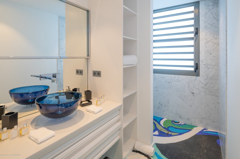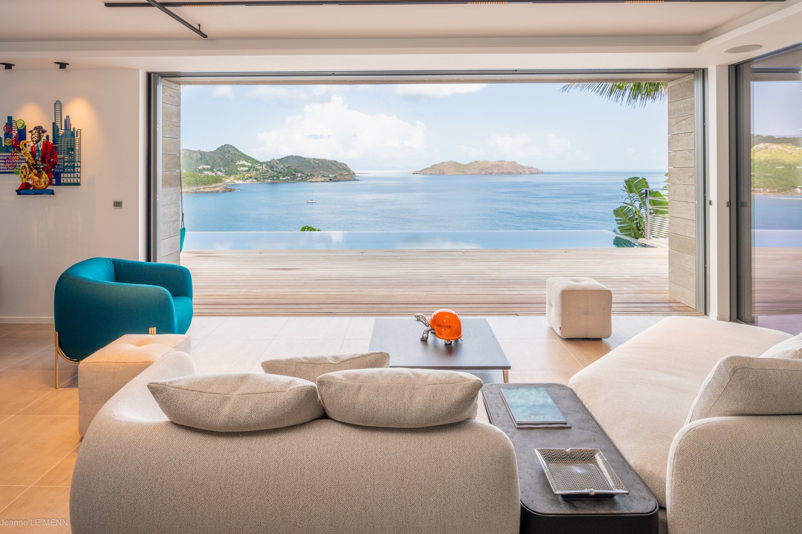 The newly built Villa Honu (HON) is a maximalist playground, with a contemporary design that’s full of whimsy and pops of color like the bucket swing chairs on the terrace beside the pool, the orange and silver turtle on the coffee table, and chandeliers that appear to have been made with beach glass. The luxury rental property perfectly encapsulates the carefree spirit and commitment to style of St. Barth.