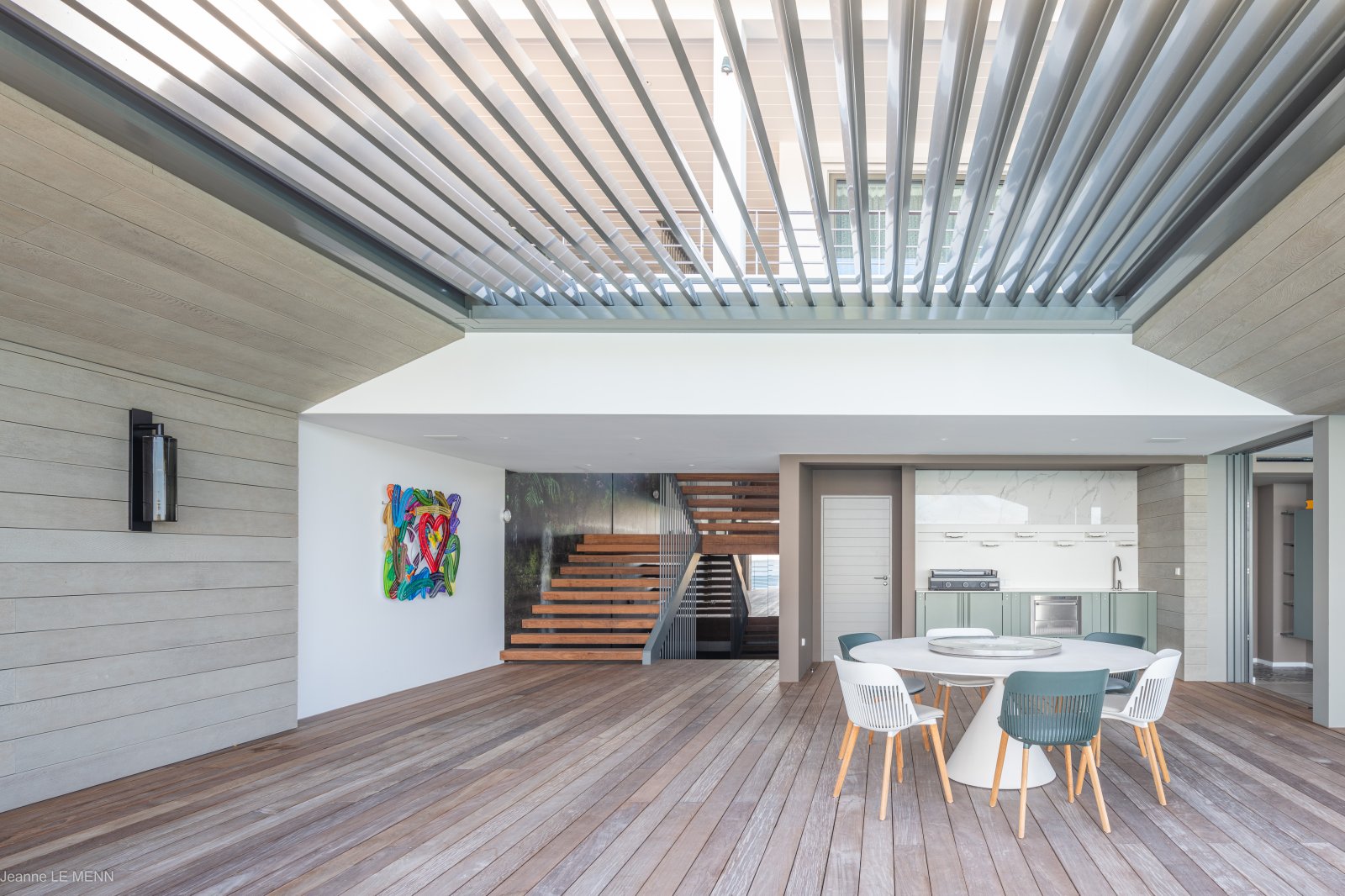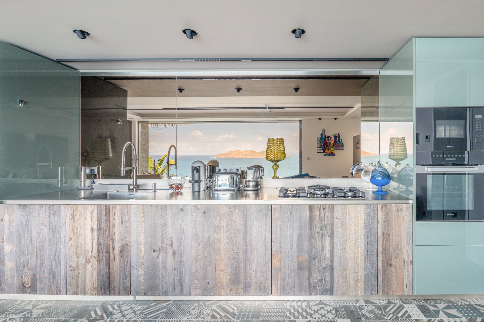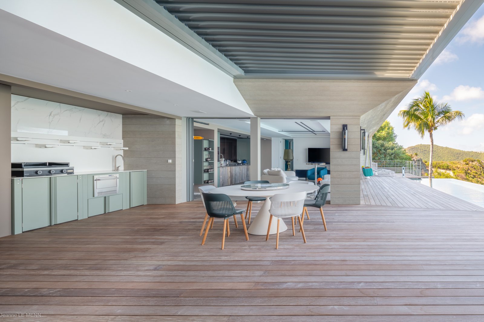 The living area has large, plush couches and a full wall of windows with a sea view, which can be opened to allow the island breezes to waft in, and to connect the living area to the terrace, with its covered outdoor dining area and kitchen, as well as the heated infinity pool. The main kitchen is tucked in the back, along one wall of the living room.