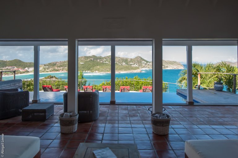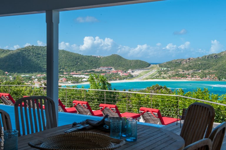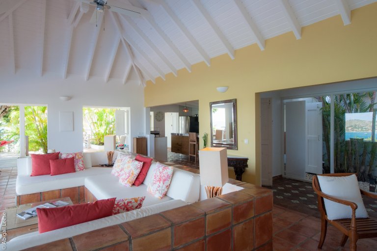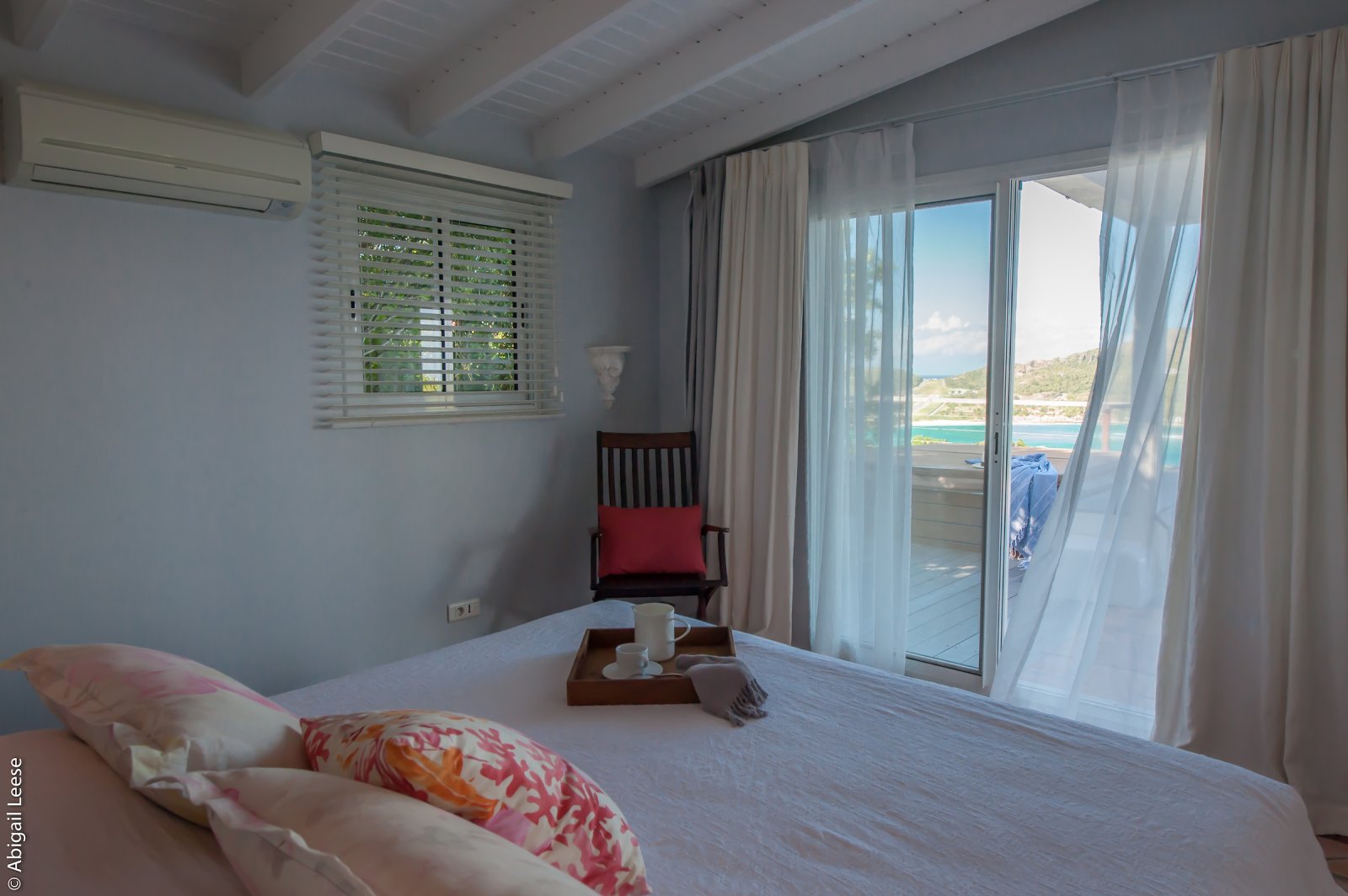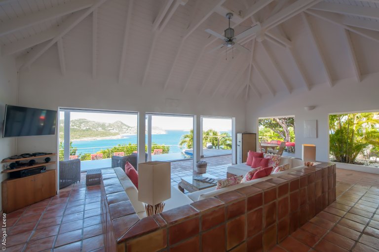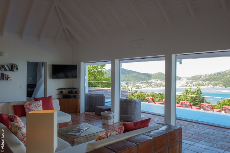 With a wonderful panoramic view over St. Jean Bay, Villa Ker Anna (AKA) is a color-filled dream both inside and out. The blue Atlantic Ocean stretches off toward St. Maarten on the horizon, the green leaves of palm and gaiac sway in the breeze, and the interior of this delightful home is decorated in bright Caribbean hues. The main living area opens onto the covered terrace and sun-drenched pool and deck. Villa Ker Ana's three bedrooms all have private ensuite baths and all enjoy the magnificent view.