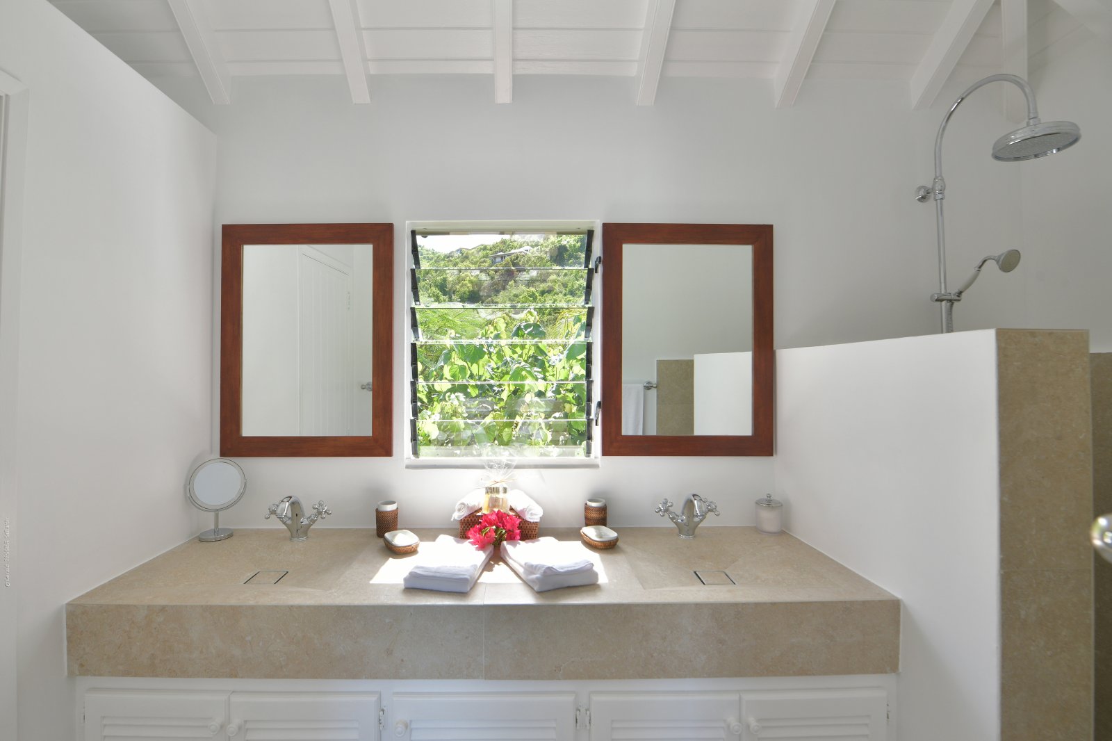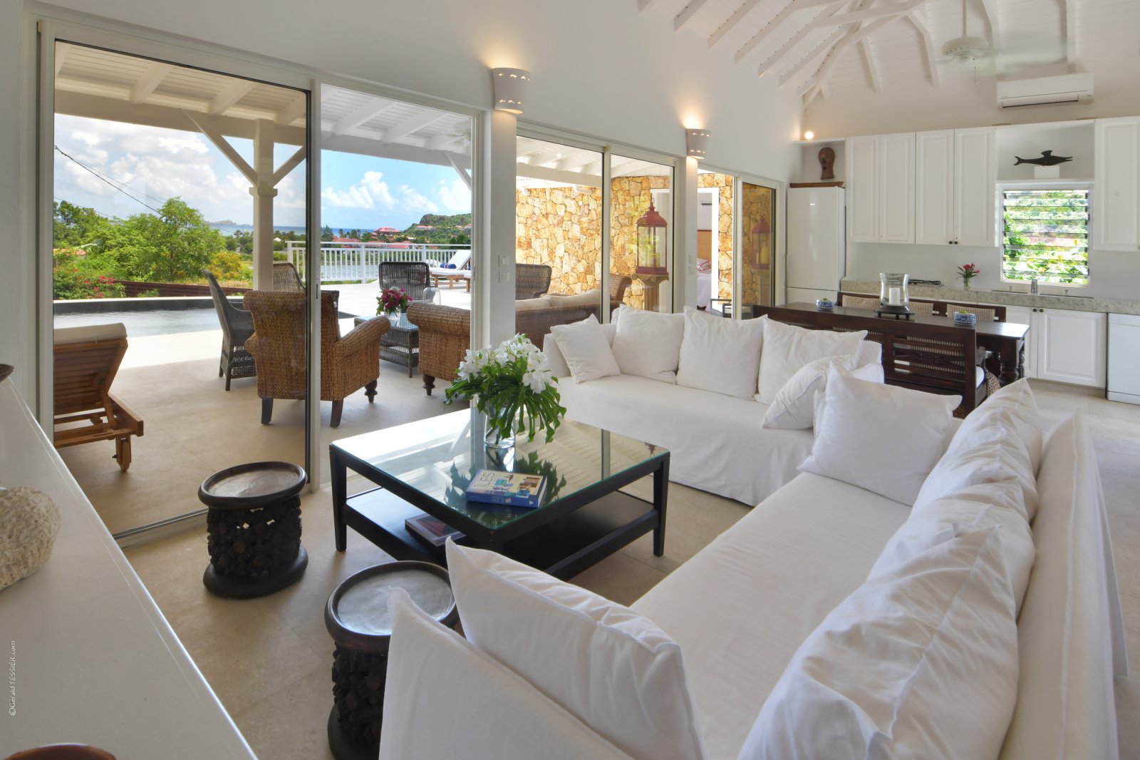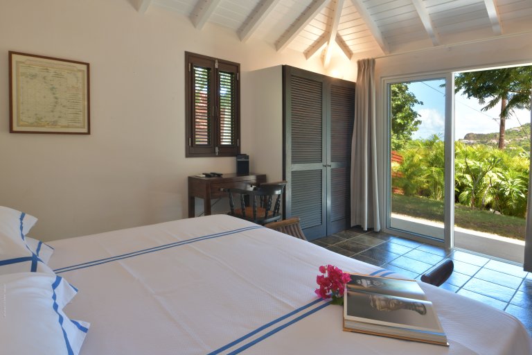 Villa Kir Royal is set amid a verdant tropical flower garden, ensuring green views from every turn. Beyond that, the bay of St. Jean, Frigate Island, and the Atlantic Ocean shimmer in the sunlight.