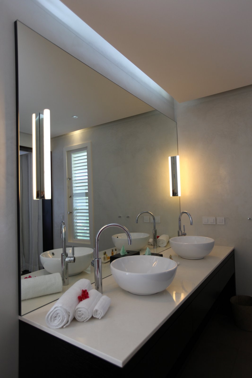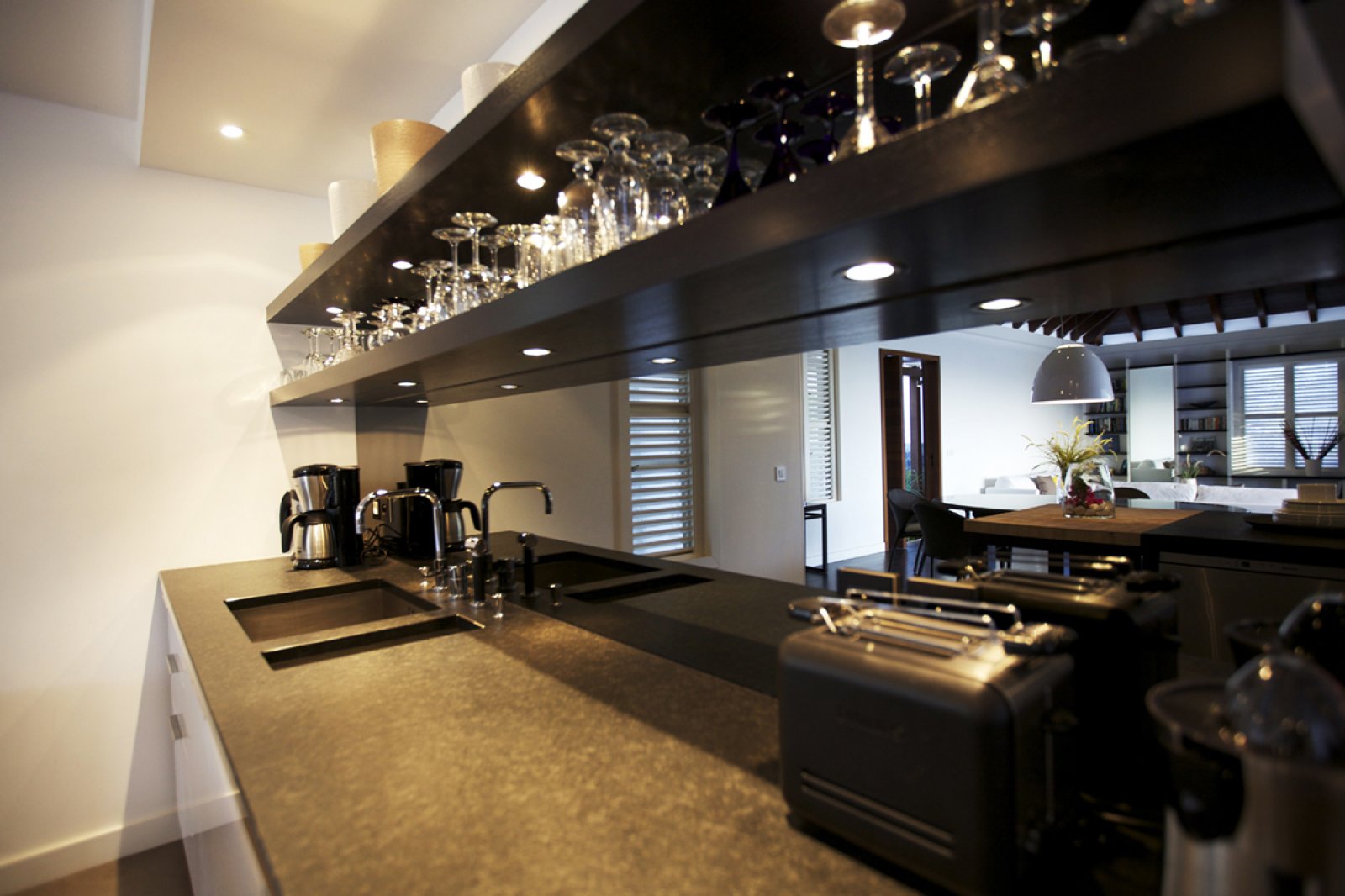 The modern kitchen, dining and living areas are decorated in a chic and cozy style, and open onto the heated pool and the deck with its breathtaking ocean view. The master bedroom and the second bedroom are situated on the same level at the pool, whereas the third bedroom is on the lower level with garden view.