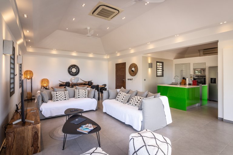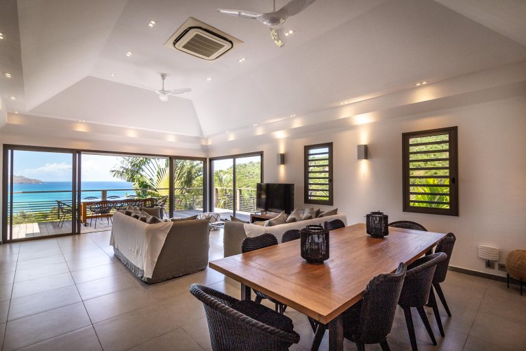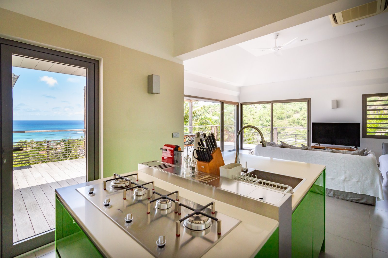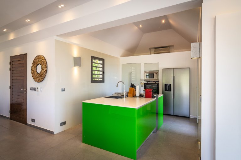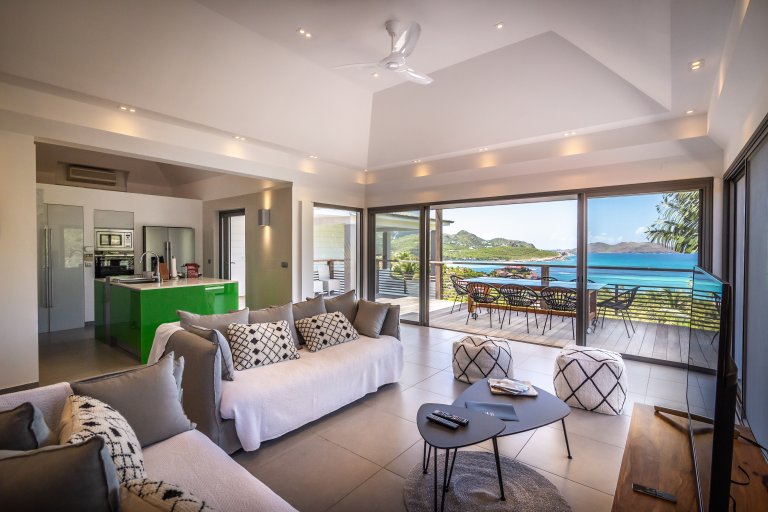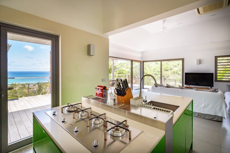 Even though it’s an audacious experiment in design with a lime green kitchen island, Villa Phébus (PHB) is an imminently livable and relaxing home. The views over St. Jean Bay are tremendous, and the design makes the most of those vistas.