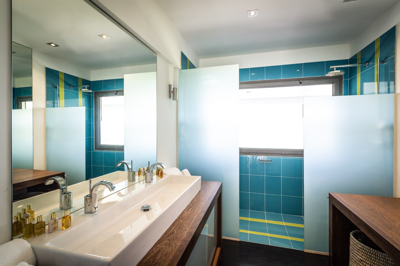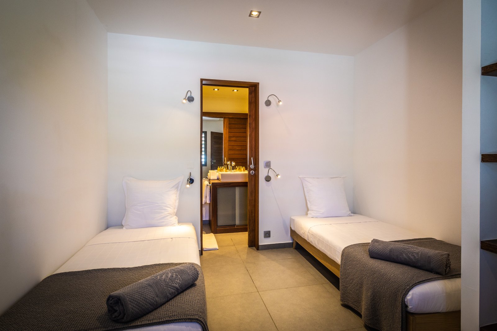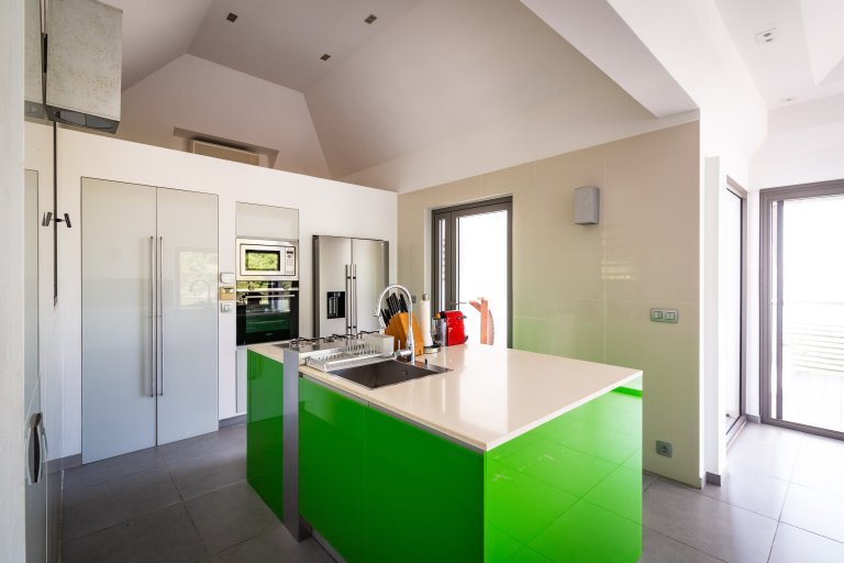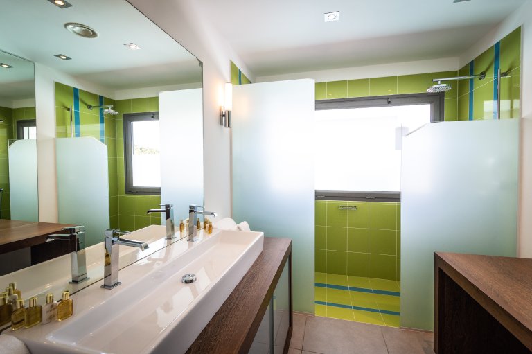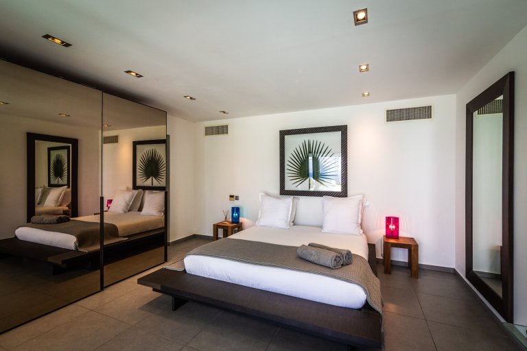 The master bedroom is on the lower level, by the heated swimming pool and terrace, along with two more bedrooms. One of these has two single beds making it a fun nest for children. The other bedrooms are dressed in shades of gray and have sleek, minimalist furnishings and large, mirrored closets. Upstairs is a fourth, more private bedroom with access to the terrace that has views in two directions. Like the master bedroom, it has a spacious bathroom and two-headed shower.