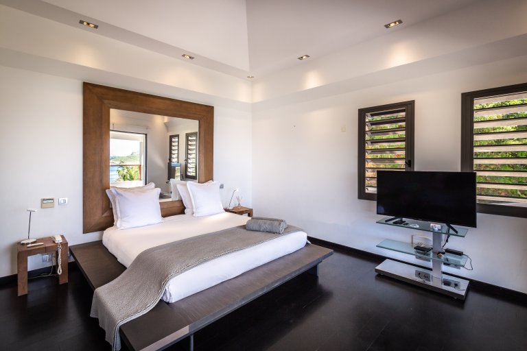The villa unfolds across two levels, with everything facing the sea. The upper level comprises a living area as well as the gourmet kitchen. (Concierges can arrange for additional comforts ranging from pre-stocked wine cellars to local chefs giving master classes.)