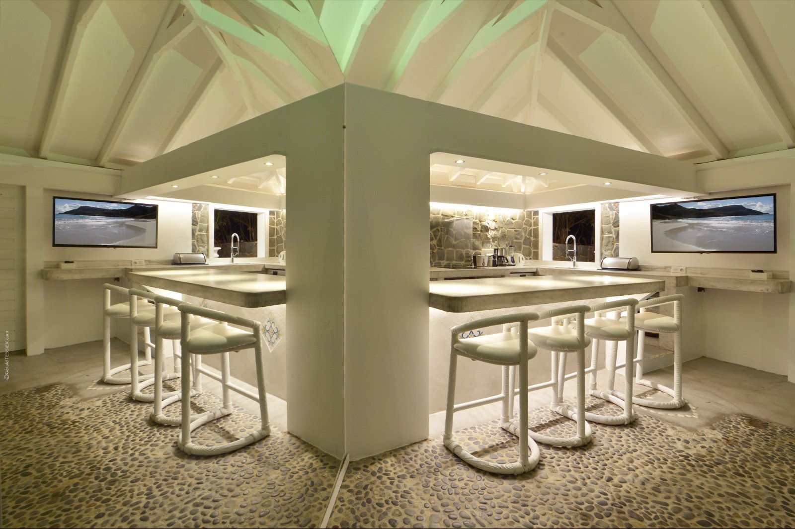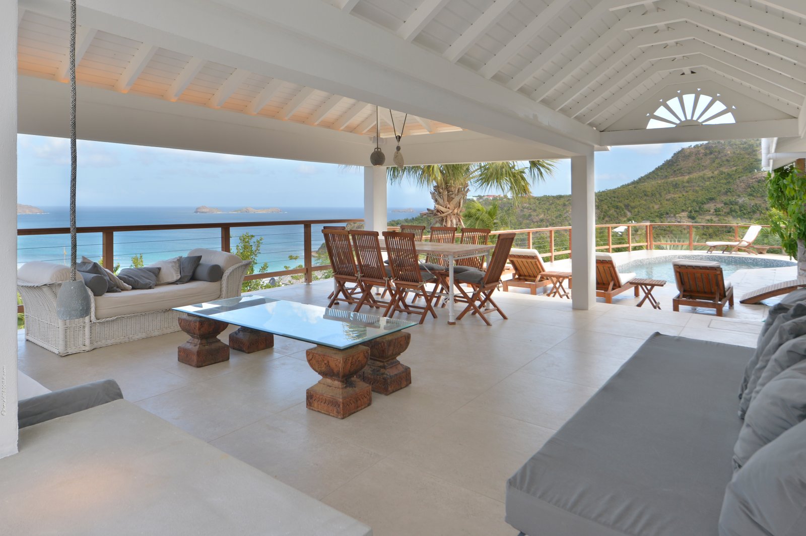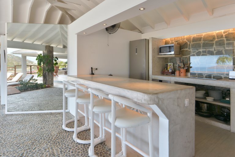 The kitchen, with its island and breakfast far, is also open-air, covered but with no wall between it and the pool terrace. The pool and some lounge chairs are on the sunny, uncovered part of the terrace. These have the best view over the blue bay.